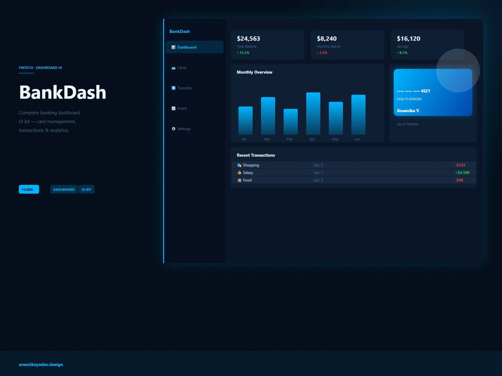 Complete dashboard UI kit for a banking platform — card management, transactions, investment tracking, and expense analytics with clean data visualization.