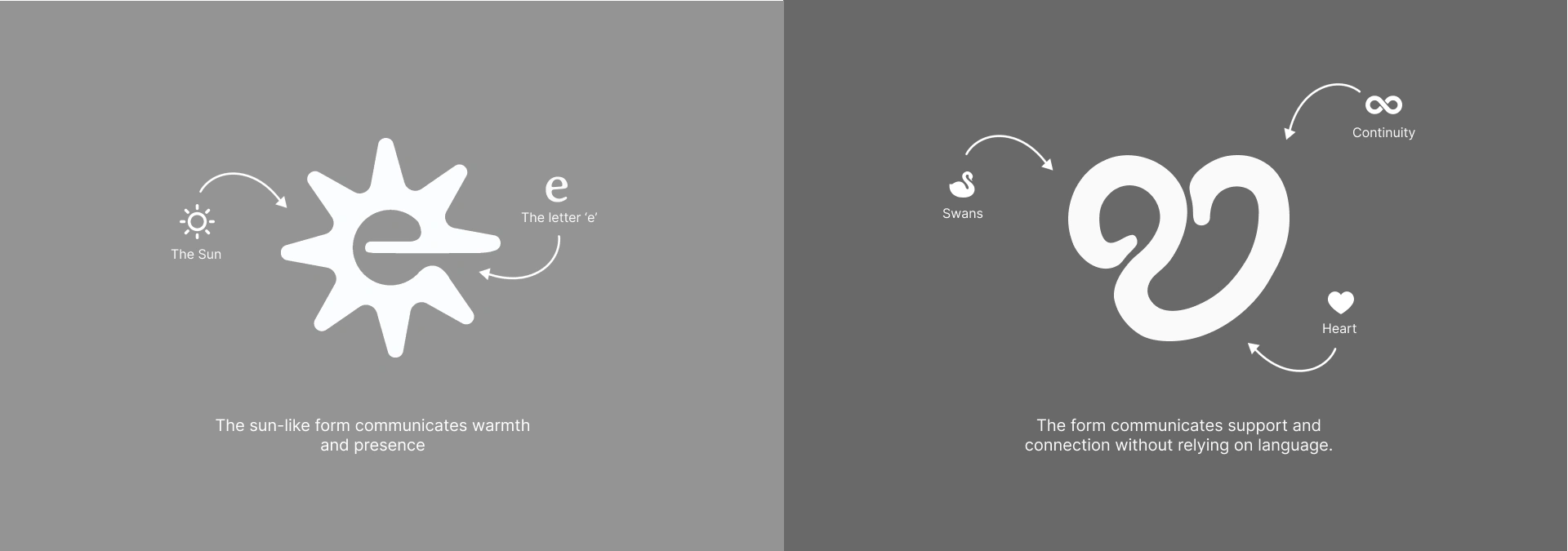 About the mark : The mark is a unified symbol formed from three interconnected ideas: a heart, an infinity loop, and a swan. The heart represents care, empathy, and emotional connection at the core.The infinity form communicates continuity, long-term presence, and ongoing support. The swan adds a layer of calm, trust, and grace, reinforcing a sense of reassurance. Together, these elements resolve into a single, fluid shape that feels emotionally grounded.