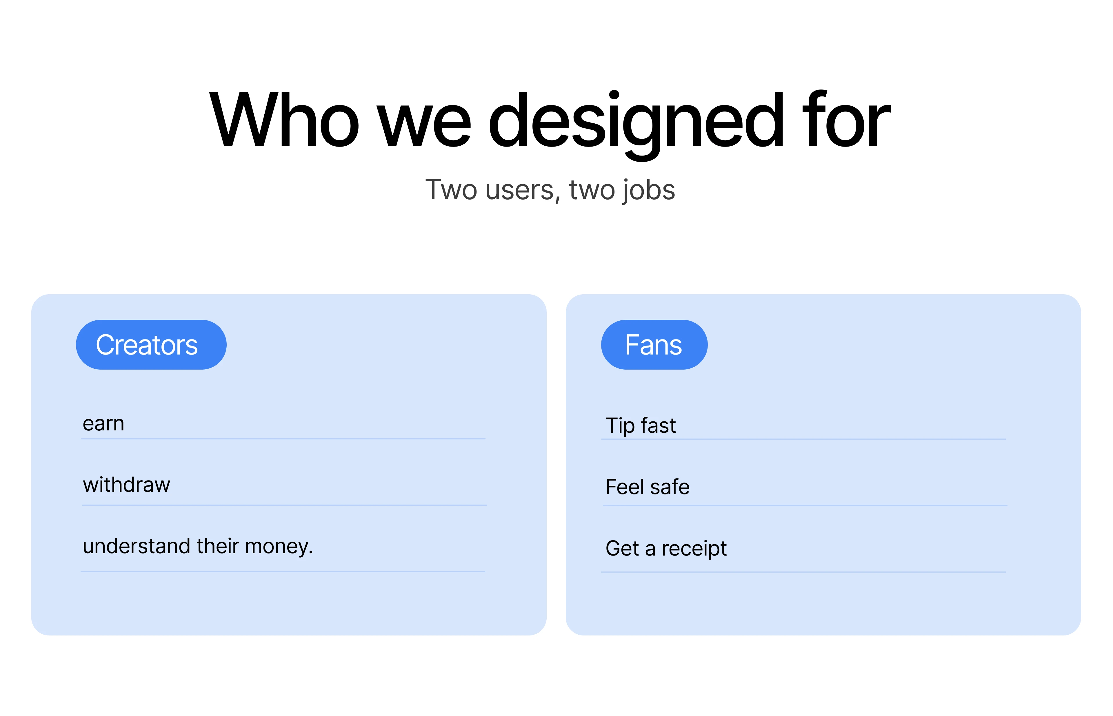 Payments, identity, and platform safety don’t like shortcuts. The hardest part wasn’t UI, it was making the money + trust experience feel simple for creators and fans. We designed flows that read like a conversation.