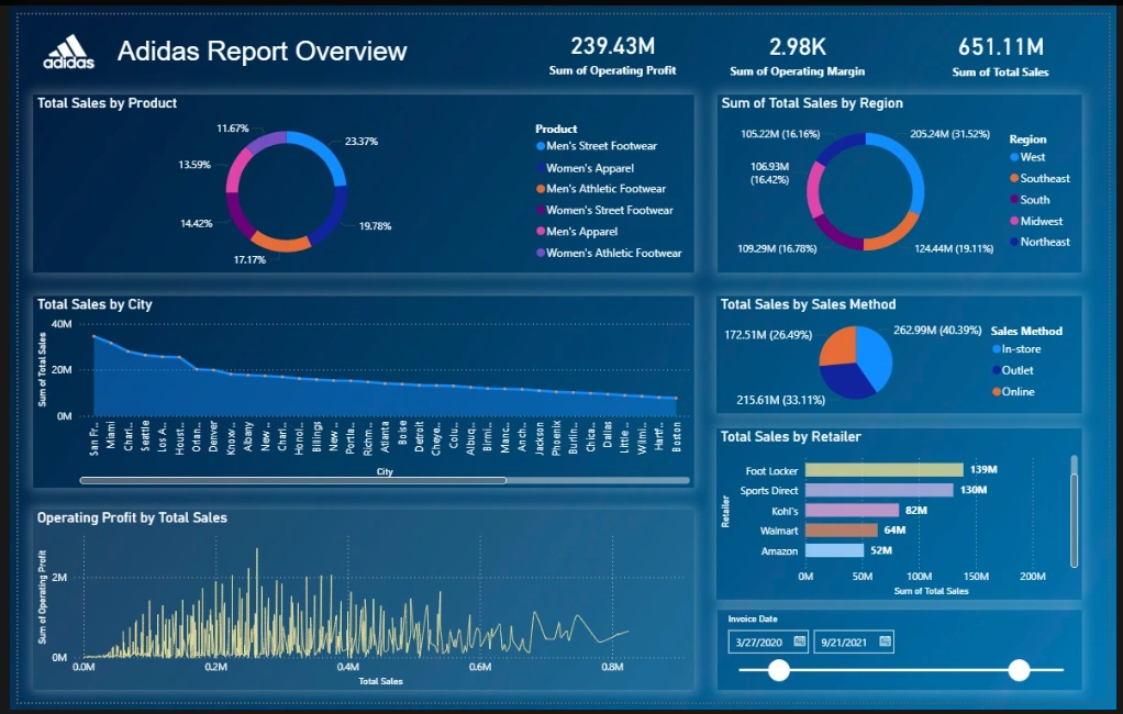 Developed a sample interactive Power BI dashboard for Adidas sales performance, providing insights into total sales, operating profit, and margins.