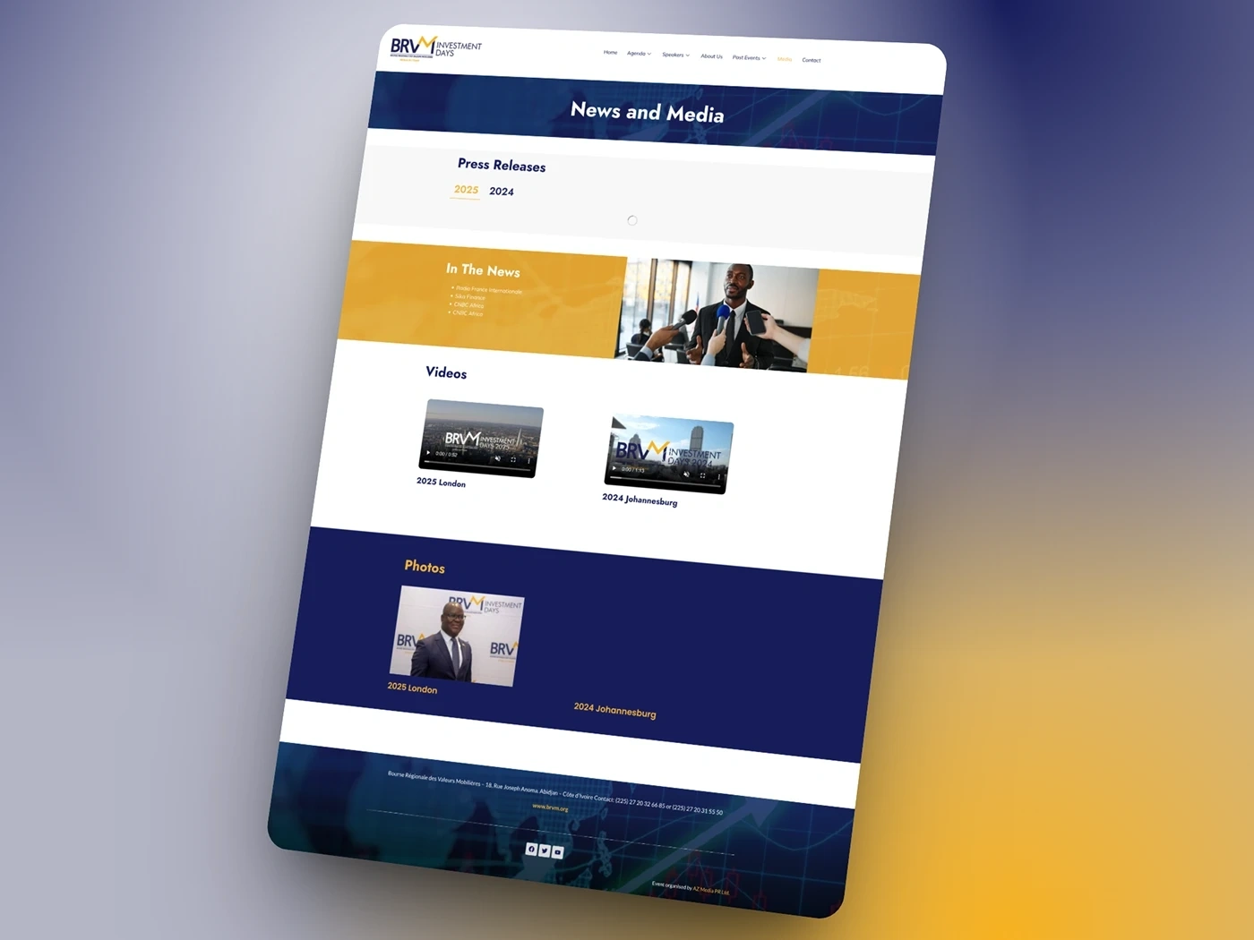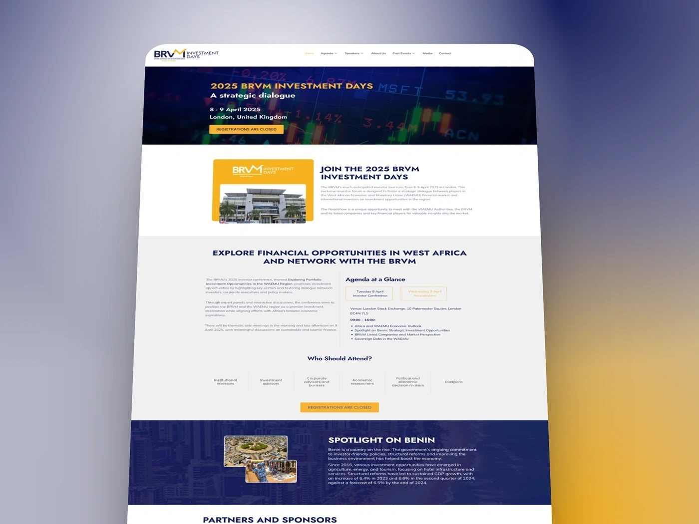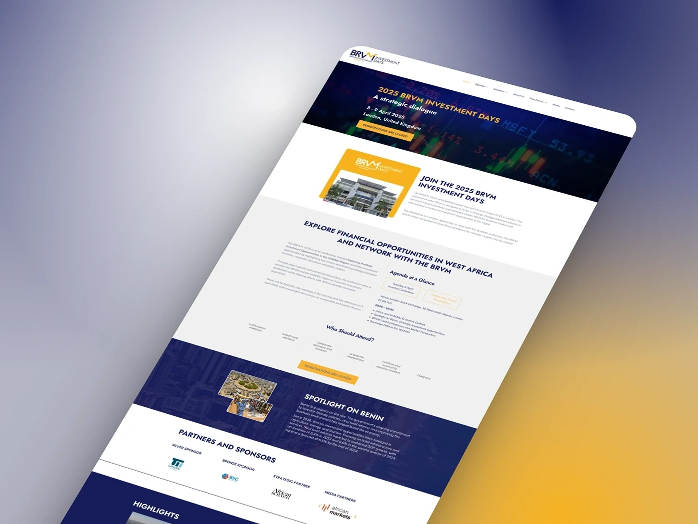I designed and built the event website using WordPress and Elementor, creating a sleek, professional digital presence that matched the high-stakes investment forum hosted by the Bourse Régionale des Valeurs Mobilières (BRVM). The project included crafting a clear information architecture, designing responsive UI layouts for registration and event agenda sections, and embedding performance- and SEO-optimized elements (clean URLs, optimized images, responsive design) to support international visibility.