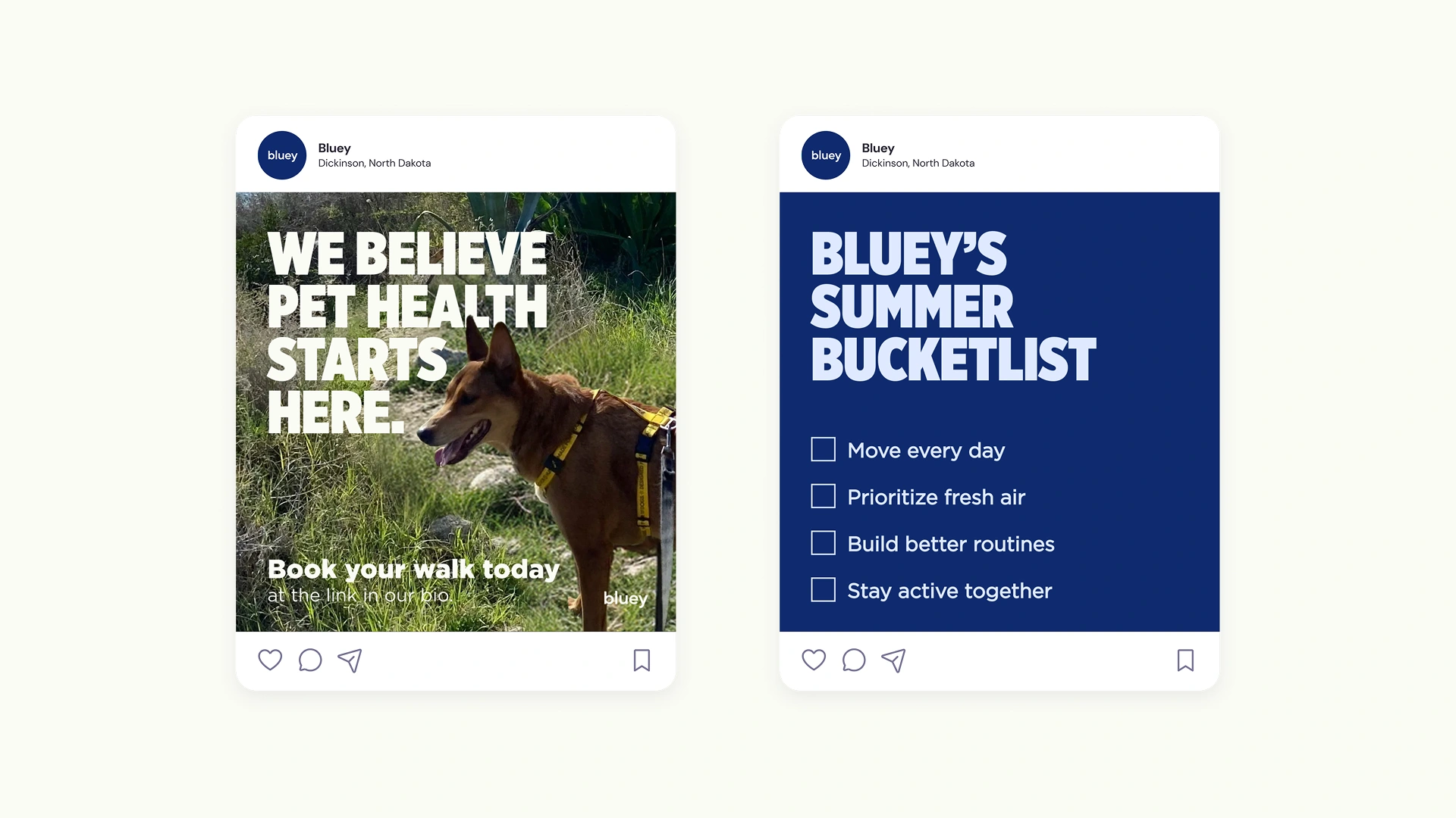 Bluey approached WYER with a simple goal: to launch a dog-walking business with the ambition to grow beyond its initial scope. Through our discovery and strategy process, WYER identified a larger opportunity—one that extended past services and into long-term brand equity. We developed a complete brand concept centered on pet wellness, reframing Bluey not as a transactional dog-walking service, but as a partner in building healthier, more intentional lives for pets.