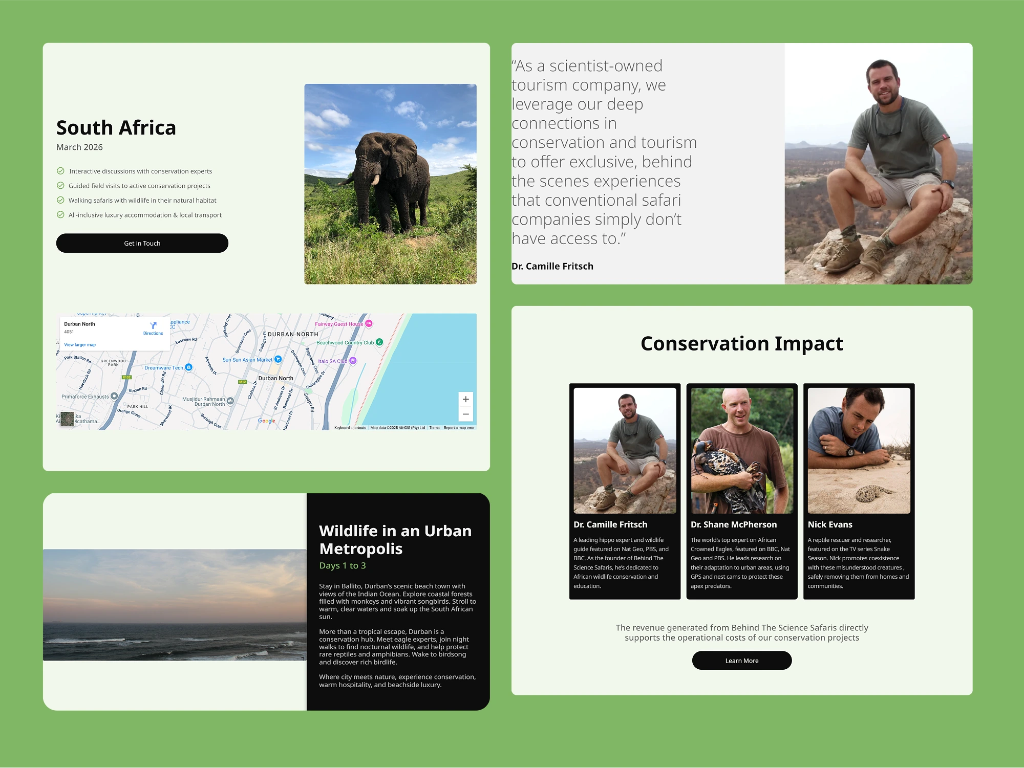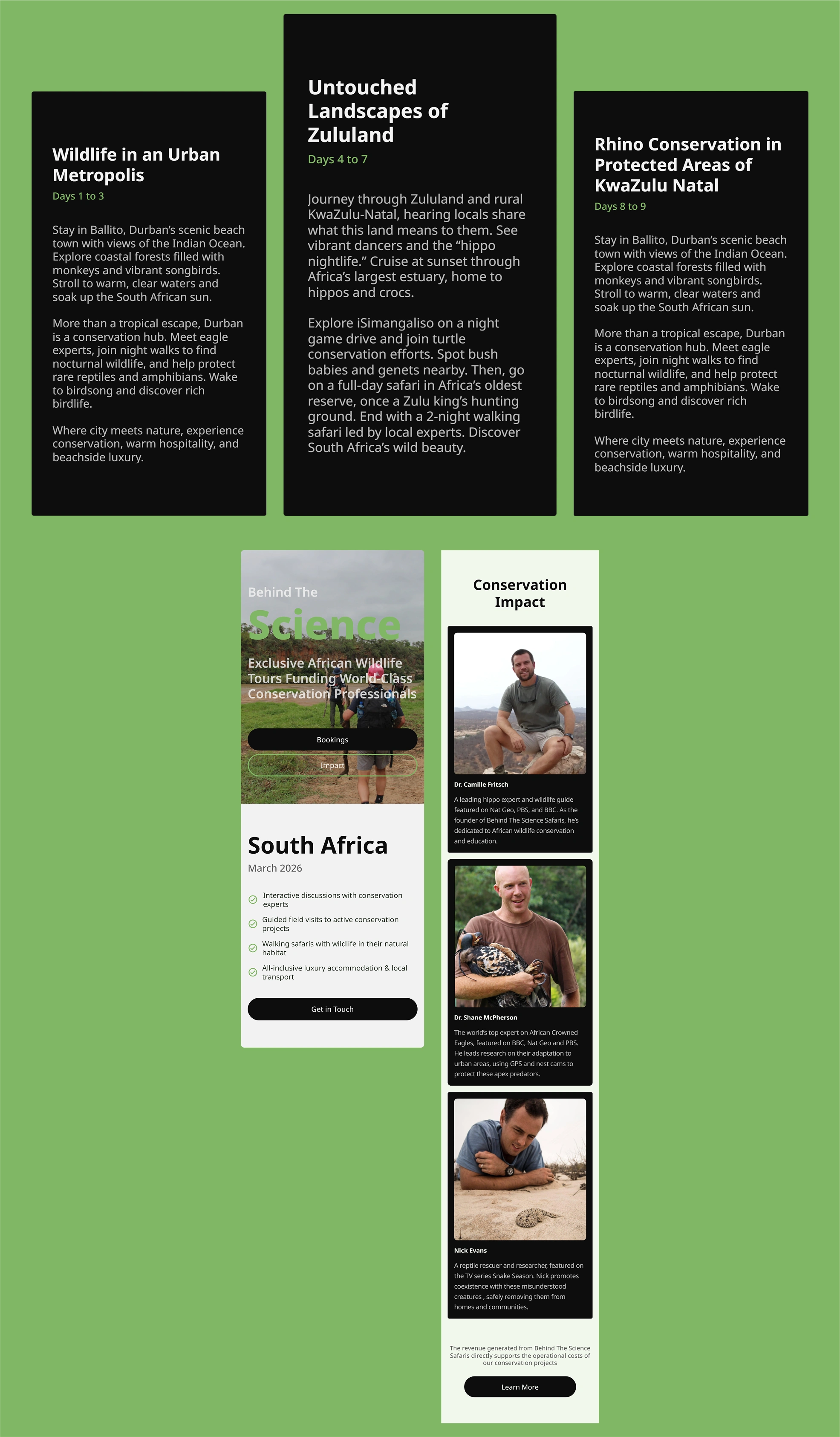 Understanding Business Requirements and Target Users: I met with Camille and Cole to discuss their background as conservationists and tour guides and to understand the context of this project. Their aim is to use the revenue from the tours to raise funds for the operational costs of their conservation projects in Africa. The target user persona is a wealthy American who wants to go on a luxury safari to Africa while also getting a unique behind the scenes perspective into the scientific research aspect of the conservation projects and sites visited during the safari trip.