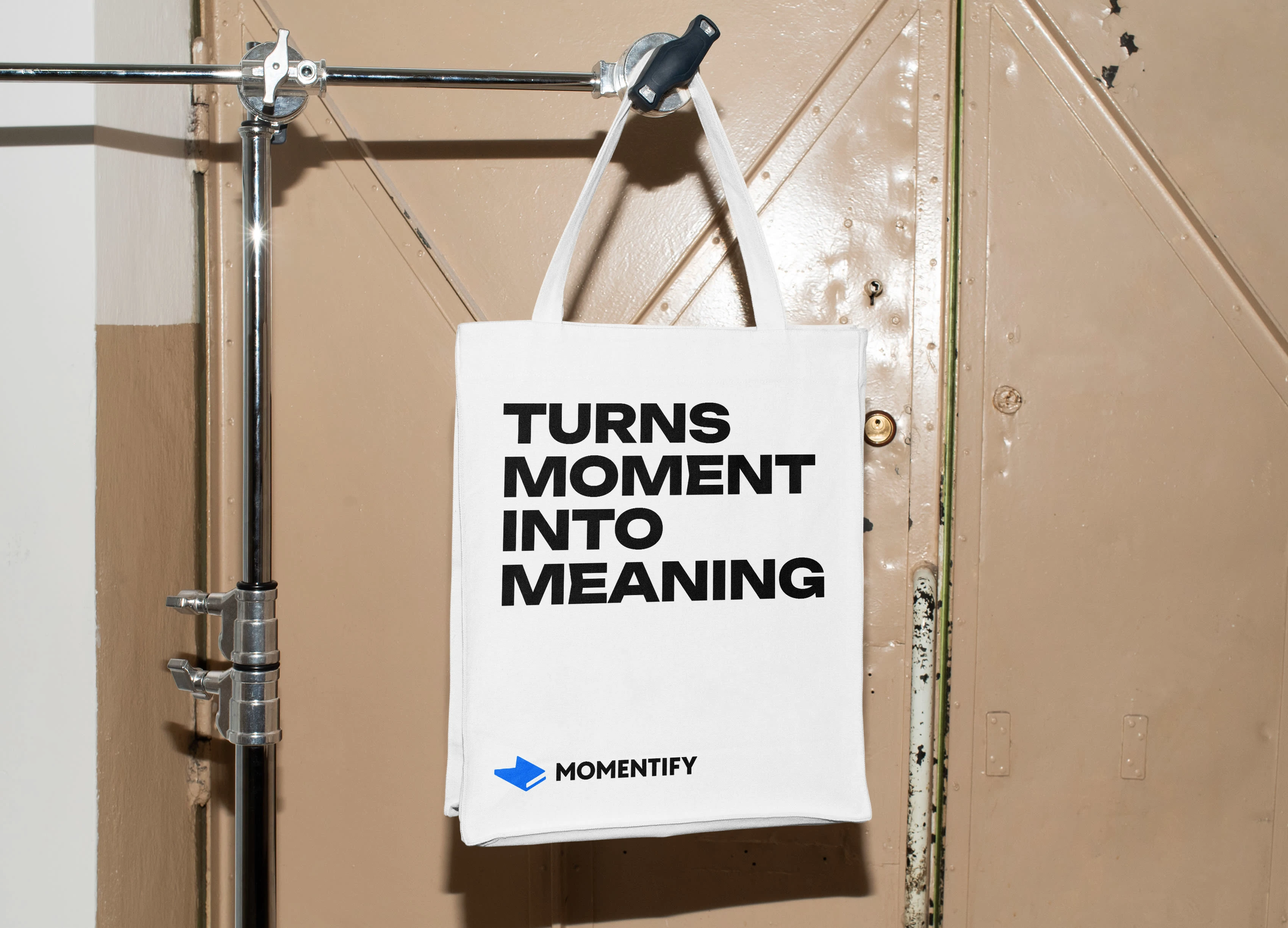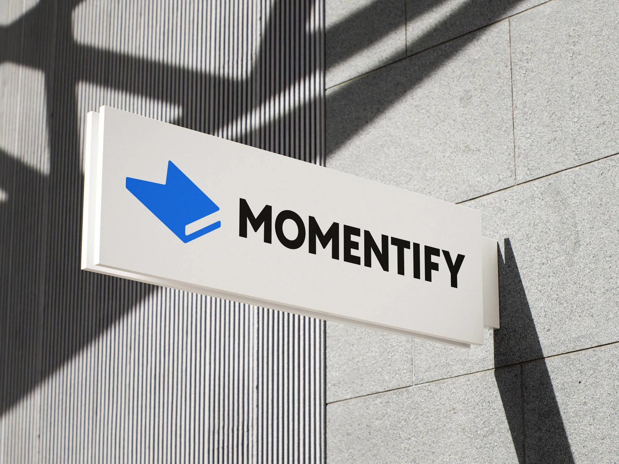 Momentify's brand logo merges the letter 'M' with a book shape designed in an isometric style to evoke energy and depth. The visual identity and bold color palette reflect Momentify's spirit of expressing creativity with energy and optimism while connecting people through shared stories.