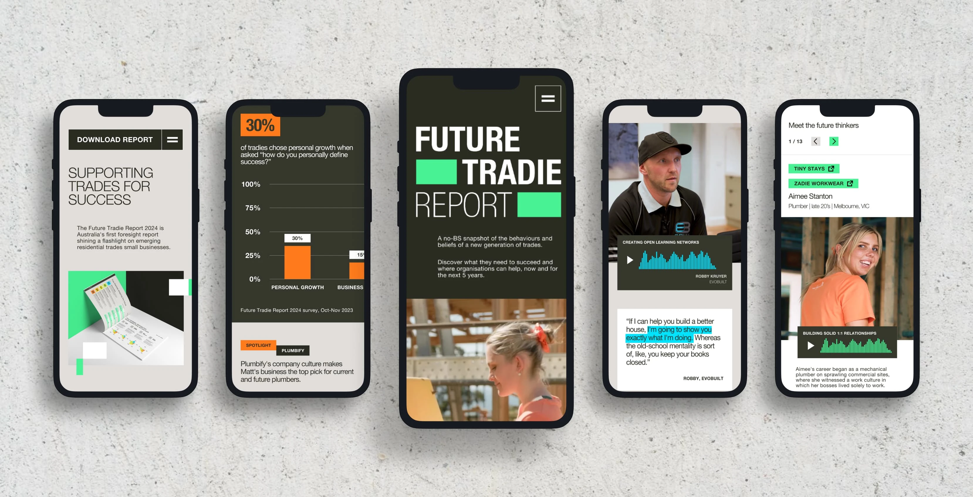 The Future Tradie Report is Australia’s first foresight report shining a light on emerging residential trade small businesses. I designed the digital experience and contributed to the brand identity, and assisted in the Webflow development.