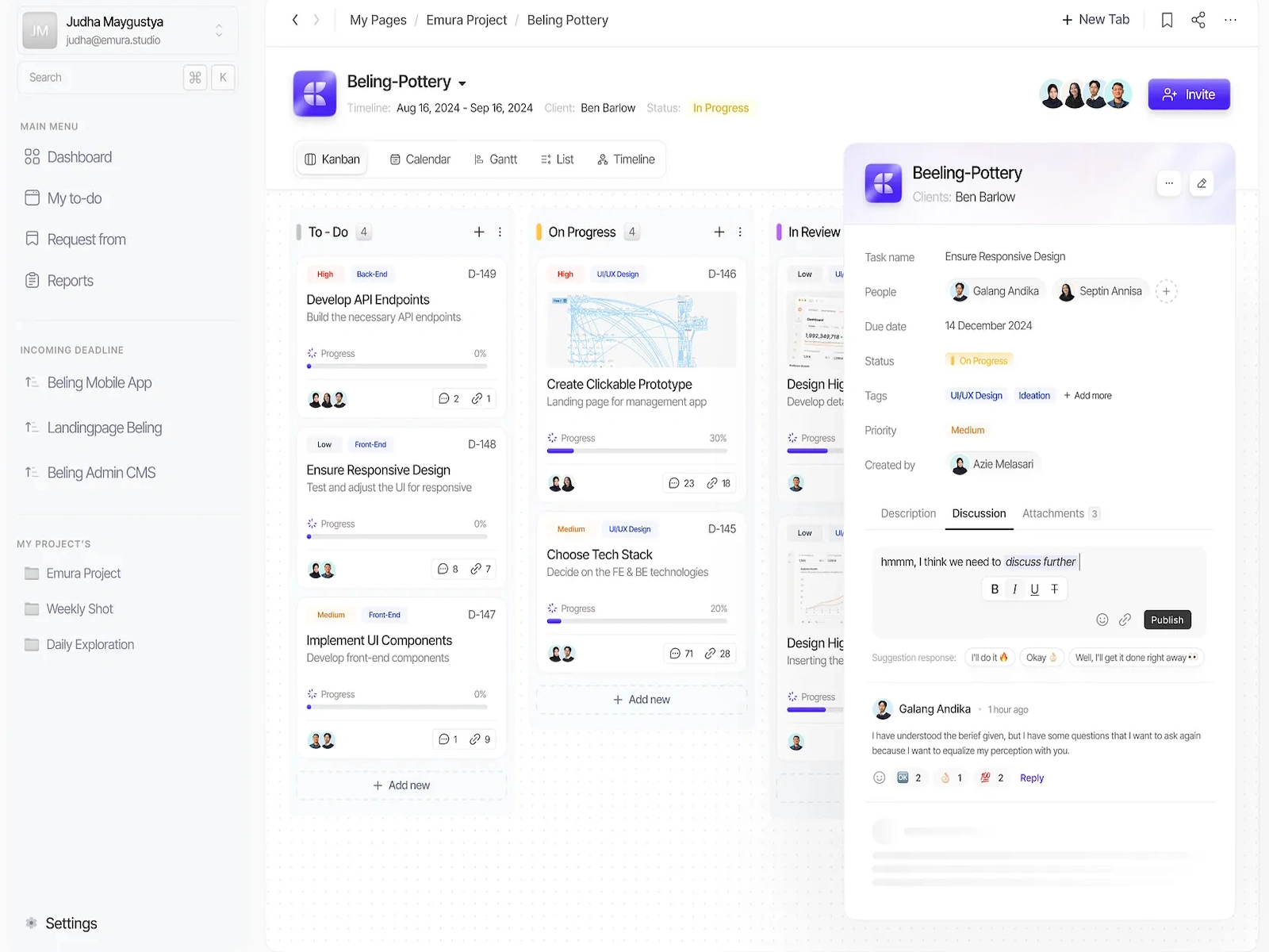 Time Tracking & Collaboration: It features a simple start/stop timer to track work and a section for team members to add comments.
