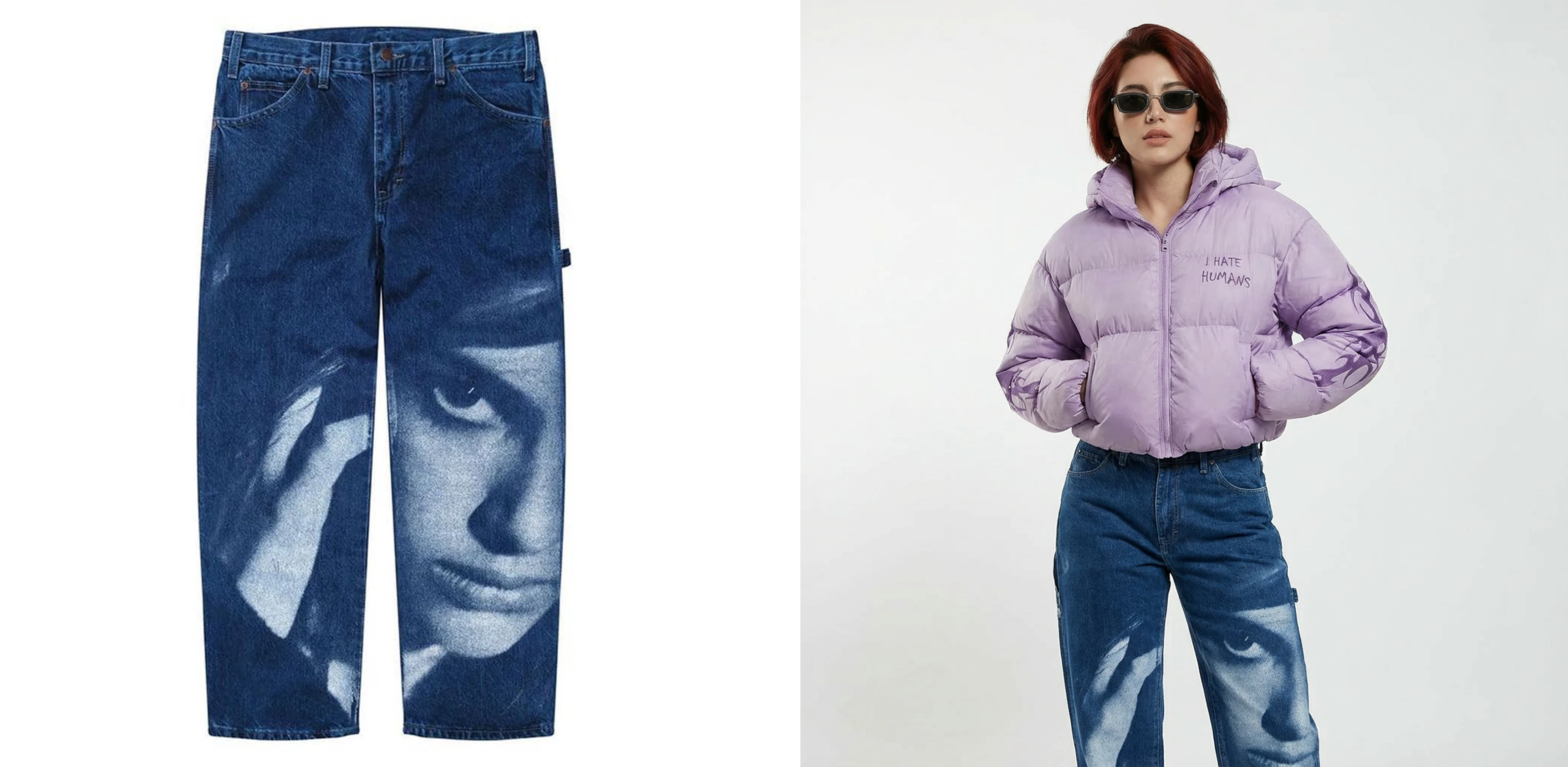 Found denim jeans with a face print design online