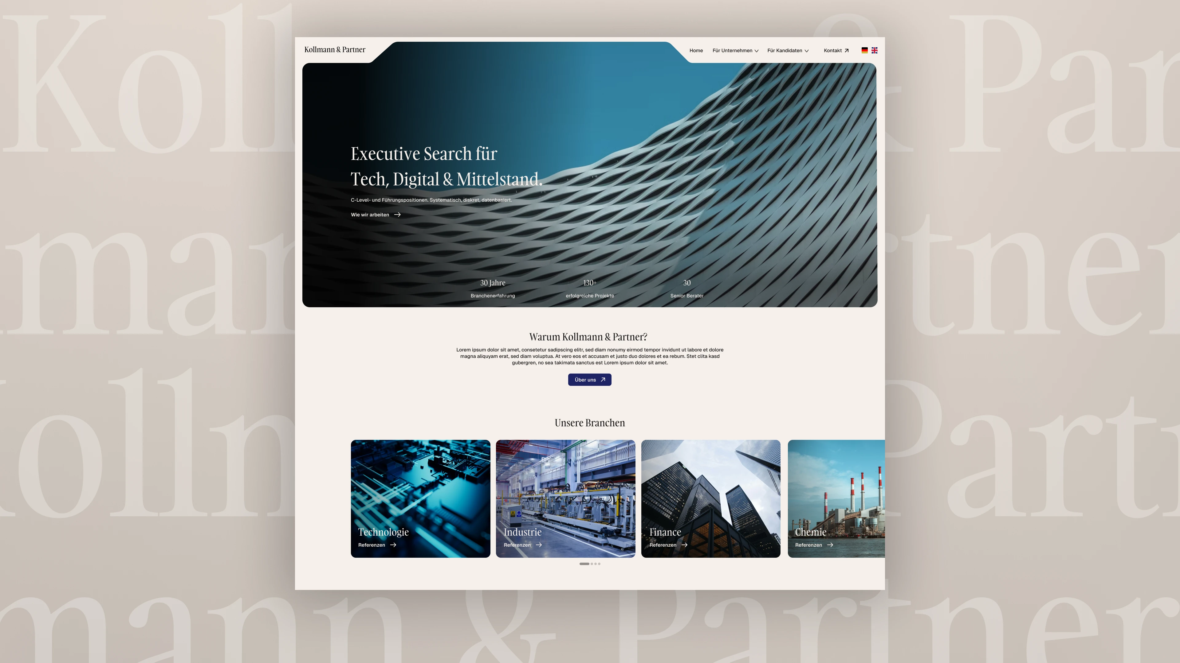Kollmann & Partner is a pattern case for boutique HR-related companies. Focusing on conveying trust, expertise and tradition, this concept blends modern elements with traditional serif fonts and a subdued yet elegant color palette.