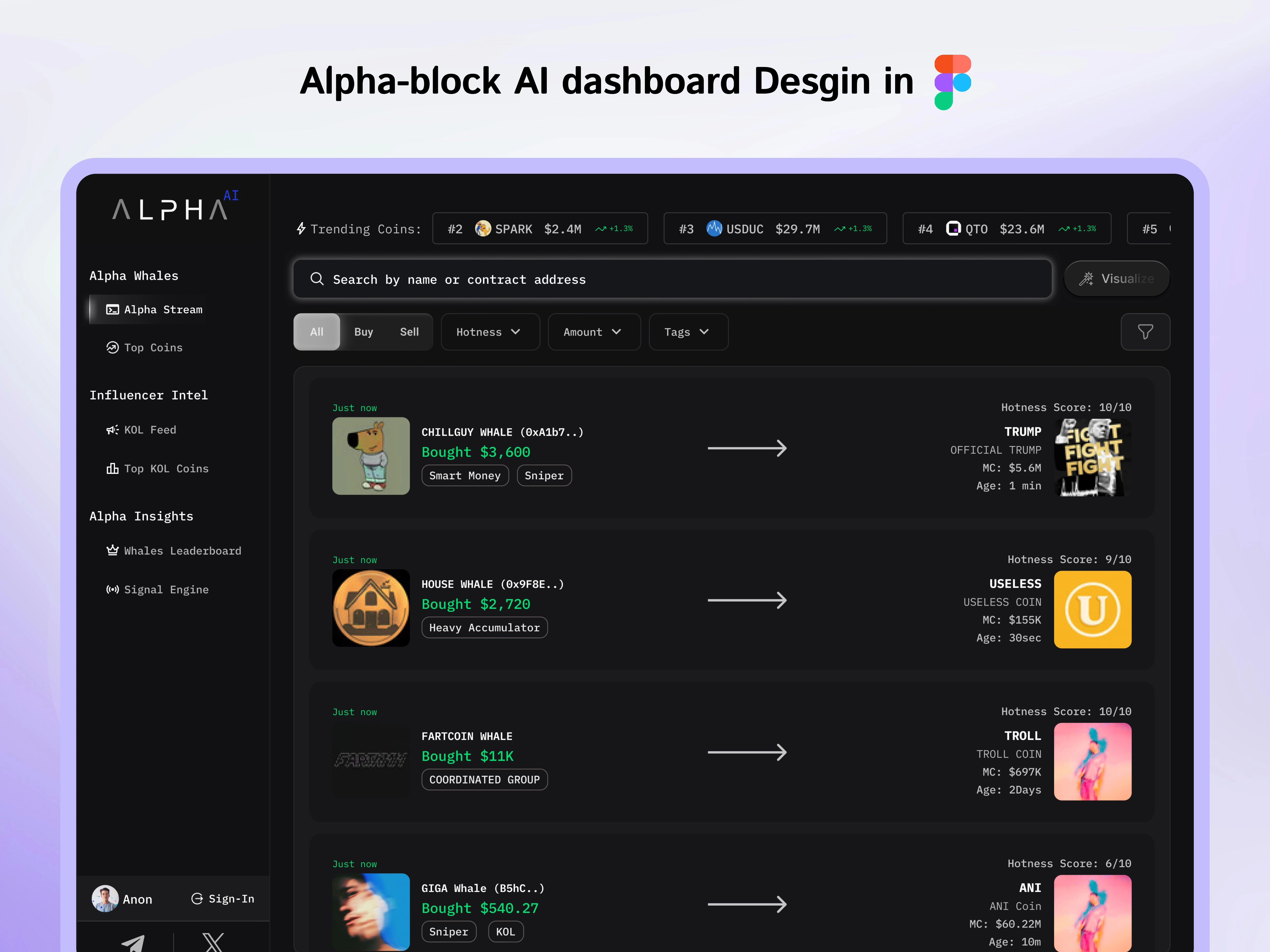 AlphaBlock AI App is a real-time memecoin intelligence platform that tracks whale transactions, influencer (KOL) activity, and on-chain signals through a clean, data-rich dashboard. It helps traders discover early alpha and make faster, smarter trading decisions.