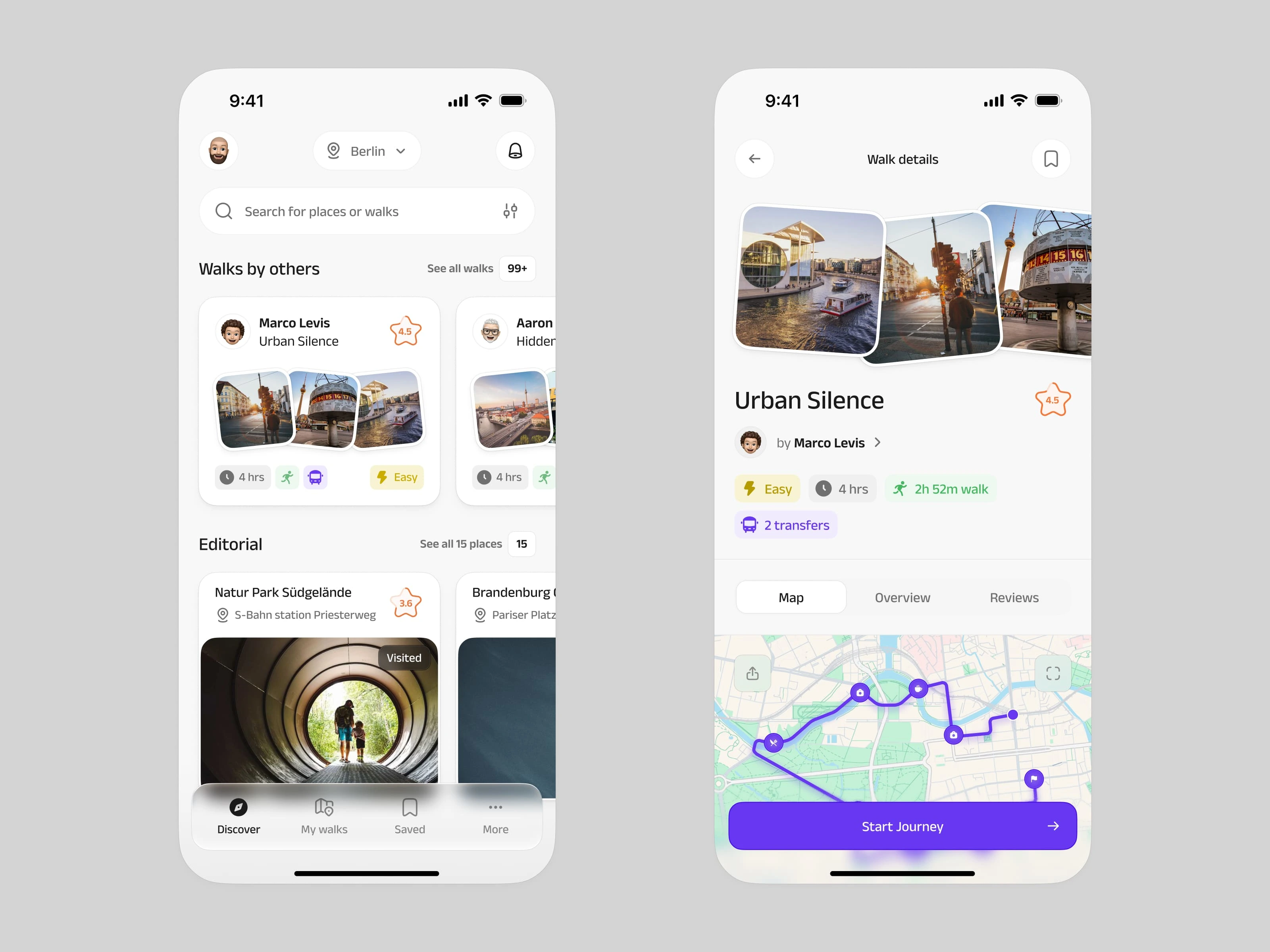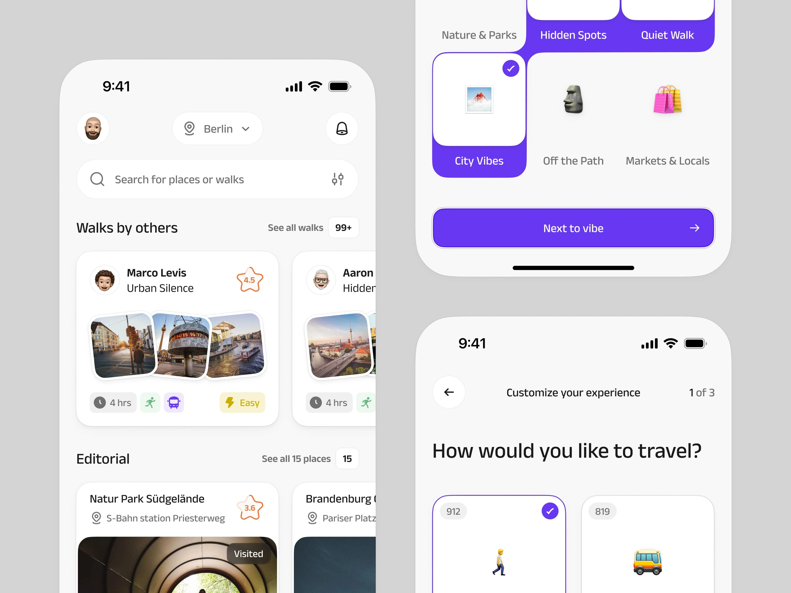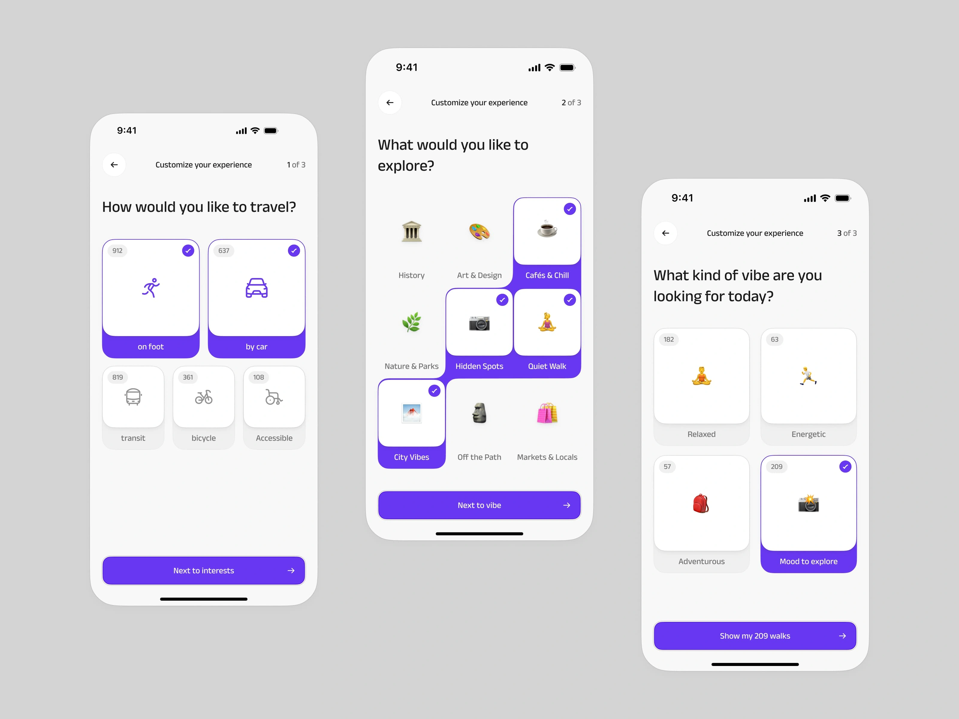 To enhance user experience, I also explored onboarding screens that help personalize the app from the start. By selecting their preferred mode of travel, favorite topics, and walking style, users get route suggestions tailored to their mood and lifestyle — whether it's peaceful nature walks, culture-packed routes, or spontaneous city strolls.