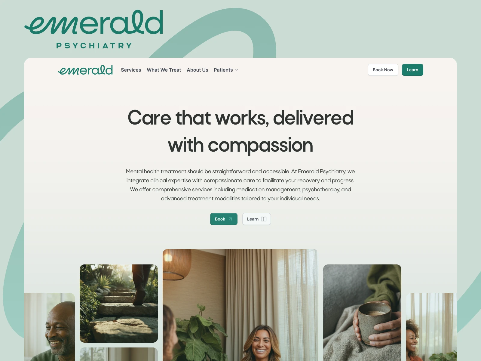 My Approach: I worked mostly within the existing wireframe structure to build a visual identity that feels warm, trustworthy, and clinical without being cold. This was important, since the design is for a medical client. The palette centers on a deep teal green paired with soft neutrals and warm photography, reinforcing the brand's emphasis on compassion and human connection. We leveraged a custom script wordmark for "emerald" in the footer as a distinctive brand touch, and used generous whitespace and rounded imagery to keep the experience approachable across every breakpoint.