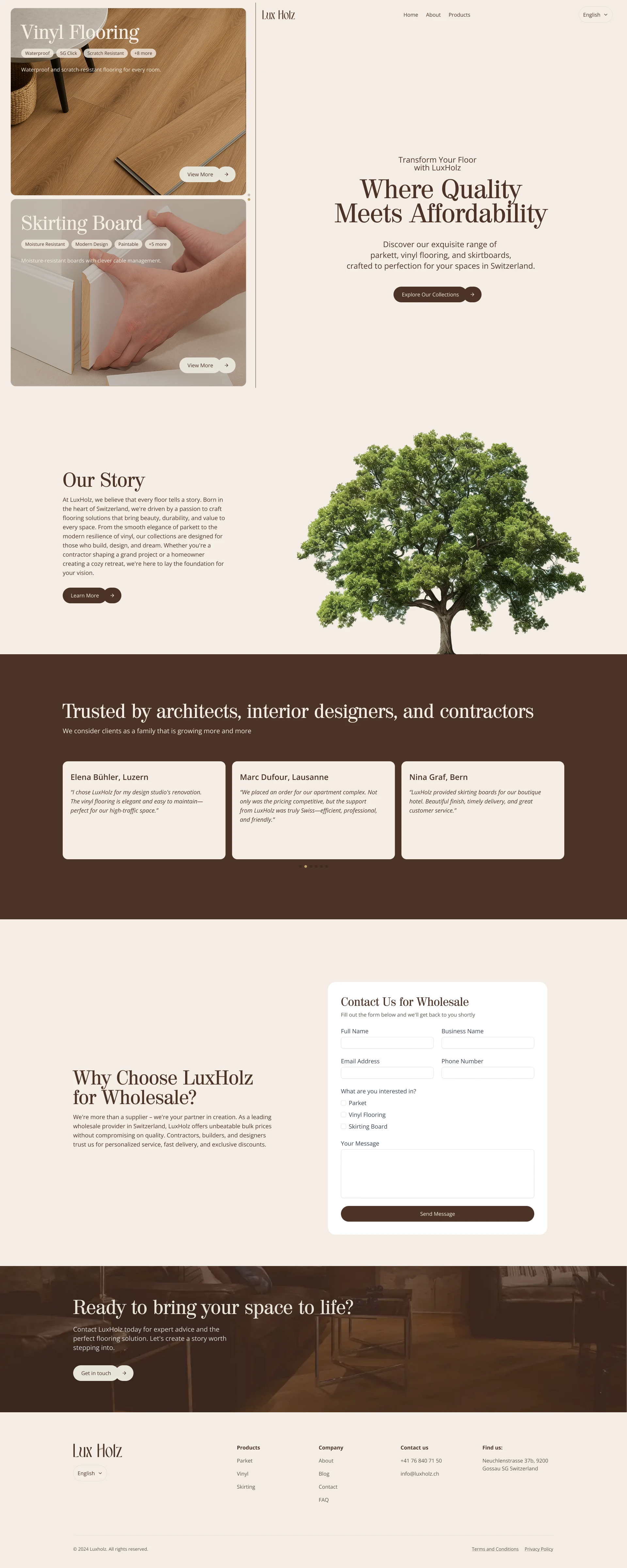 A complete design and development project for Luxholz, a Swiss brand specializing in premium wood products. Delivered both the customer-facing website and a custom admin panel for stock and product management, ensuring smooth business operations and a high-end online presence.