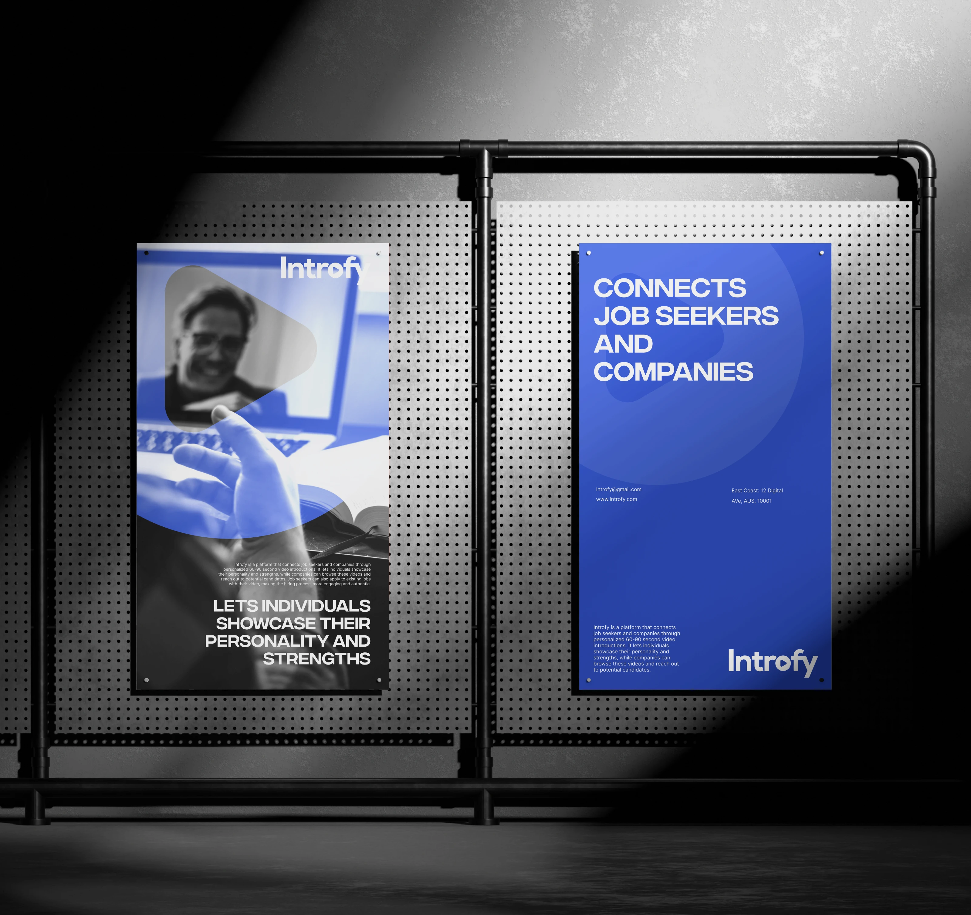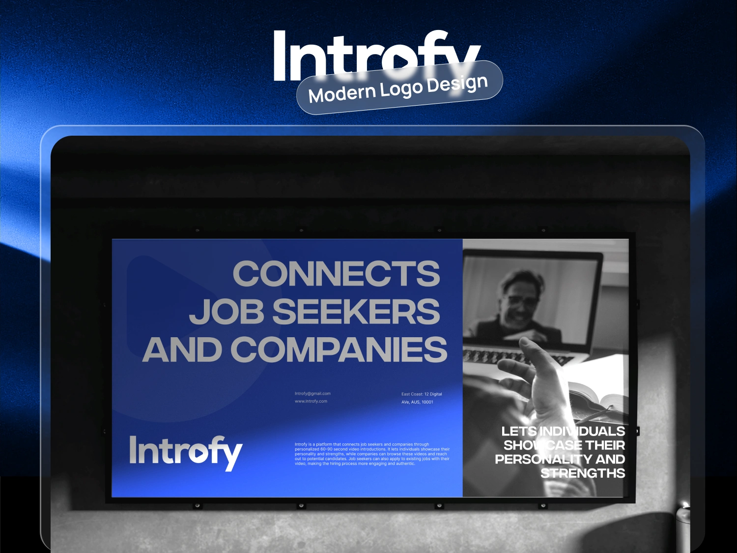 A strong, confident brand identity built around bold typography, high contrast colors, and clean visual rules. The identity positions Introfy as a modern, people-first hiring platform — professional enough for companies, yet expressive enough for individuals. The system is flexible, scalable, and designed to work seamlessly across apps, marketing, and future product expansions.