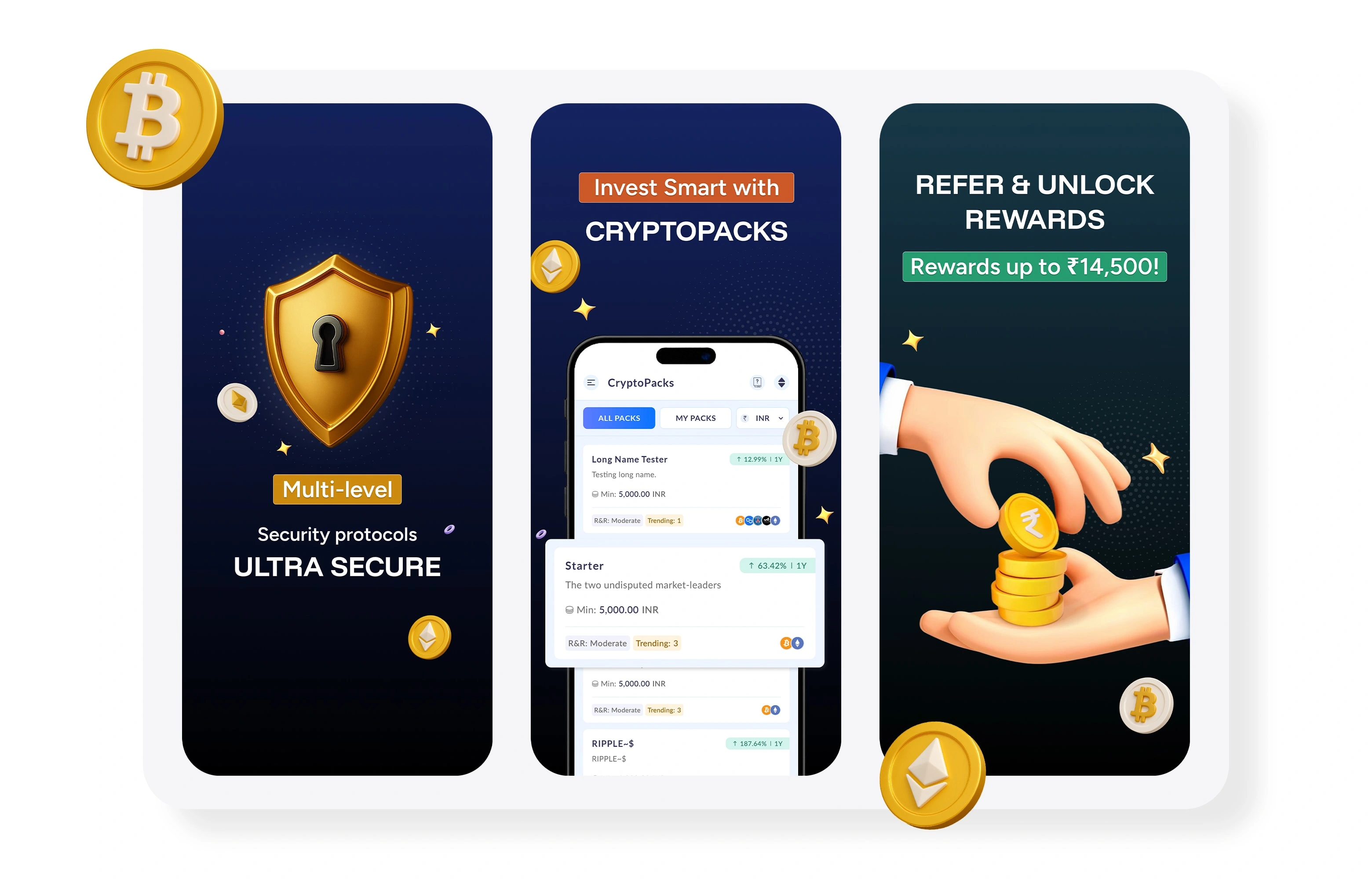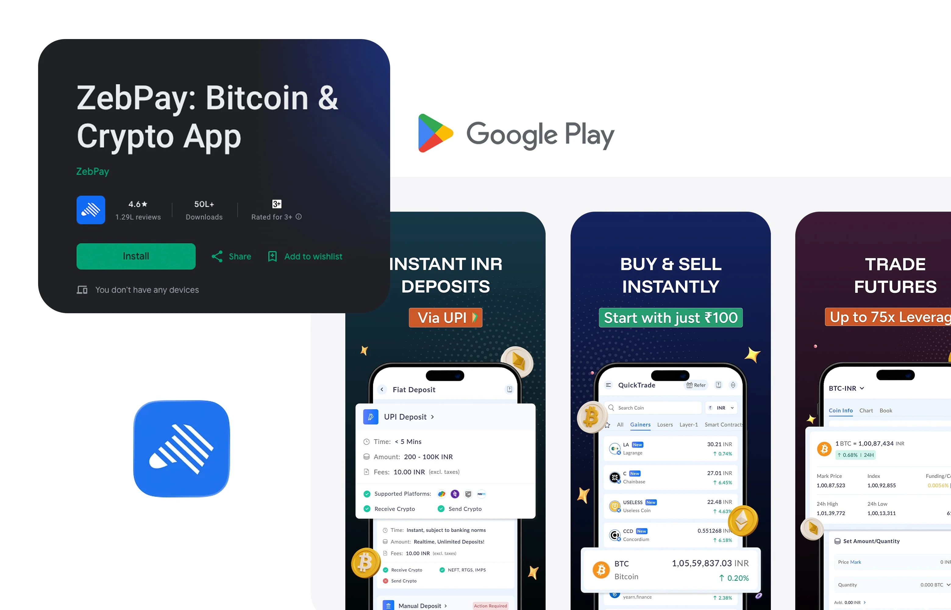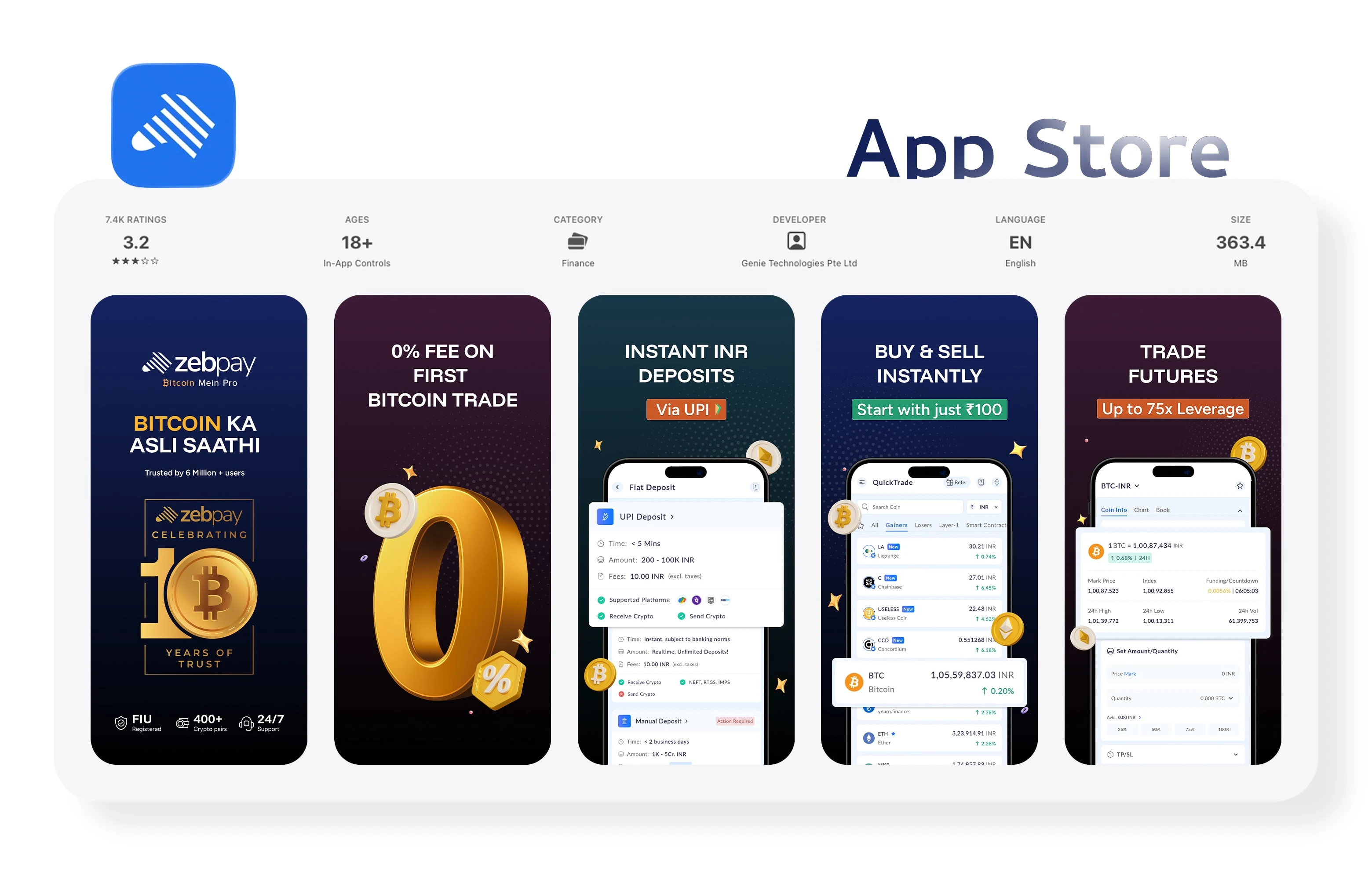 Designed App Store and Play Store visuals for ZebPay crypto app.