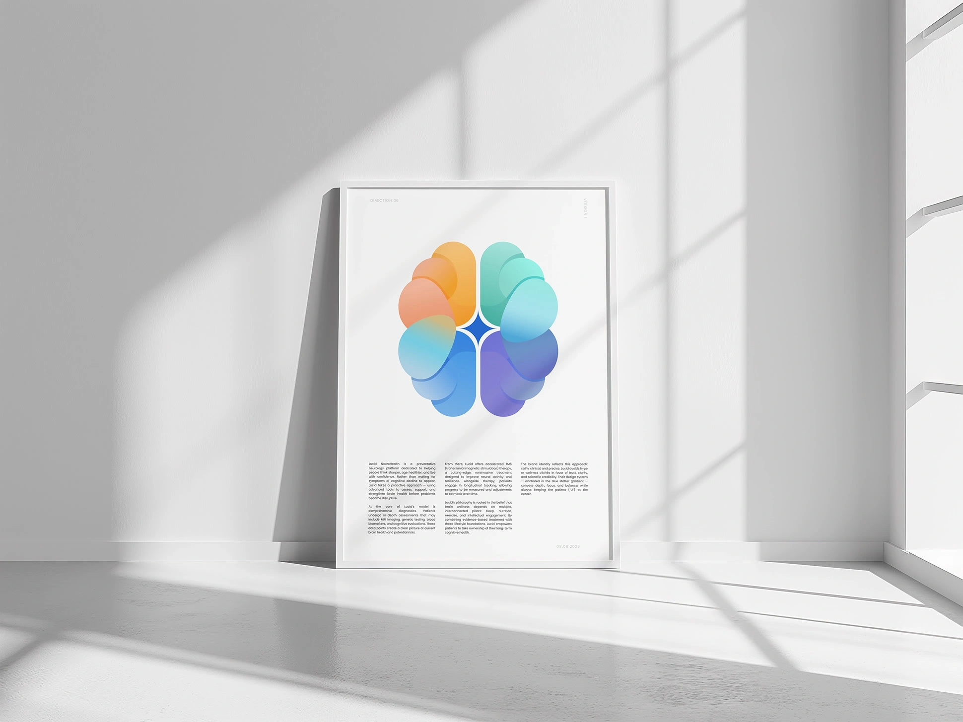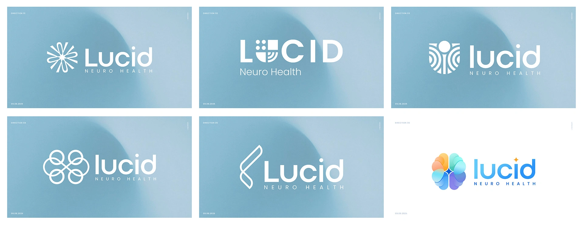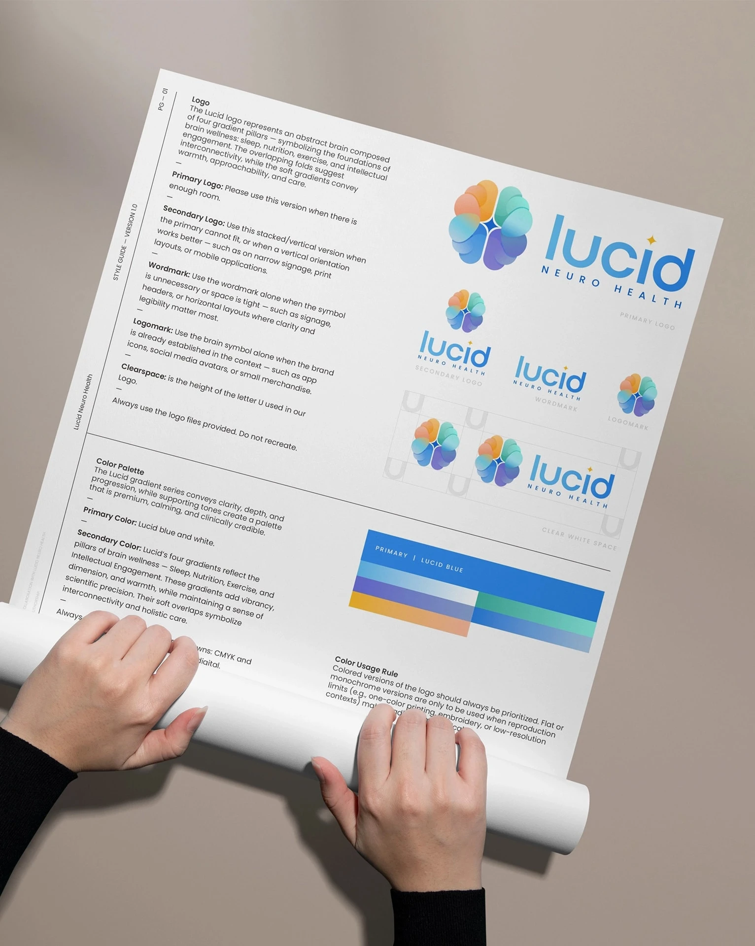The final identity is calm, premium, and distinctly Lucid. The brain icon — with its softly blending gradients and tactile finish — feels alive, a symbol of clarity, vitality, and the fluidity of the mind. Paired with a versatile type system and a focused style guide, the logo adapts seamlessly across digital platforms, print materials, and clinical environments. More than just a mark, it captures both the science and the humanity of Lucid Neuro Health. By emphasizing warmth, texture, and flow, the design stands apart from generic medical branding, reflecting their patient-first promise and their mission to help people live sharper, healthier, and more confident lives.