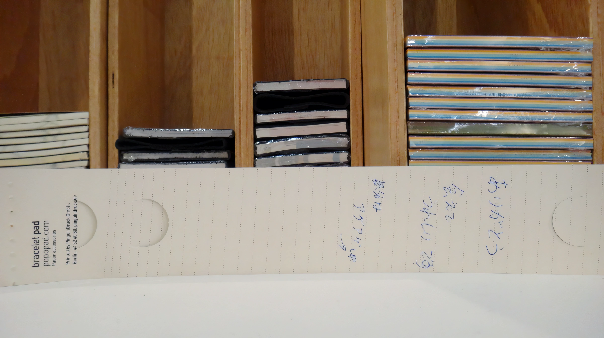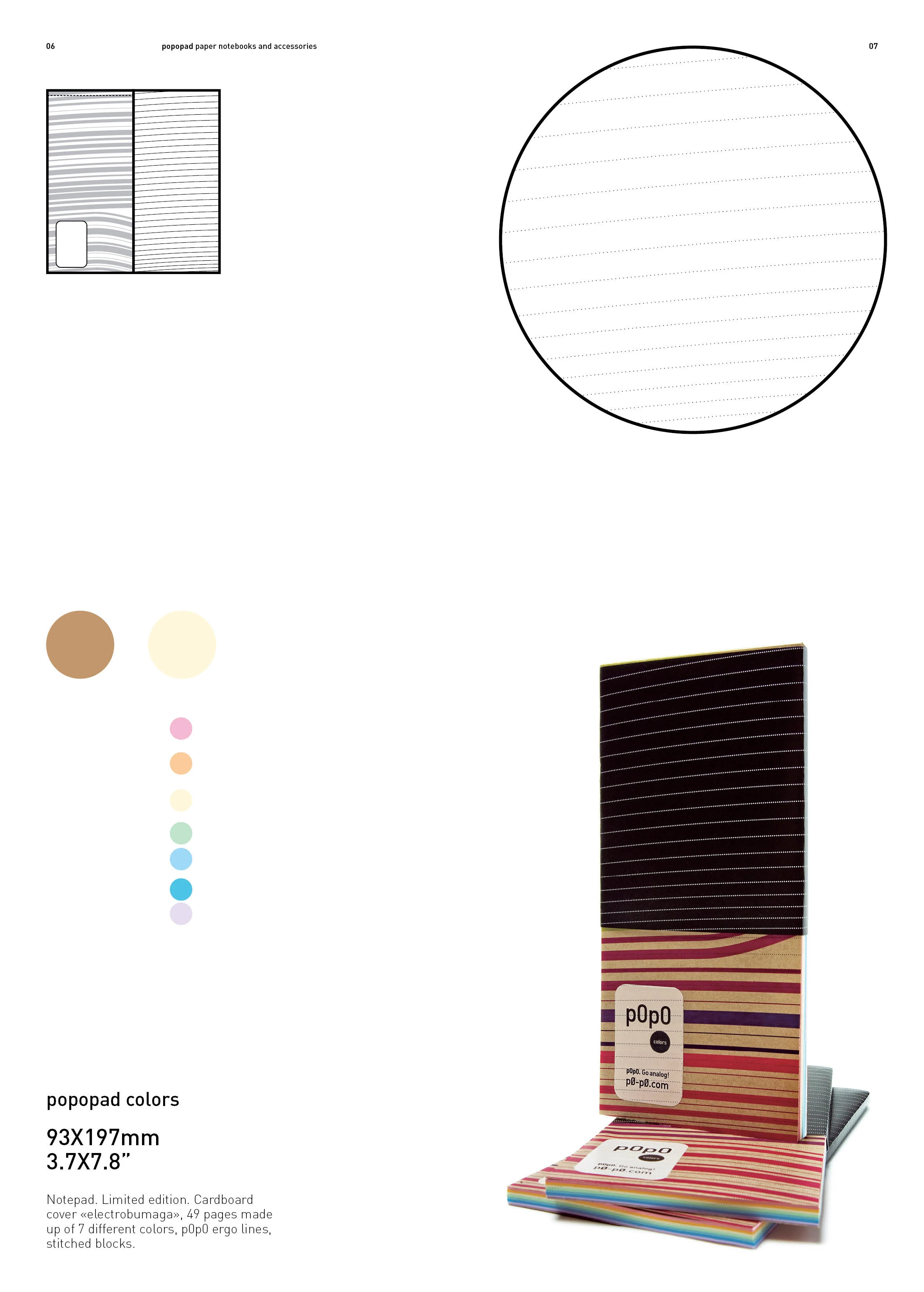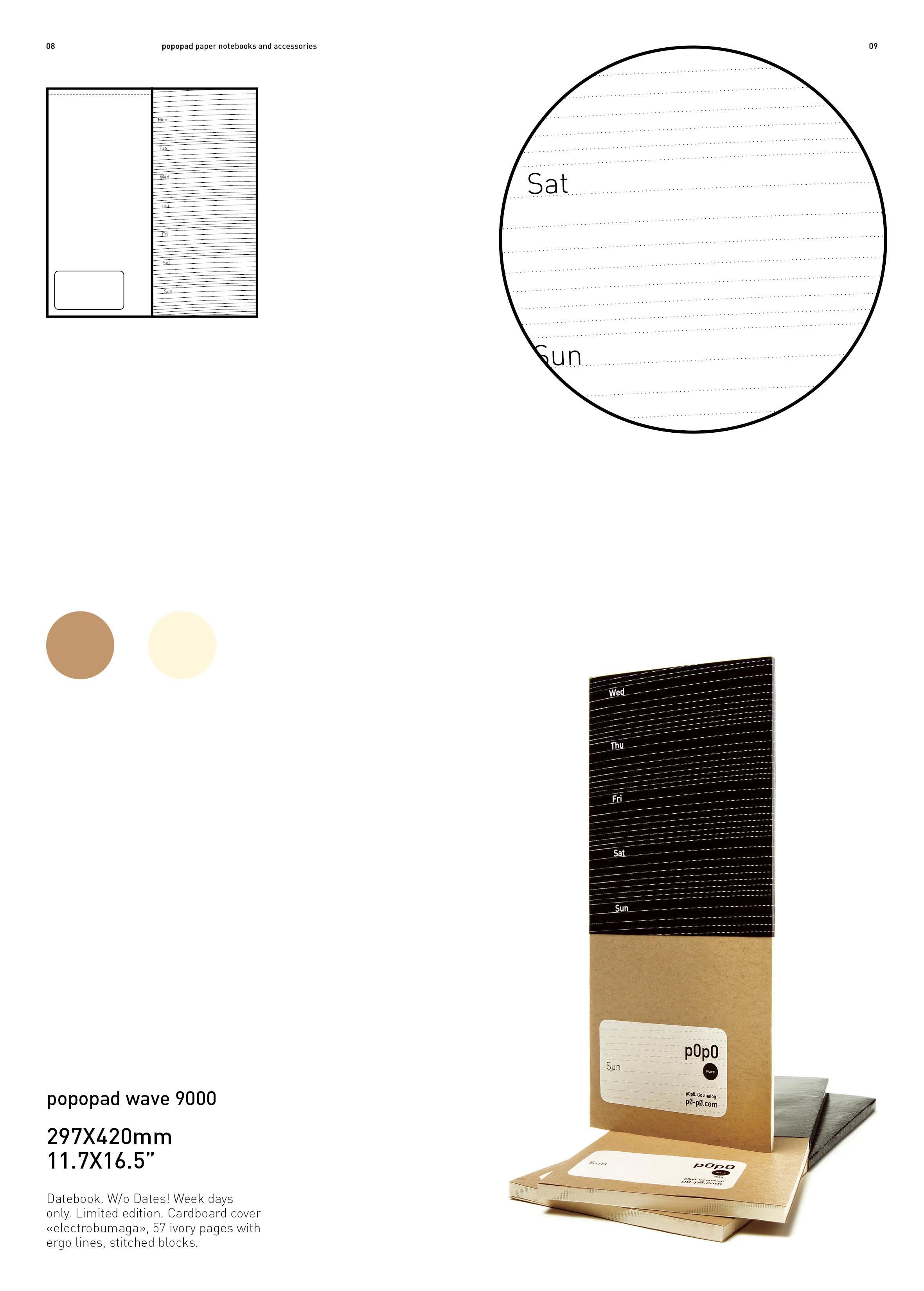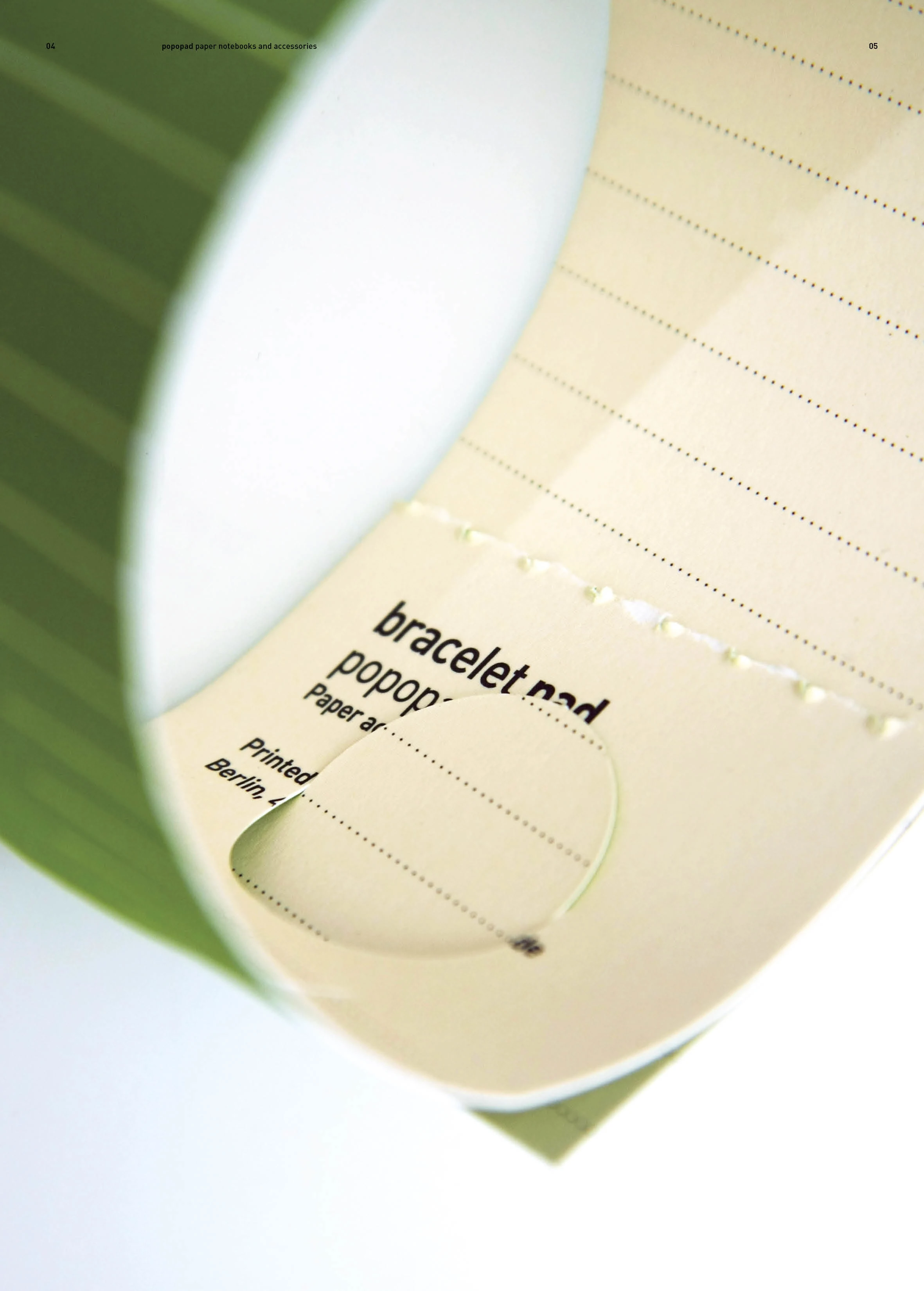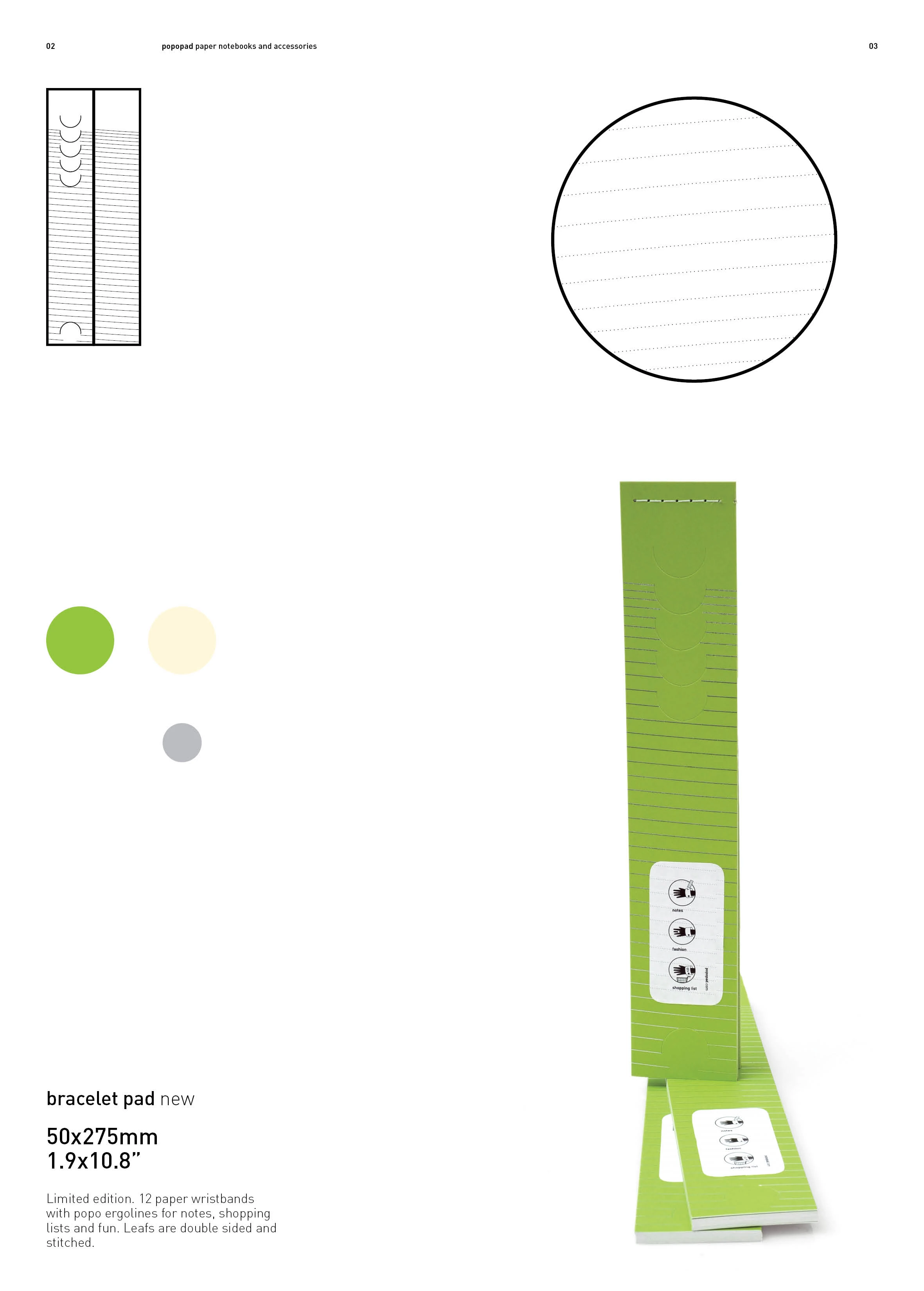 A series of notebooks and other paper products with “super-ergonomic” layouts: tilted lines, a slight arc, and fewer lines toward the bottom of the page — so you actually finish the text on one sheet. A planner with dates printed on the back, to sometimes break the strict order. A shopping list notebook in the form of a disposable bracelet. A writable calendar. A self-initiated project.