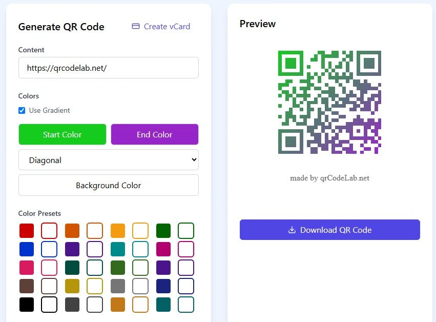 Tool Customization Download Format Signups/Ads? vCard Support qrCodeLab.net Colors, gradients, text High-res PNG ❌ No login, ❌ no ads ✅ Yes QRCode Monkey Logos + Colors Multiple formats ⚠️ Optional email ✅ Yes Canva QR Tool Limited inside Canva Part of design ✅ Yes (account) ❌ No GoQR Basic text/link codes Basic PNG ❌ No login ❌ No
