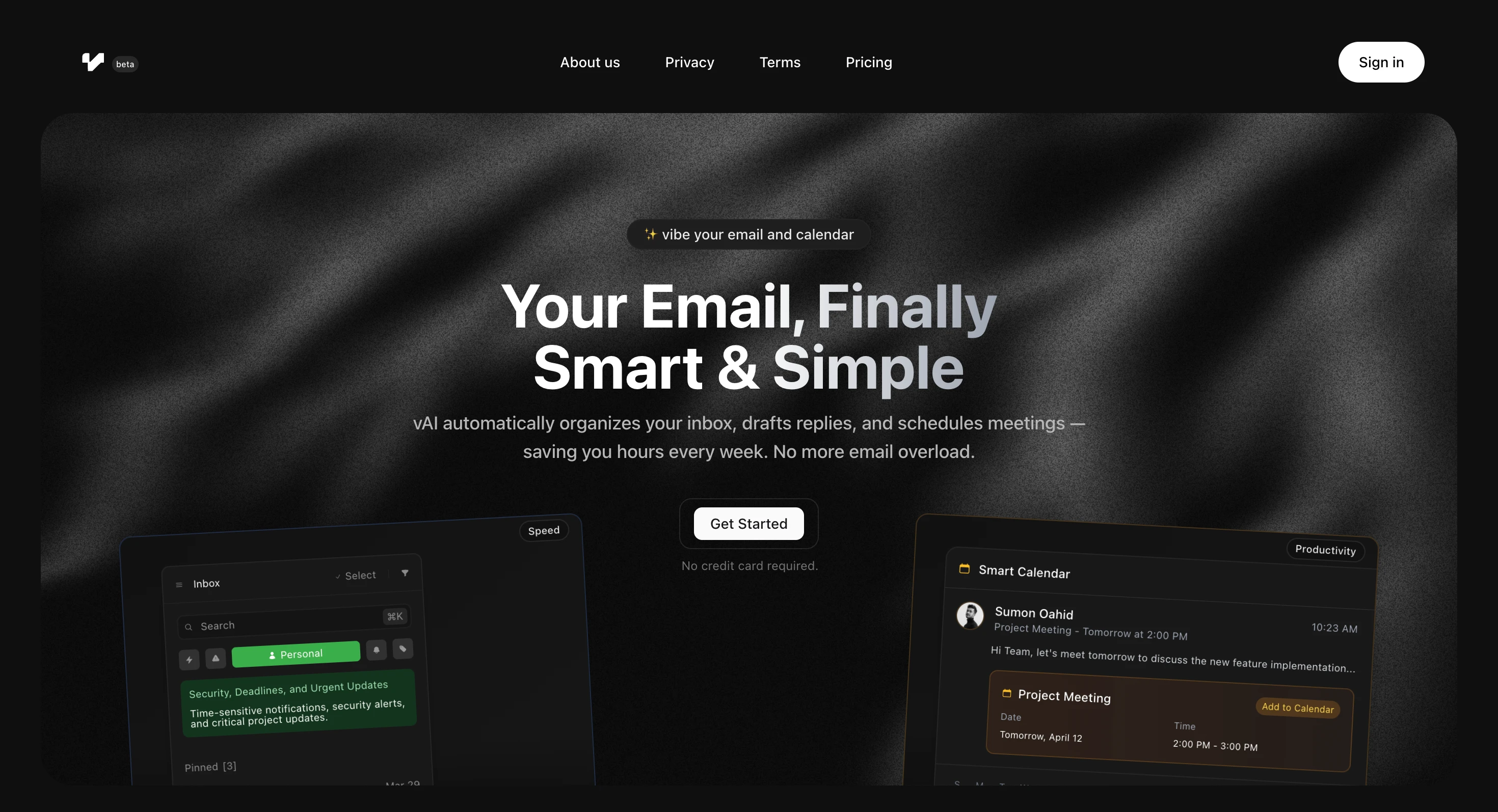 vAI automatically organizes your inbox, drafts replies, and schedules meetings - saving you hours every week. No more email overload.