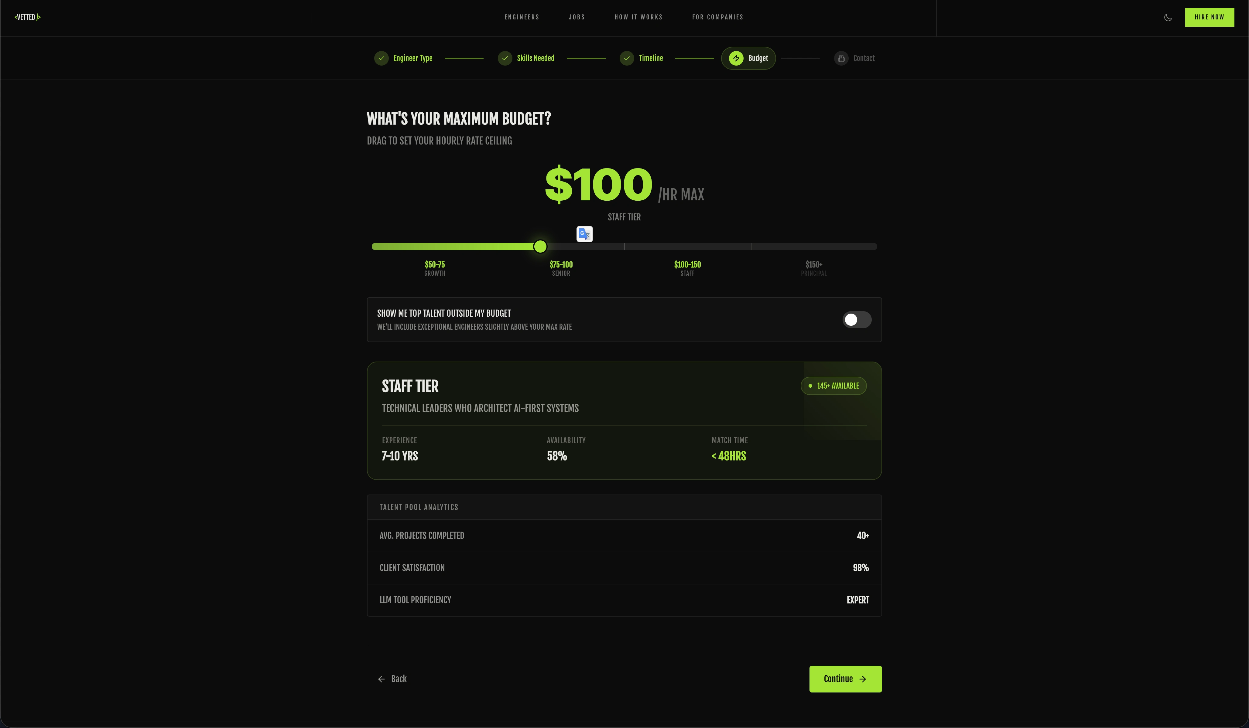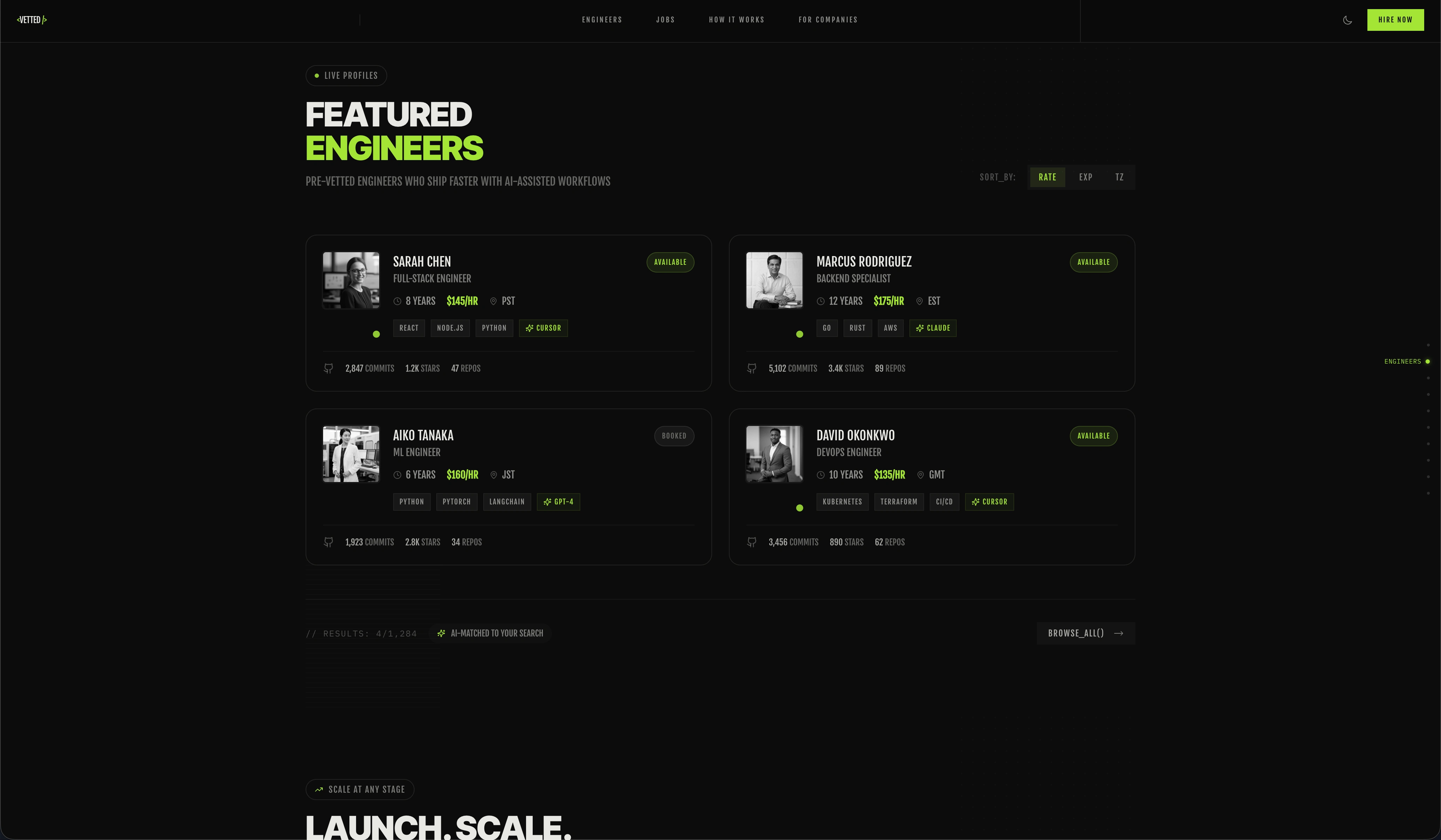 vetted is a concept job board platform designed for LLM-assisted software engineers. The platform connects companies with engineers who specialize in AI-augmented development workflows, featuring a distinctive technical aesthetic and sophisticated interactions.