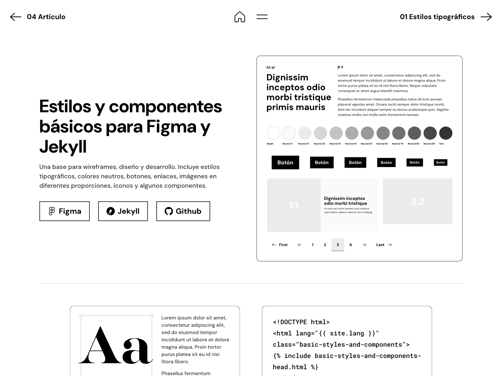 Una base para wireframes, diseño y desarrollo. Incluye estilos tipográficos, colores neutros, botones, enlaces, imágenes en diferentes proporciones, íconos...