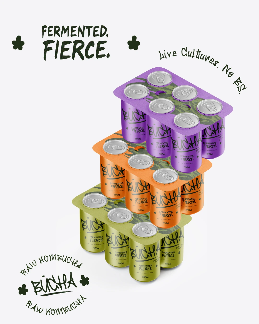 The goal was to design a kombucha brand that rebels against the usual wellness aesthetic—no pastels, no floral yoga cues. BÜCHA needed to be fierce, expressive, and unapologetic. Something that looks as sharp as it tastes.