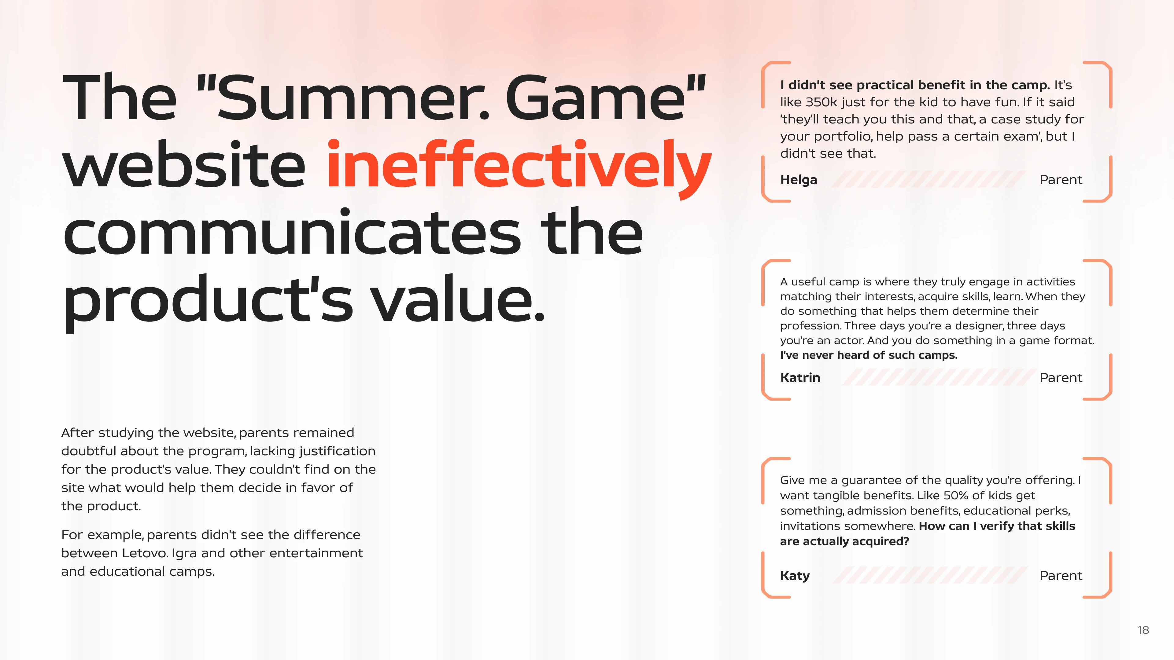 Each slide supports findings with numbers and user quotes. This format allows Summer.Game to use the report for internal website improvements and to demonstrate a data-driven UX approach to investors.