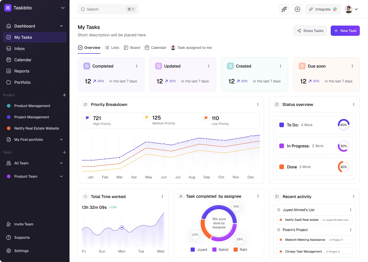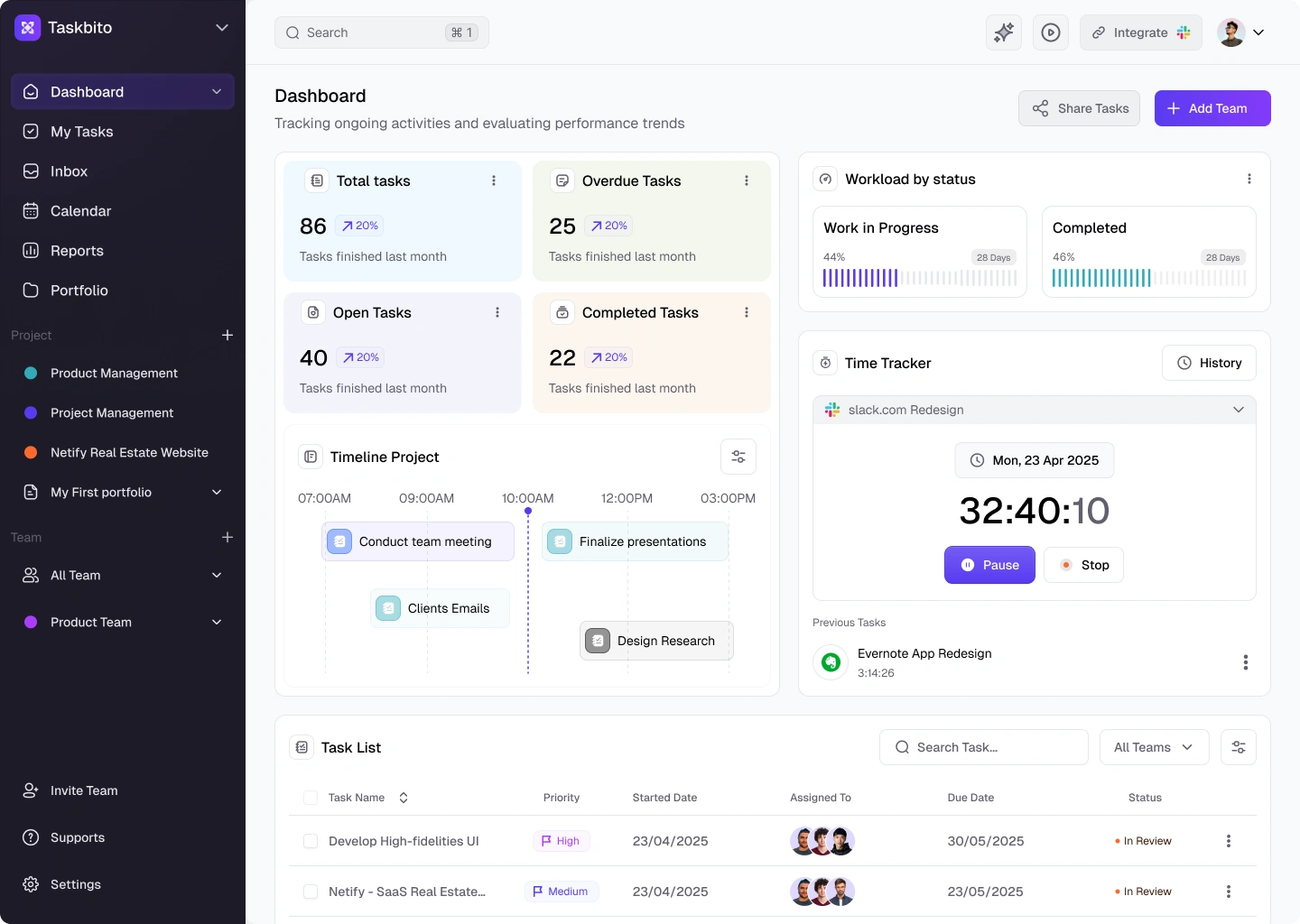 I designed the dashboard UI for Taskbito, a modern project and task management tool. My approach prioritized actionable clarity, real-time progress tracking, and seamless collaboration for teams. The dashboard features intuitive overviews of tasks, overdue items, workload distribution, and integrated time tracking—all in a clean, modular layout. Users can visualize project timelines, manage priorities, and track team performance at a glance. Every detail, from the navigation to the task list, was crafted for efficiency and effortless teamwork.