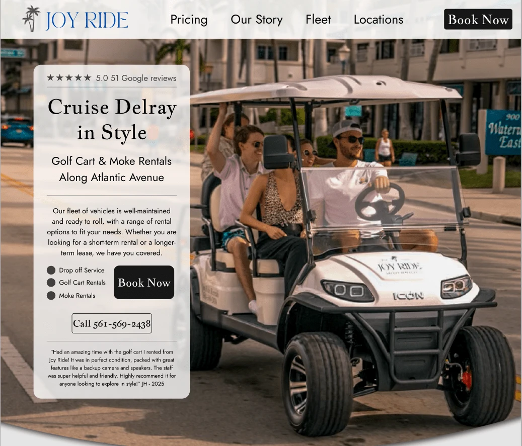 Hero image for Joyride: a bold, coastal-themed design with sleek cart, palm trees & promo text — built to capture attention and elevate brand identity.