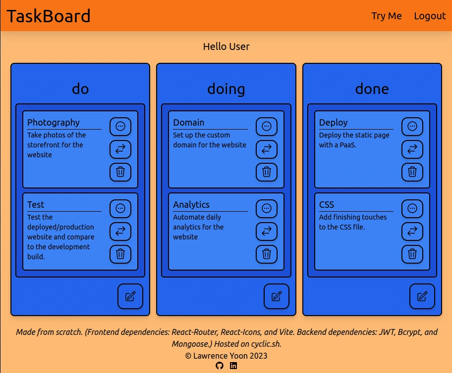 I developed this full stack app from scratch as a solo developer. The backend was developed with node, express, and interacts with the document based database mongodb. The frontend was developed with vite and react. It is currently live, deployed with cyclic at https://tame-puce-donkey-coat.cyclic.app/