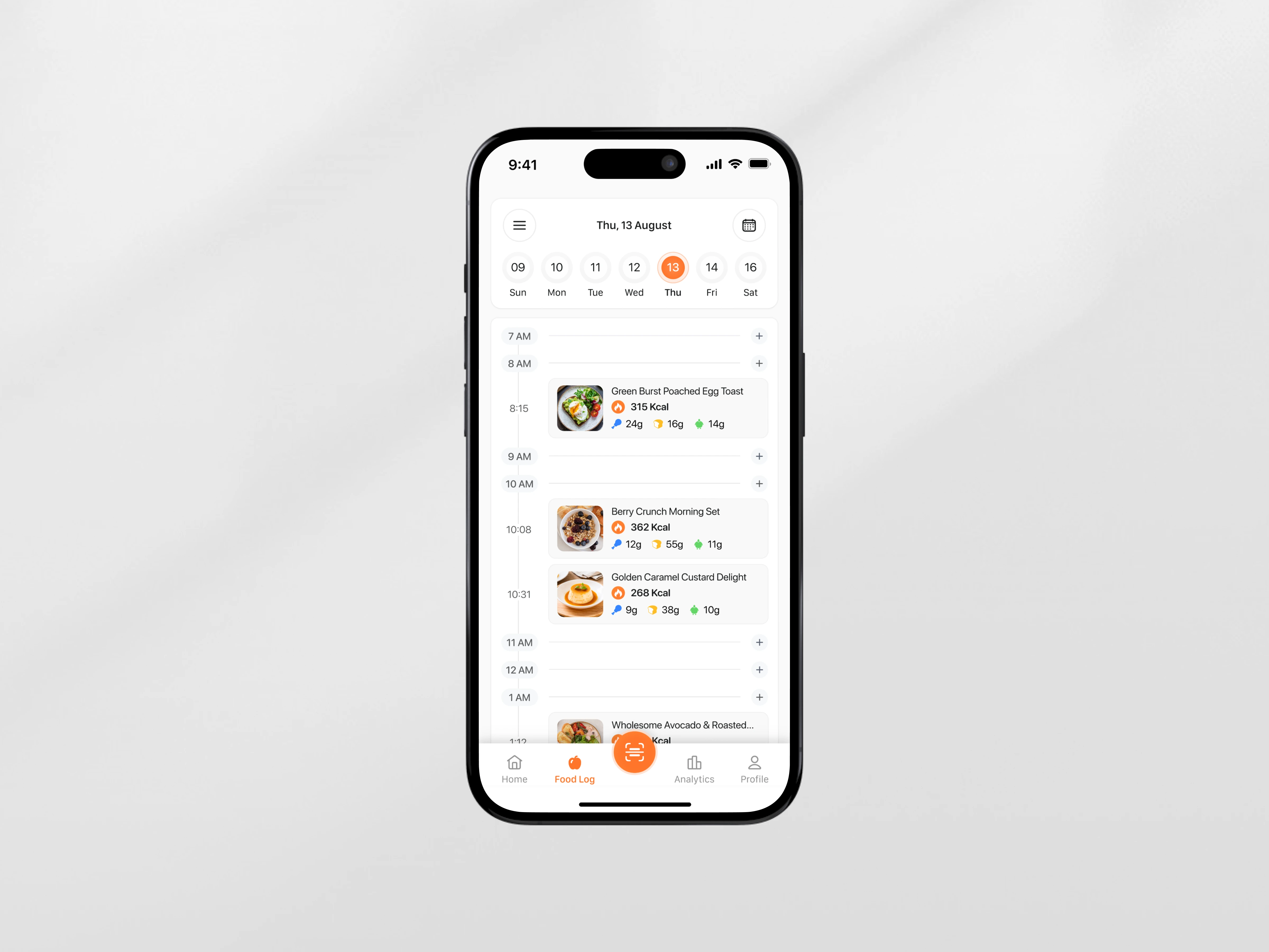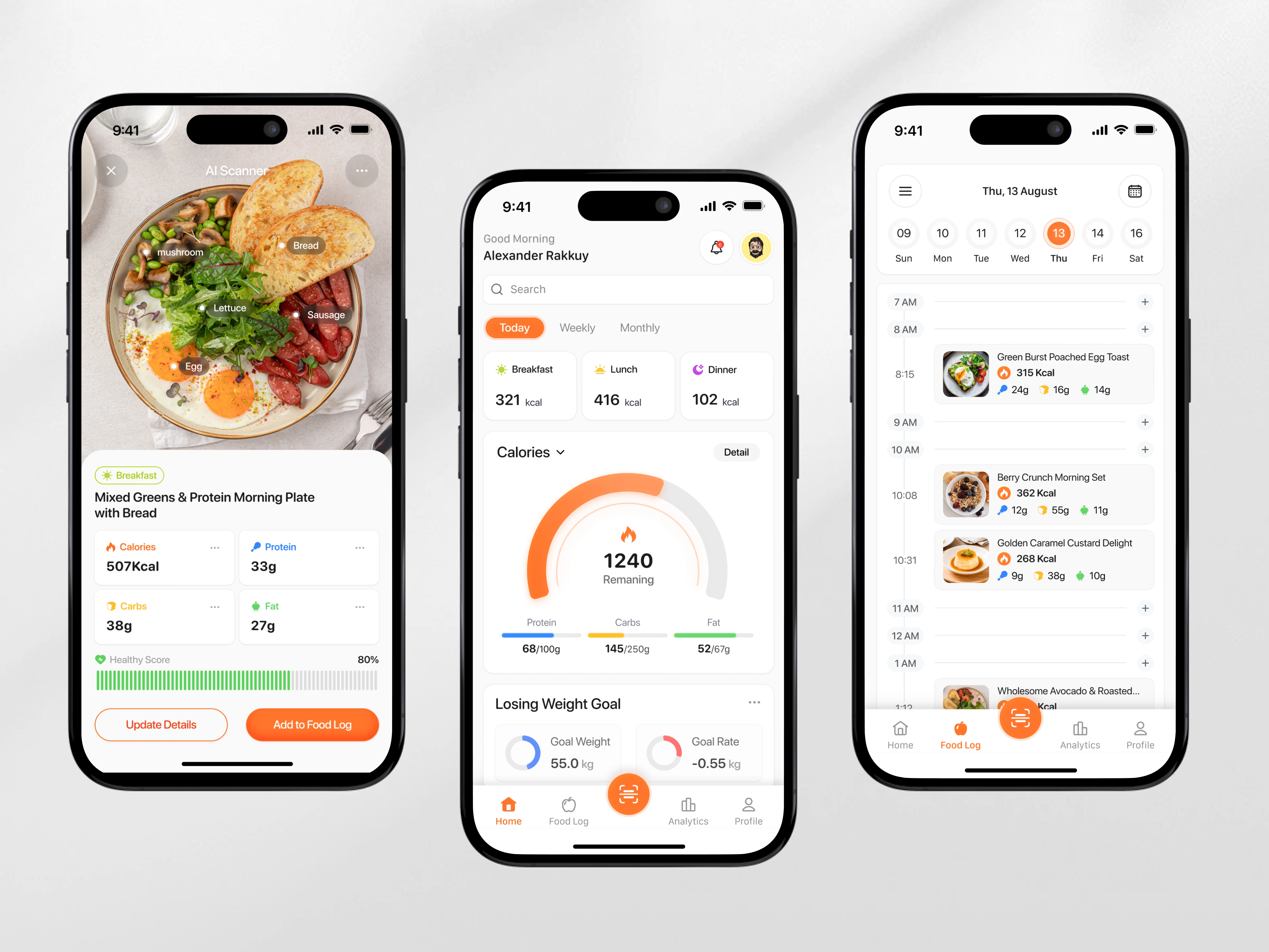 The app highlights AI food scanning, detailed meal breakdowns, daily calorie tracking, and a structured food log timeline. Each feature is optimized for fast input and clear feedback throughout the day.