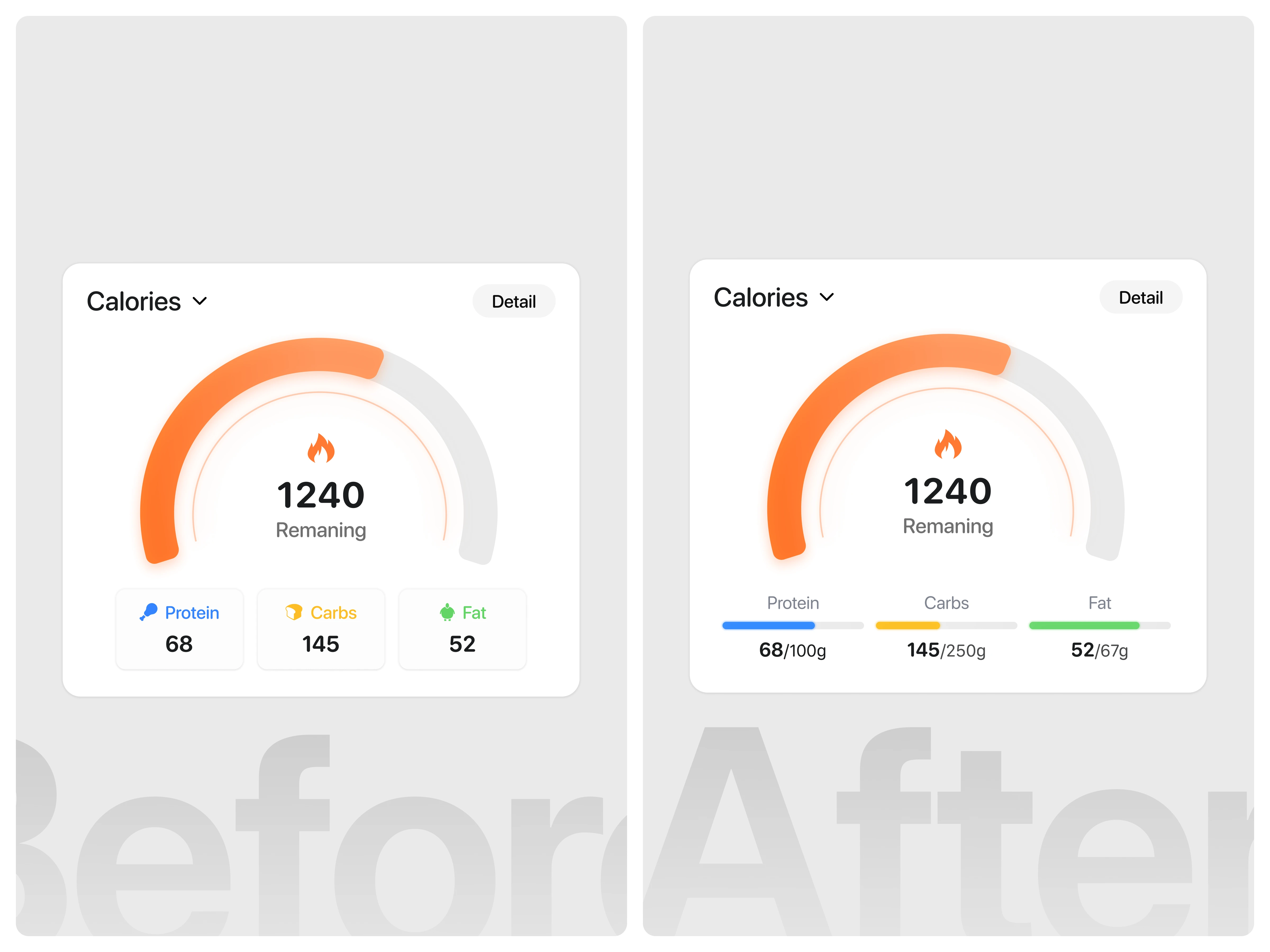 In the improved version, progress bars and “current vs target” values make the system status instantly visible. Users can immediately see how much they have consumed and how close they are to their goals without extra effort. This improvement increases clarity, reduces cognitive load, and makes the component more intuitive and actionable.