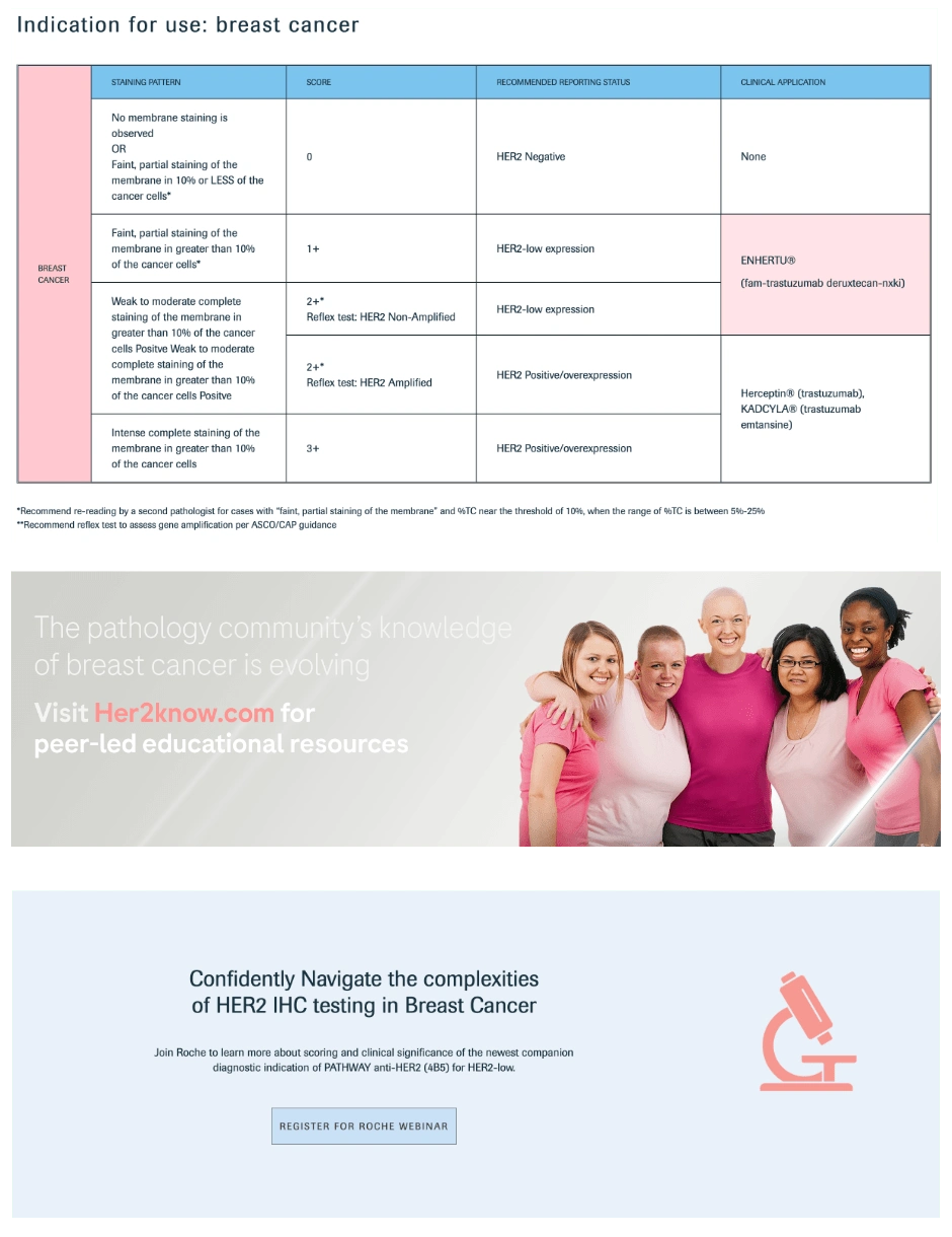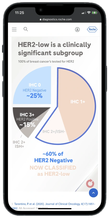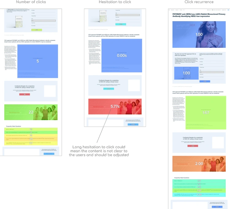 Each project provides insights to how users engage with the site and the various components on each page. The content is vital of course, but we can take general learnings and use them in future projects. Using Contentsquare you can see some example metrics below on how users are engaging with the HER2-low page in its first week. Much can be interpreted from these numbers over time. We can see that users are hesitating to click on the promo image that takes them to Her2know.com. This could be that the call to action isn’t clear enough and we should change it to test another variant. Myself, the strategist on the project and the marketing lead for the product will sit down and interpret these metrics and make adjustments to the page.
