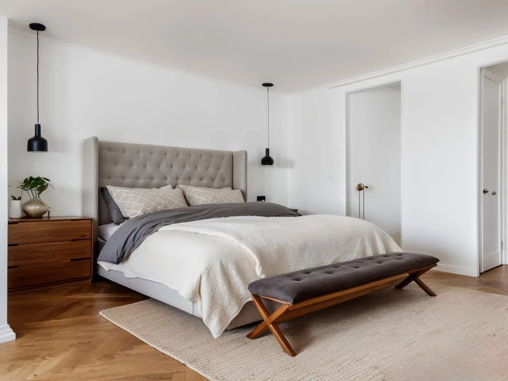A contemporary bedroom with a minimalist design features a tufted gray headboard, neutral bedding, and black pendant lights. Warm wood tones from the nightstand and bench contrast with the white walls and soft rug. Clean lines and subtle textures create a calm, elegant space perfect for restful sleep and relaxation