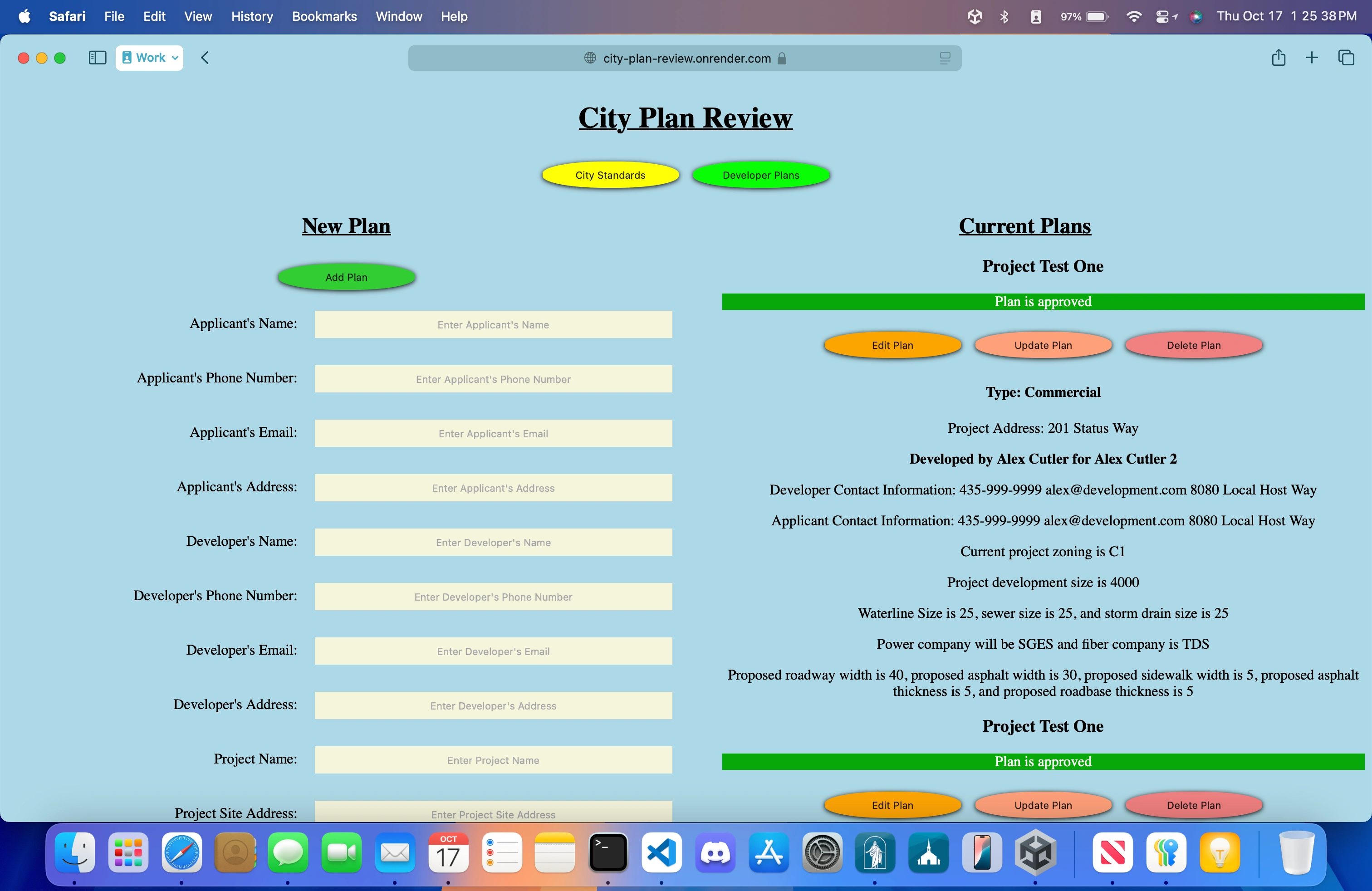 This is my midterm project for my SE-4200 Web Application Development 2 class. It is a city plan review and approval web application to automate the approval process of land development plans in cities. The backend uses Express.js built on Node.js for the server and is connected to a MongoDB database to store the data. The frontend uses Vue.js for interactivity with vanilla HTML and CSS for the styling. I personally deployed it using Render.