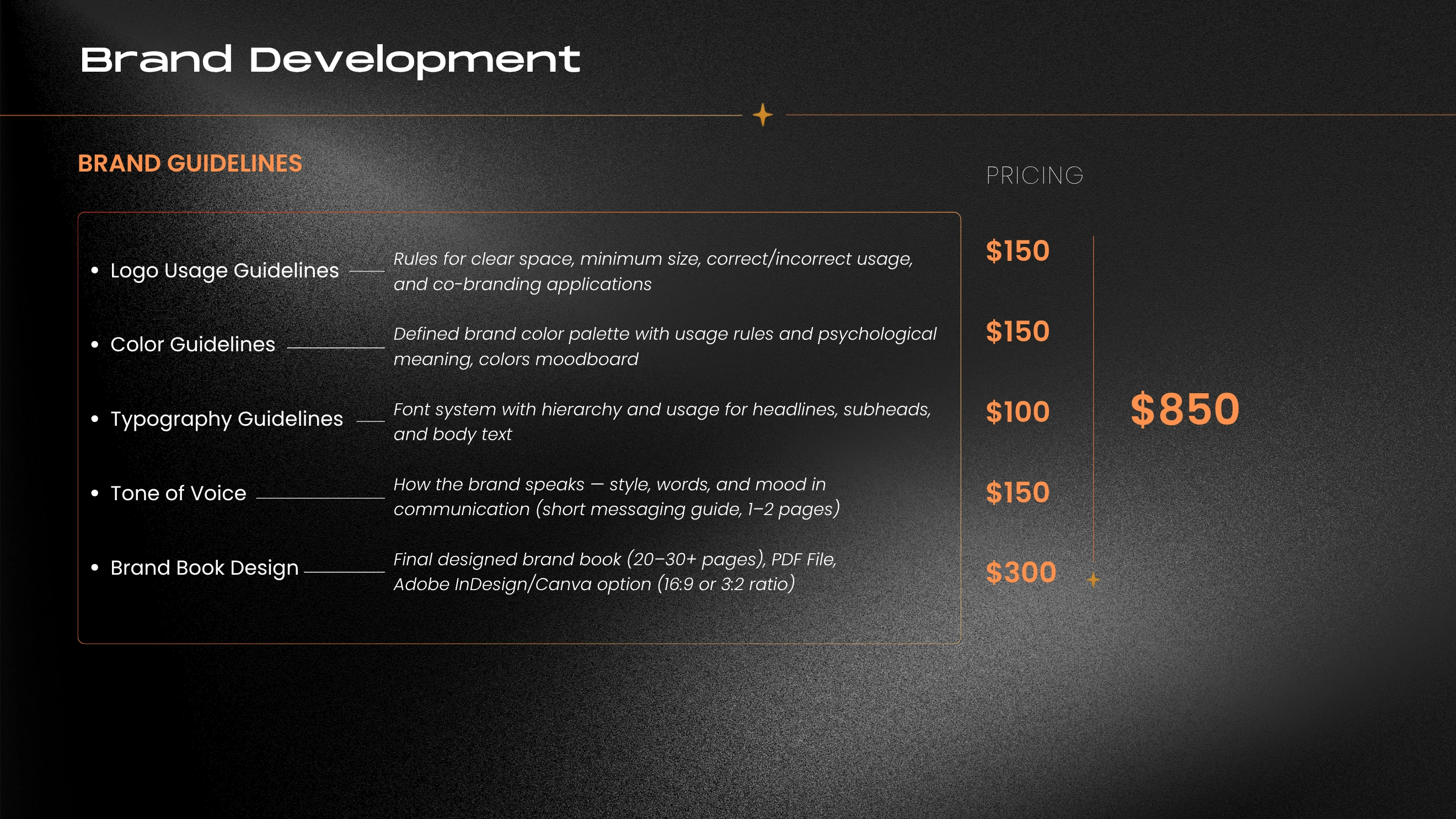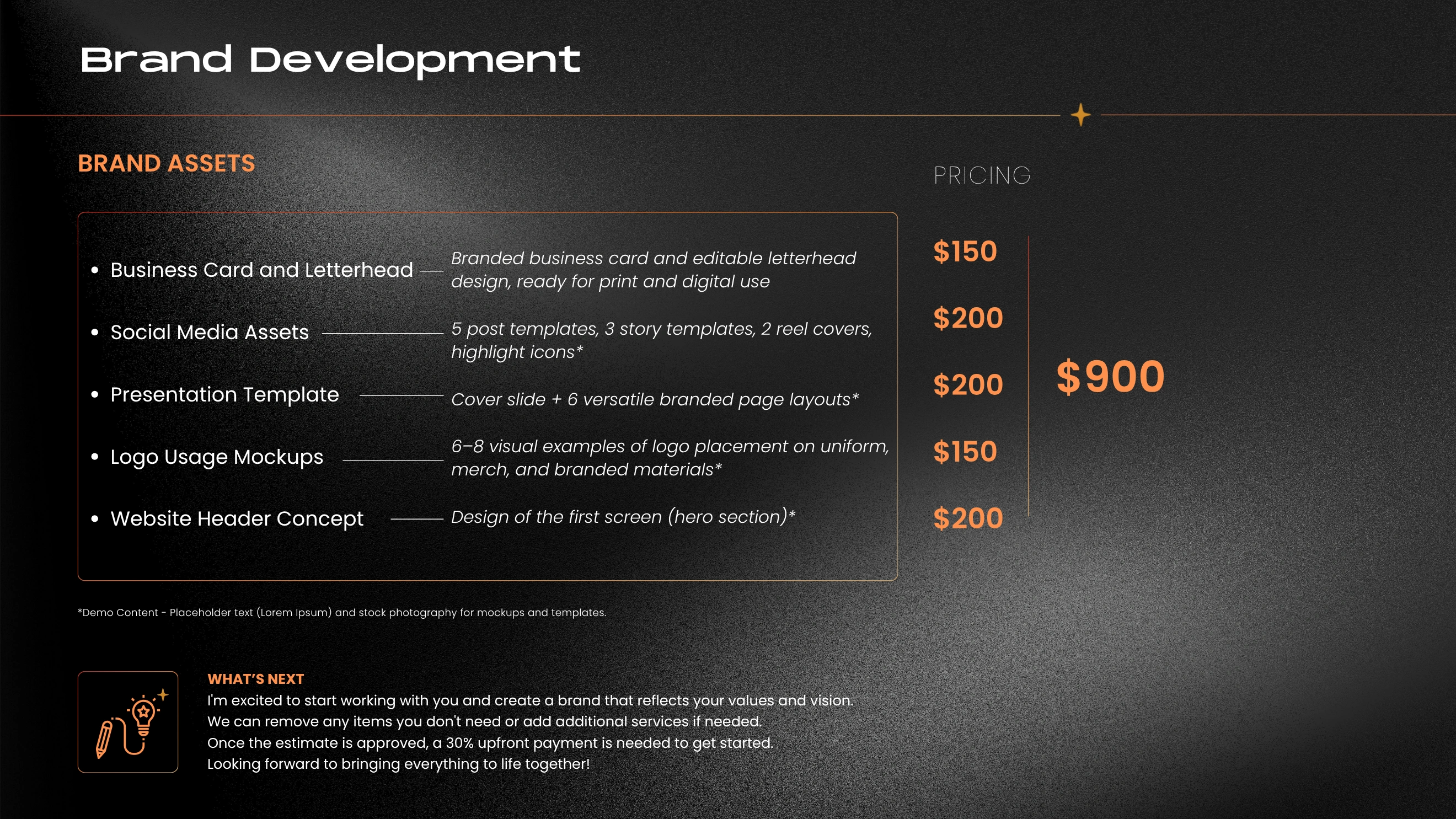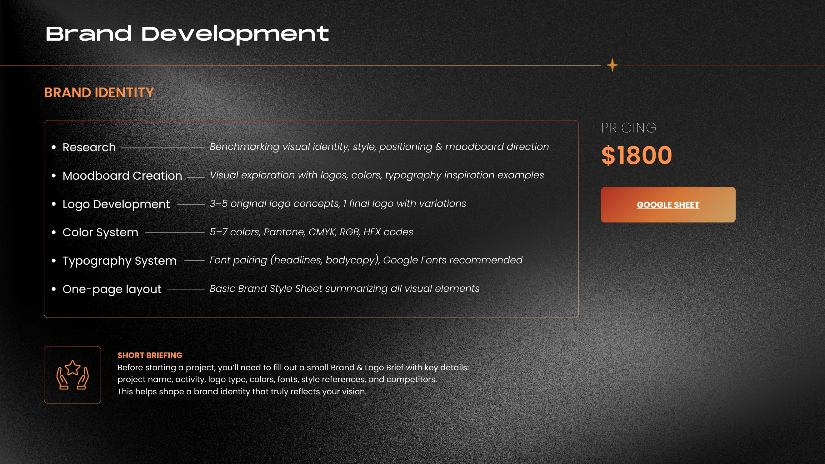 Fixed-price brand design proposal outlining strategy, identity, and creative direction.