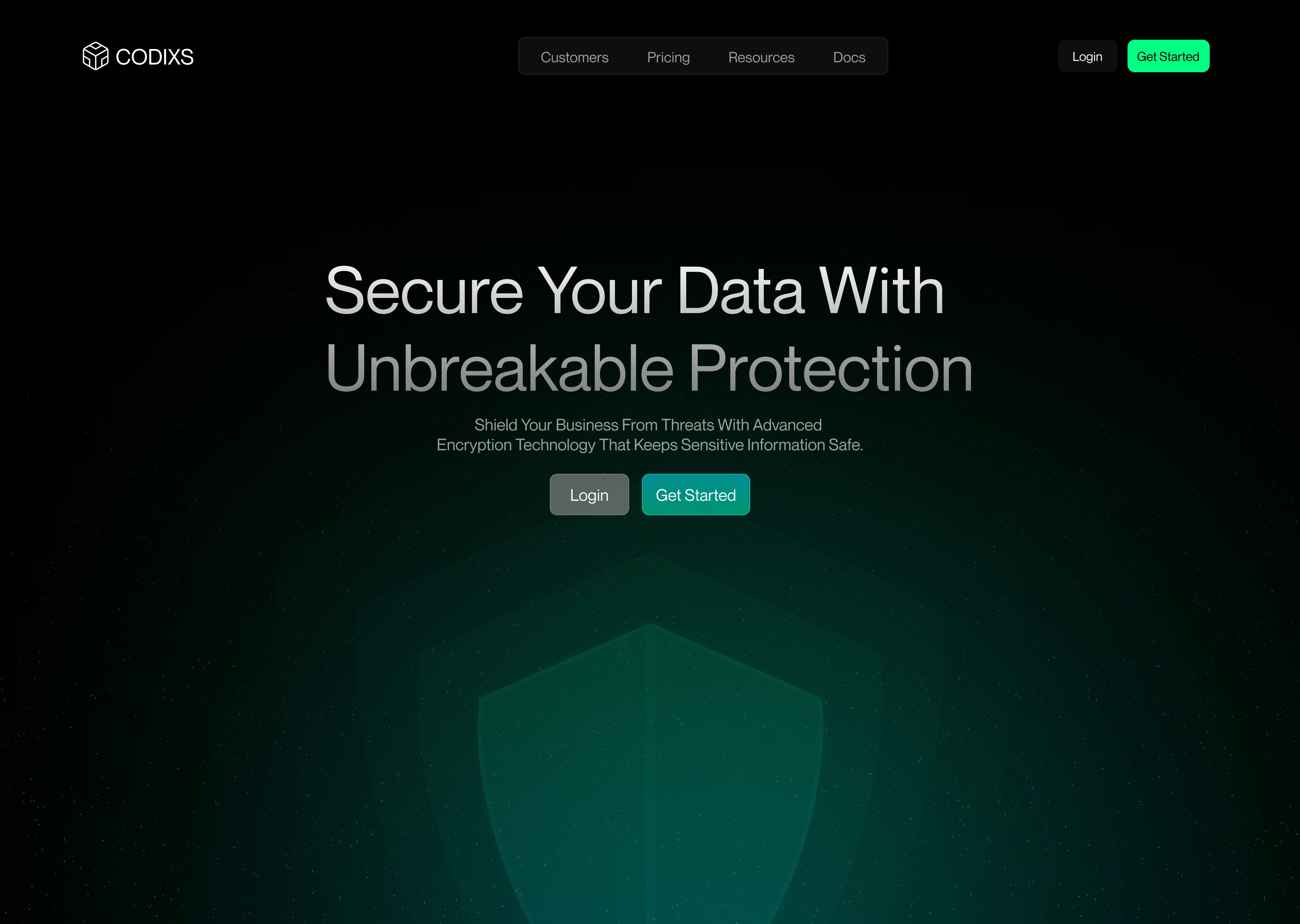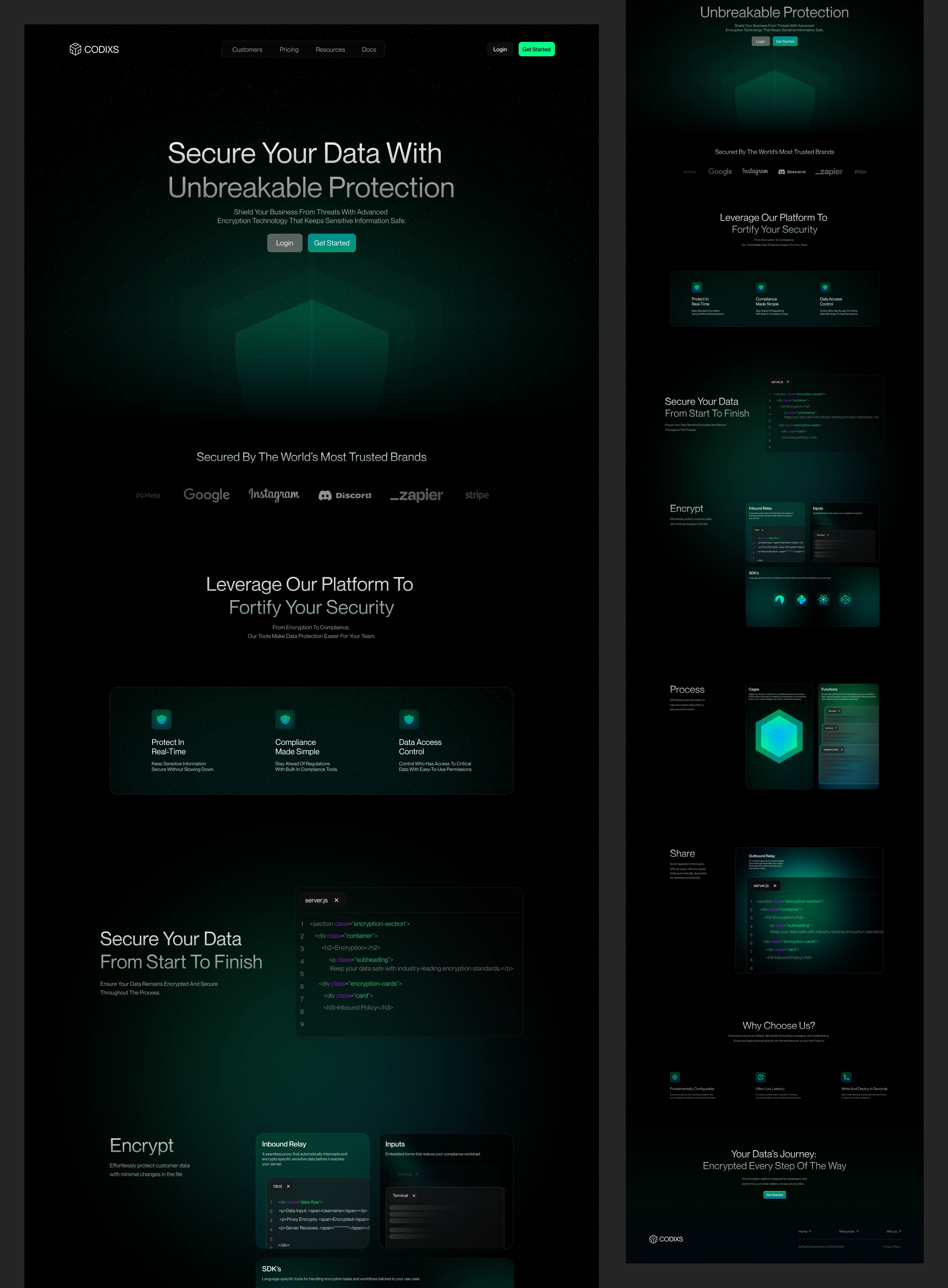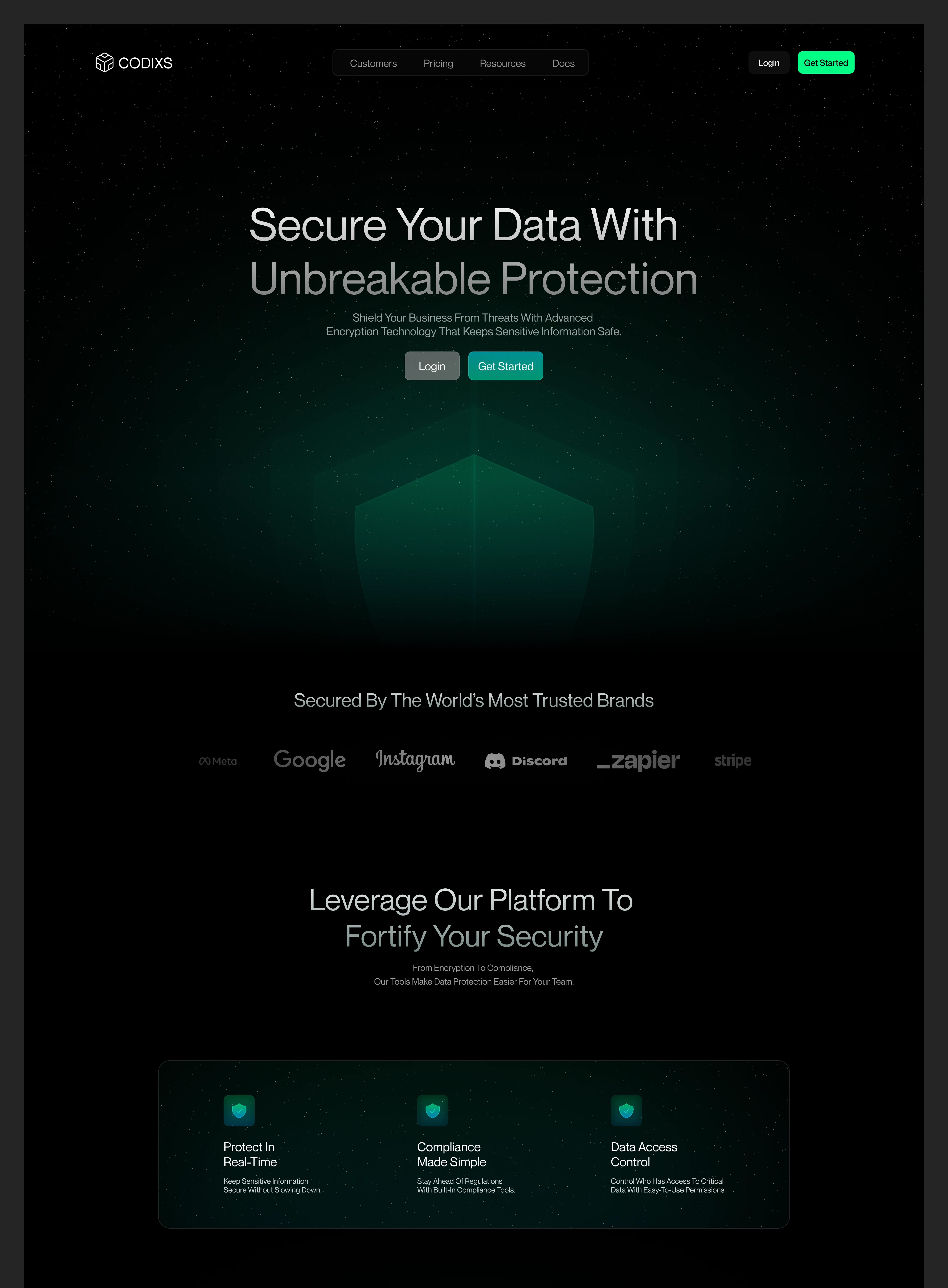 CODIXS is a dark, premium SaaS website crafted for modern cybersecurity companies, encryption tools, and privacy-first platforms. Designed to communicate strength, trust, and cutting-edge protection, CODIXS is visually led by a sleek dark interface, glowing green accents, and shield-based iconography that reinforces the core theme: "unbreakable data protection."