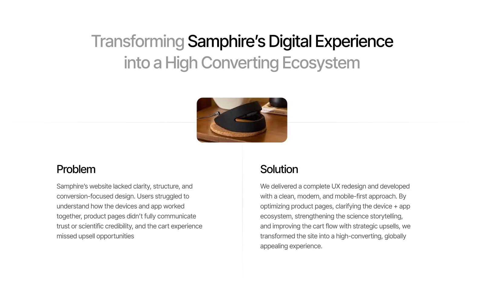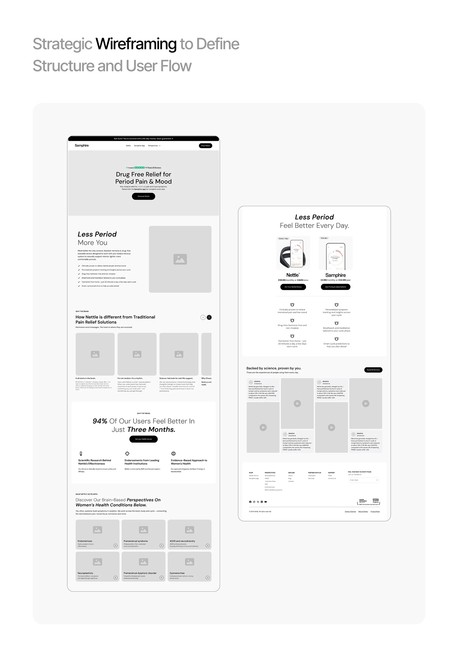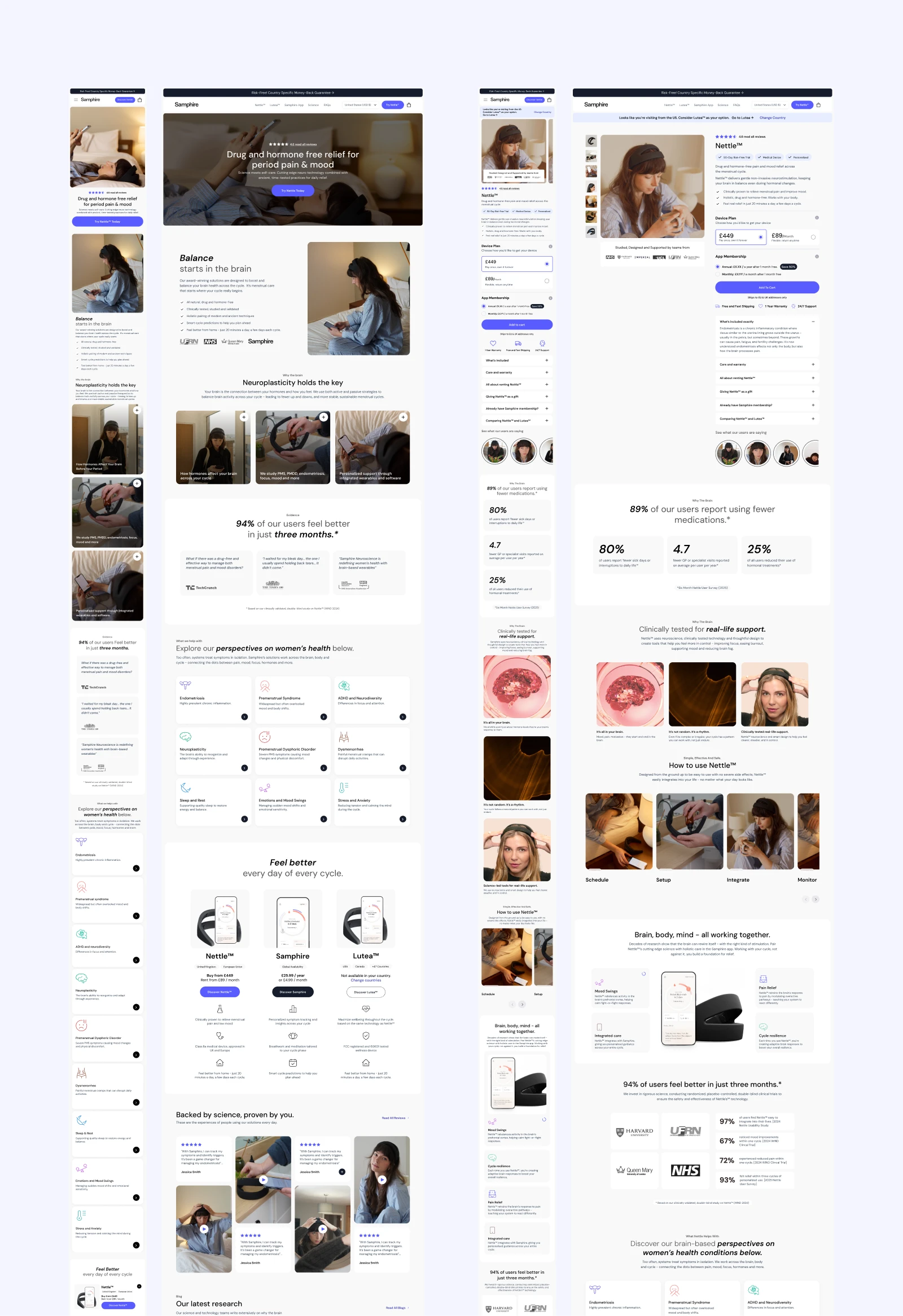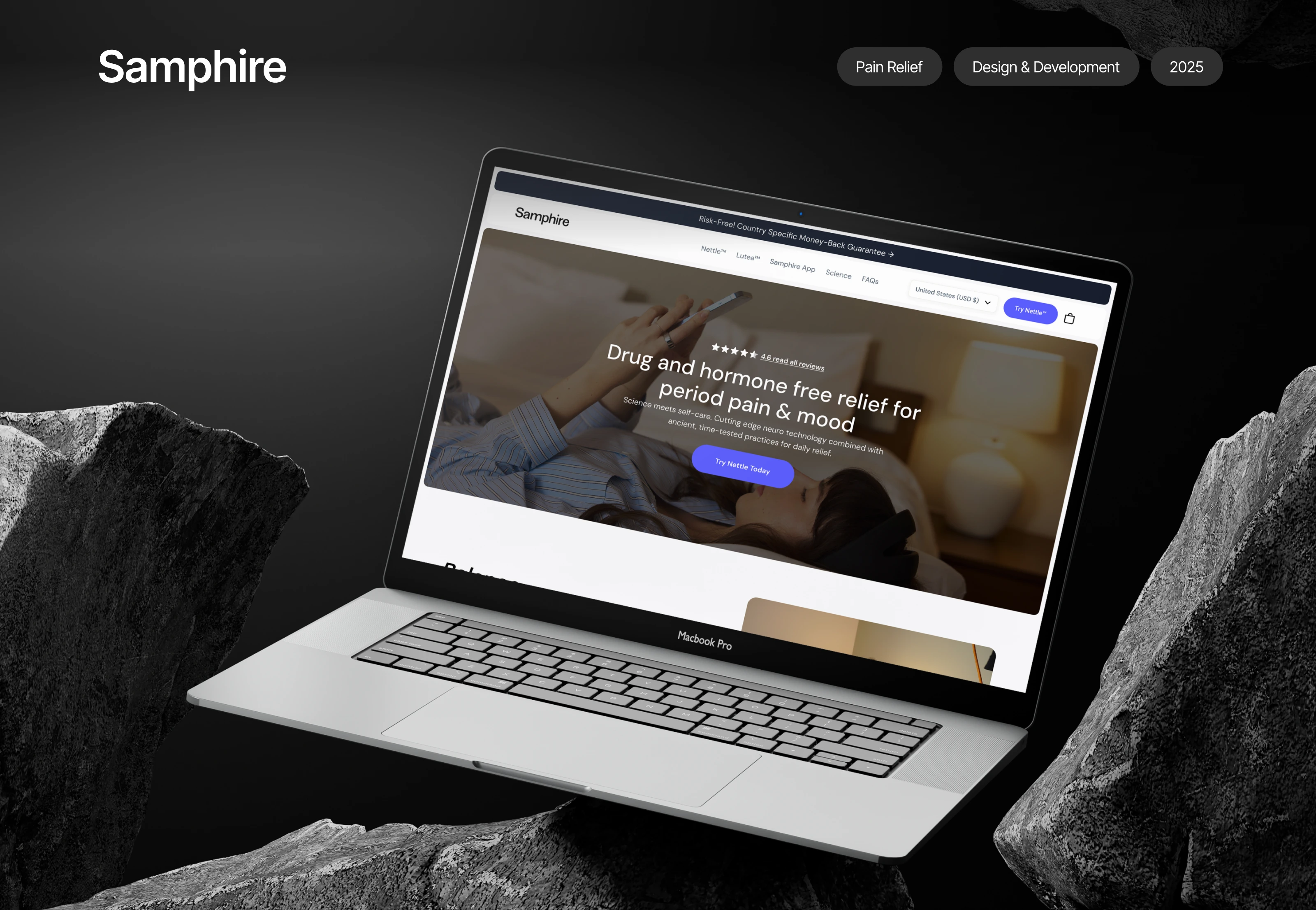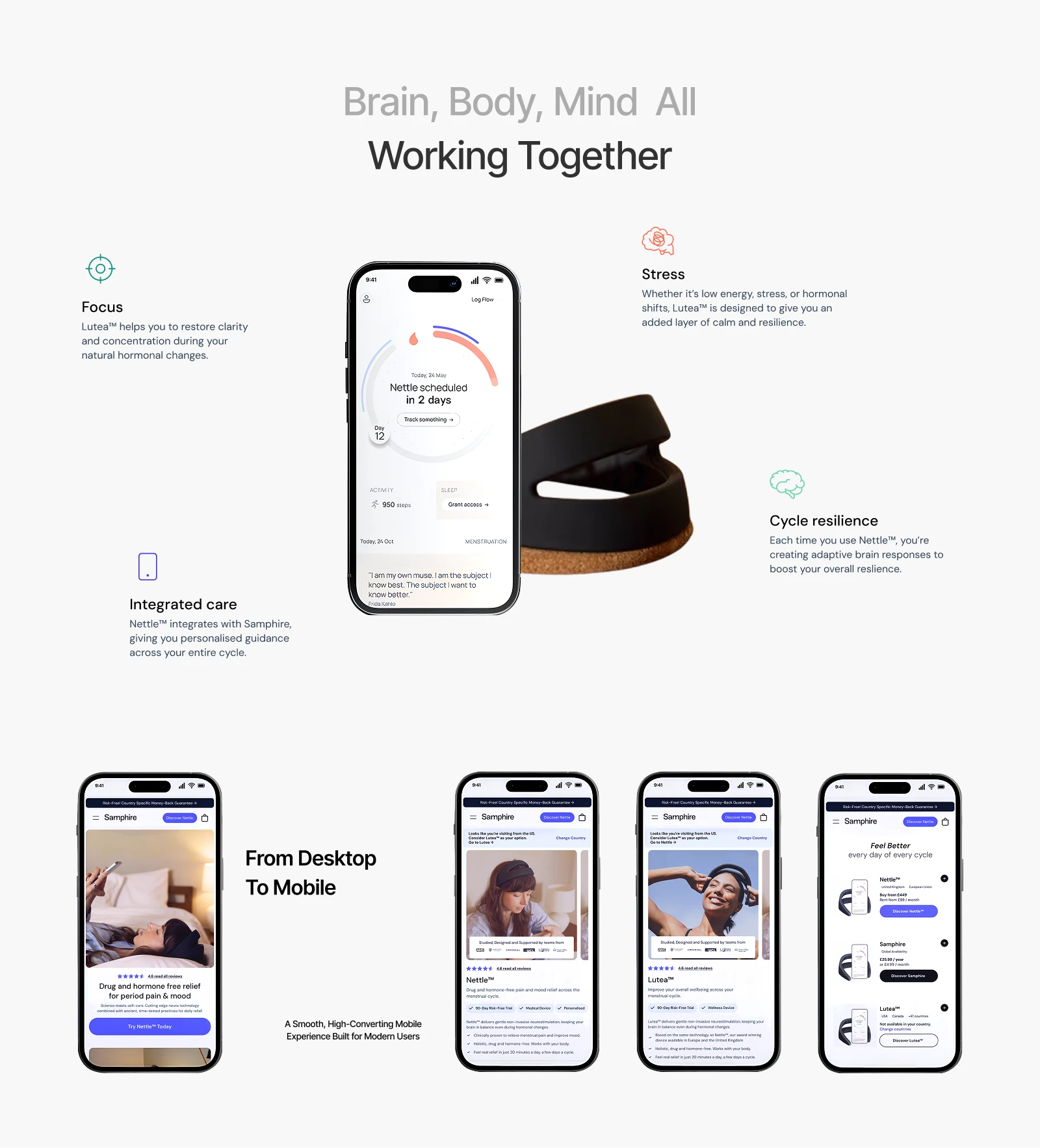 Samphire is a global wellness brand offering drug-free, hormone-free relief for period pain and mood symptoms. They sell three core products Nettle, Lutea, and the Samphire App required to activate both devices. Although their website existed, it lacked clarity, professionalism, and conversion focus needed to drive global sales.
