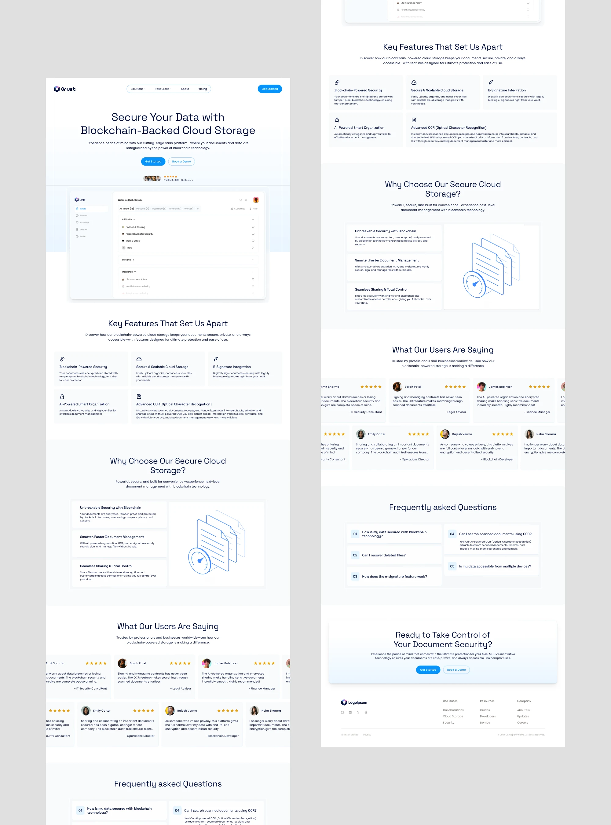 I designed a modern landing page for a blockchain-backed cloud storage platform, highlighting security, features, testimonials, and easy usability.