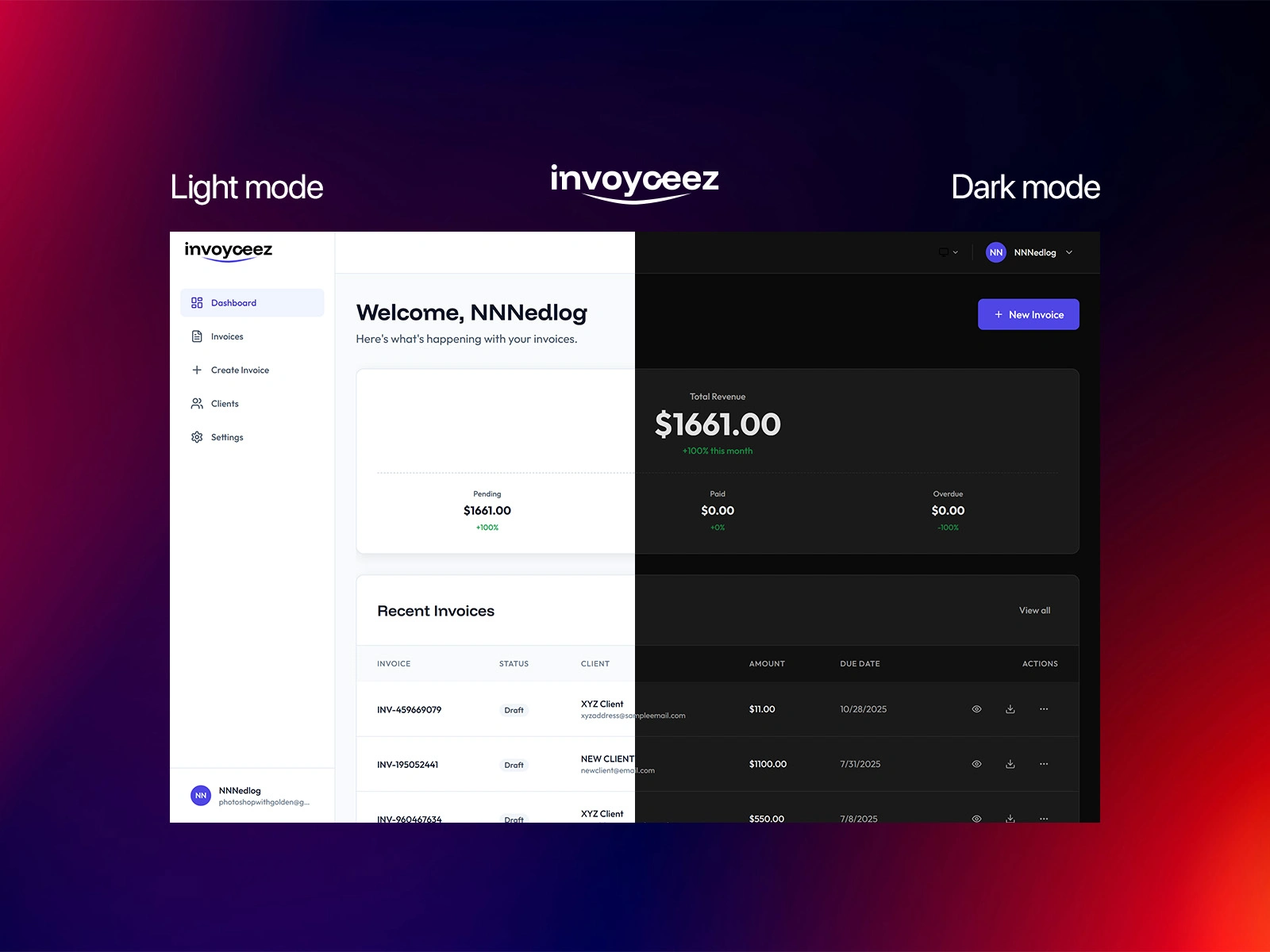 Features include a mobile responsive design, light/dark mode toggle, user authentication (email & Google sign-in), and user details and invoices created and updated in the database.