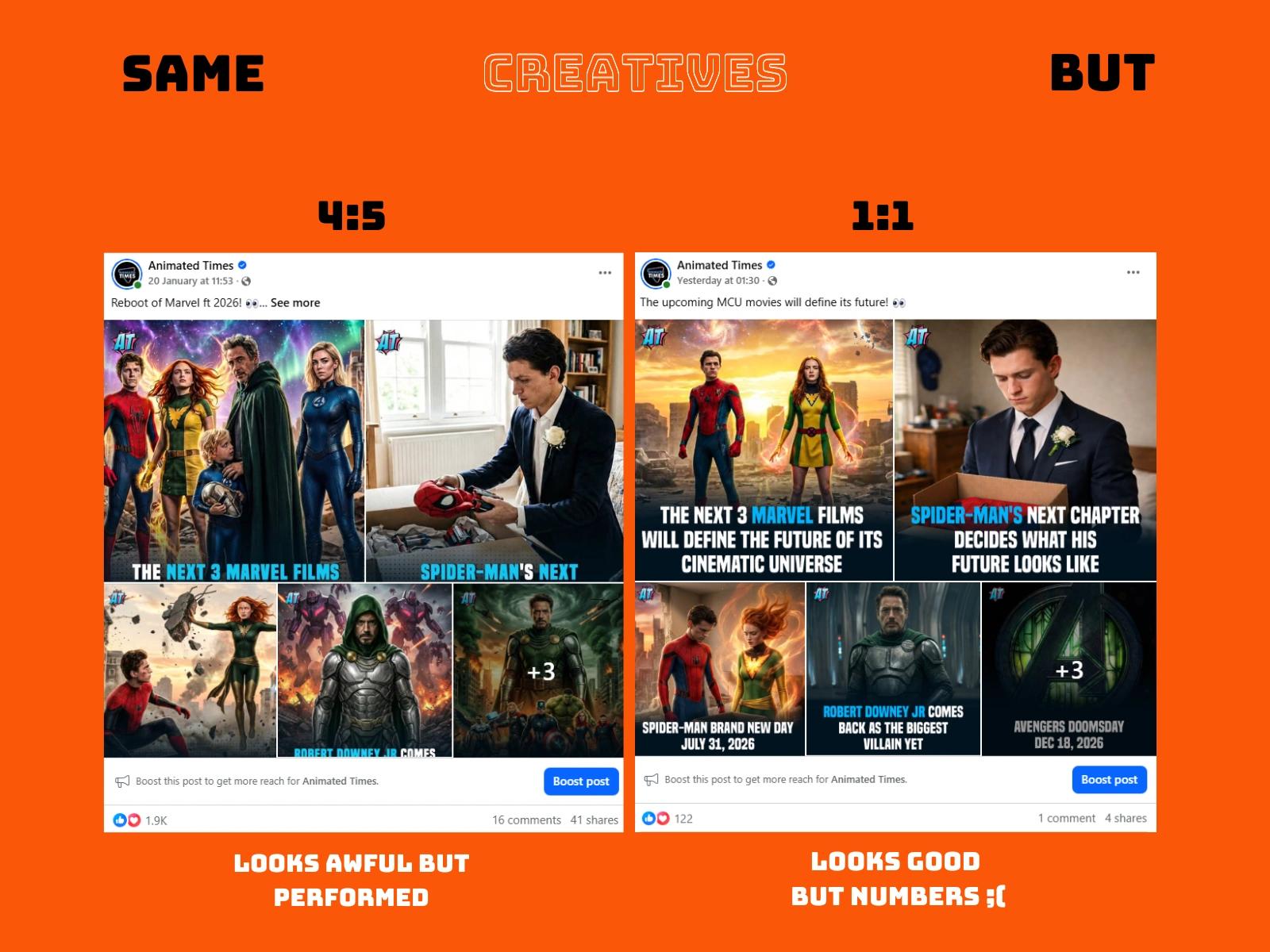 The same ideas were adapted into multiple formats (1:1 and 4:5) to maximise feed real estate and platform distribution without creative fatigue.