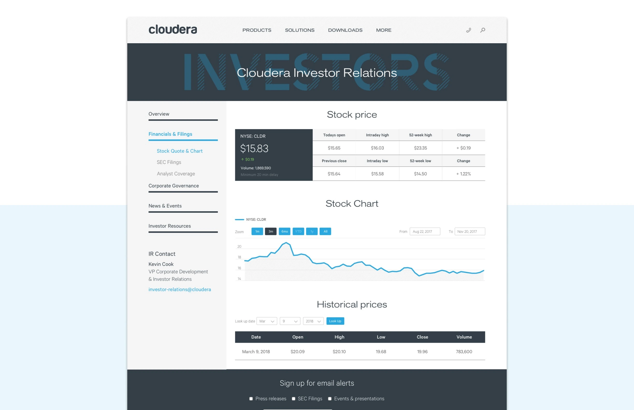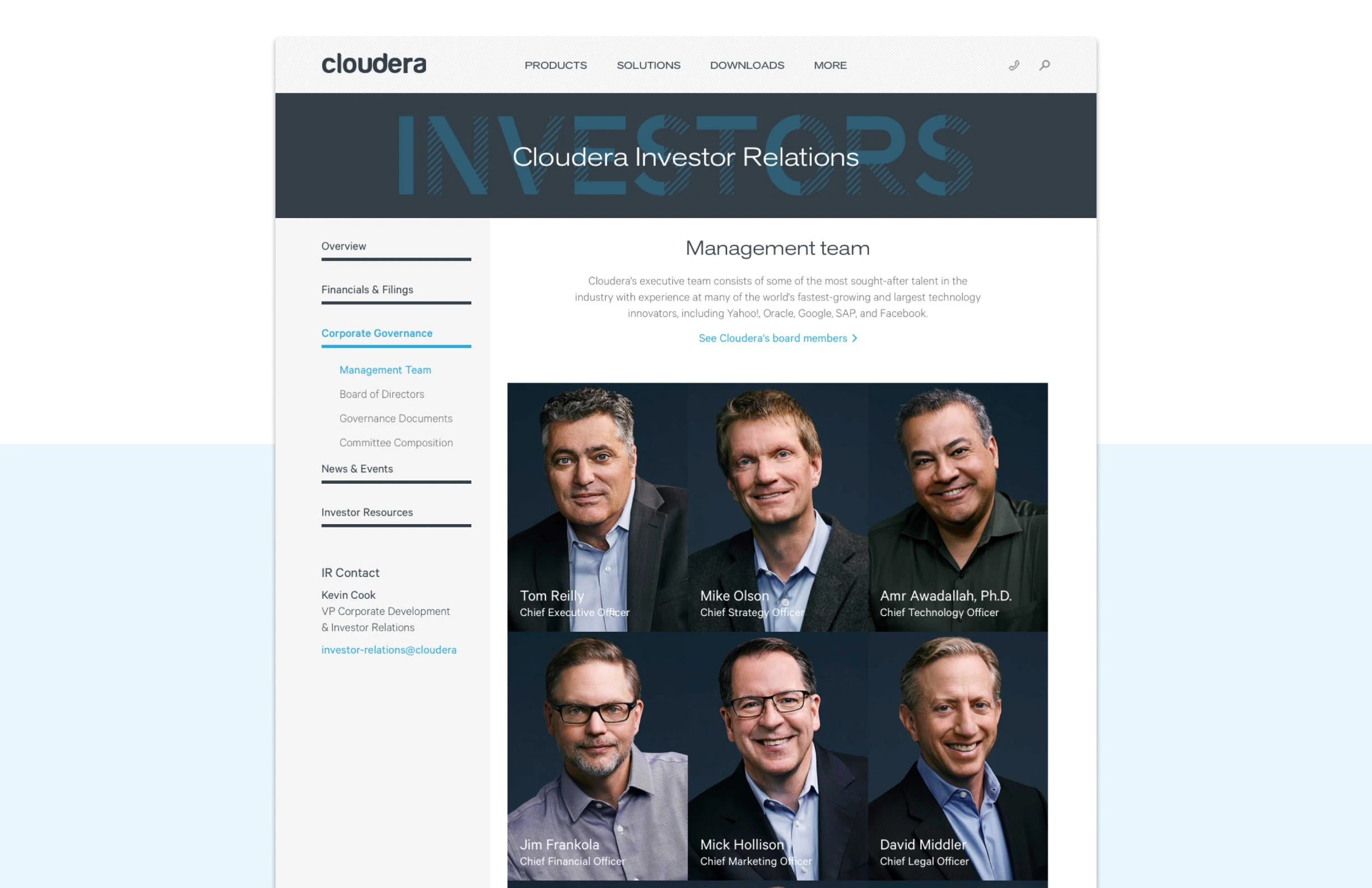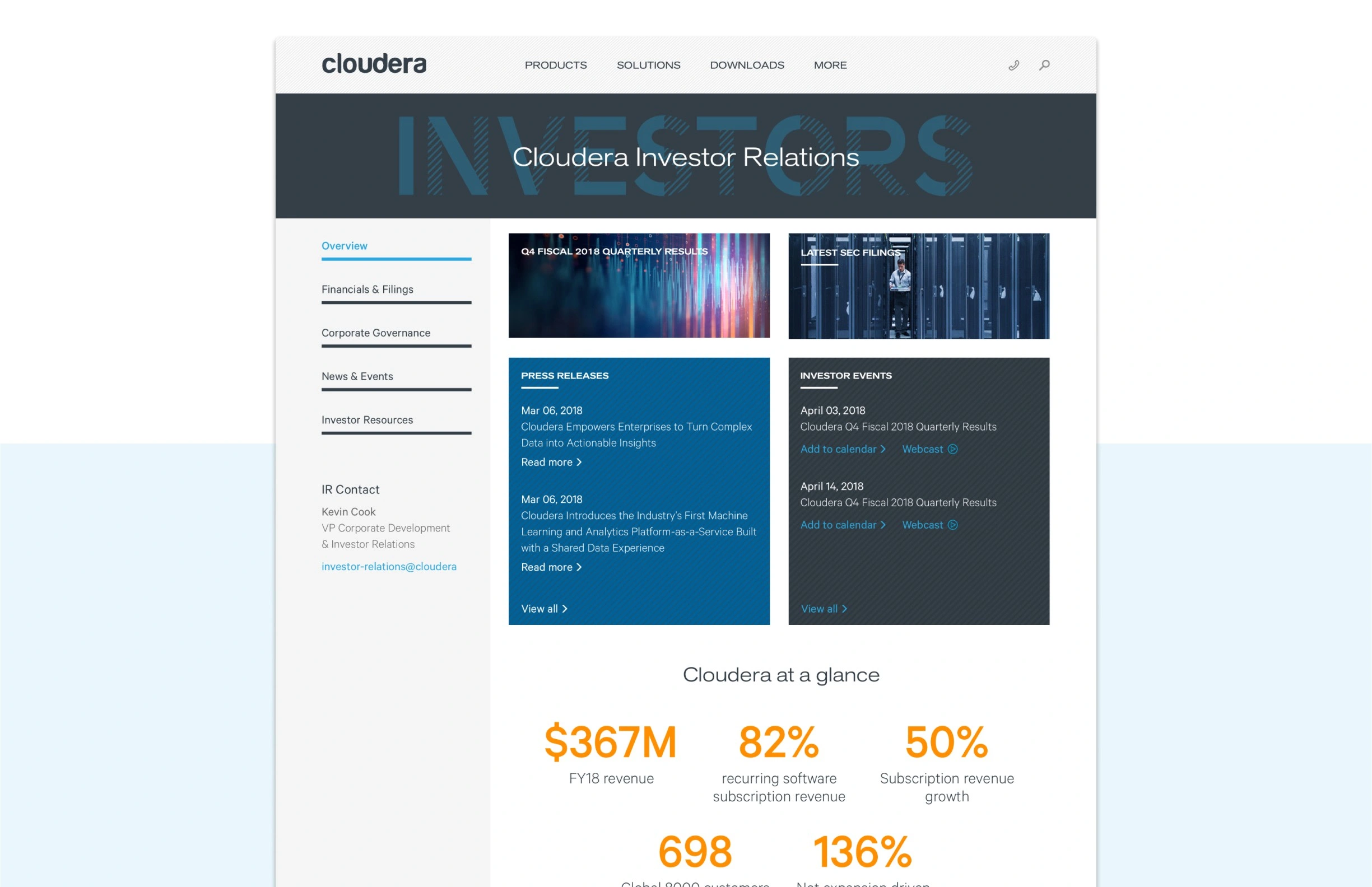 As a publicly traded company, Cloudera needed a place to share performance indicators with shareholders and potential investors. This section of the website needed to convey information clearly and objectively, while also creating a space for announcements and telling the story of how Cloudera’s leadership team is carrying the company forward.