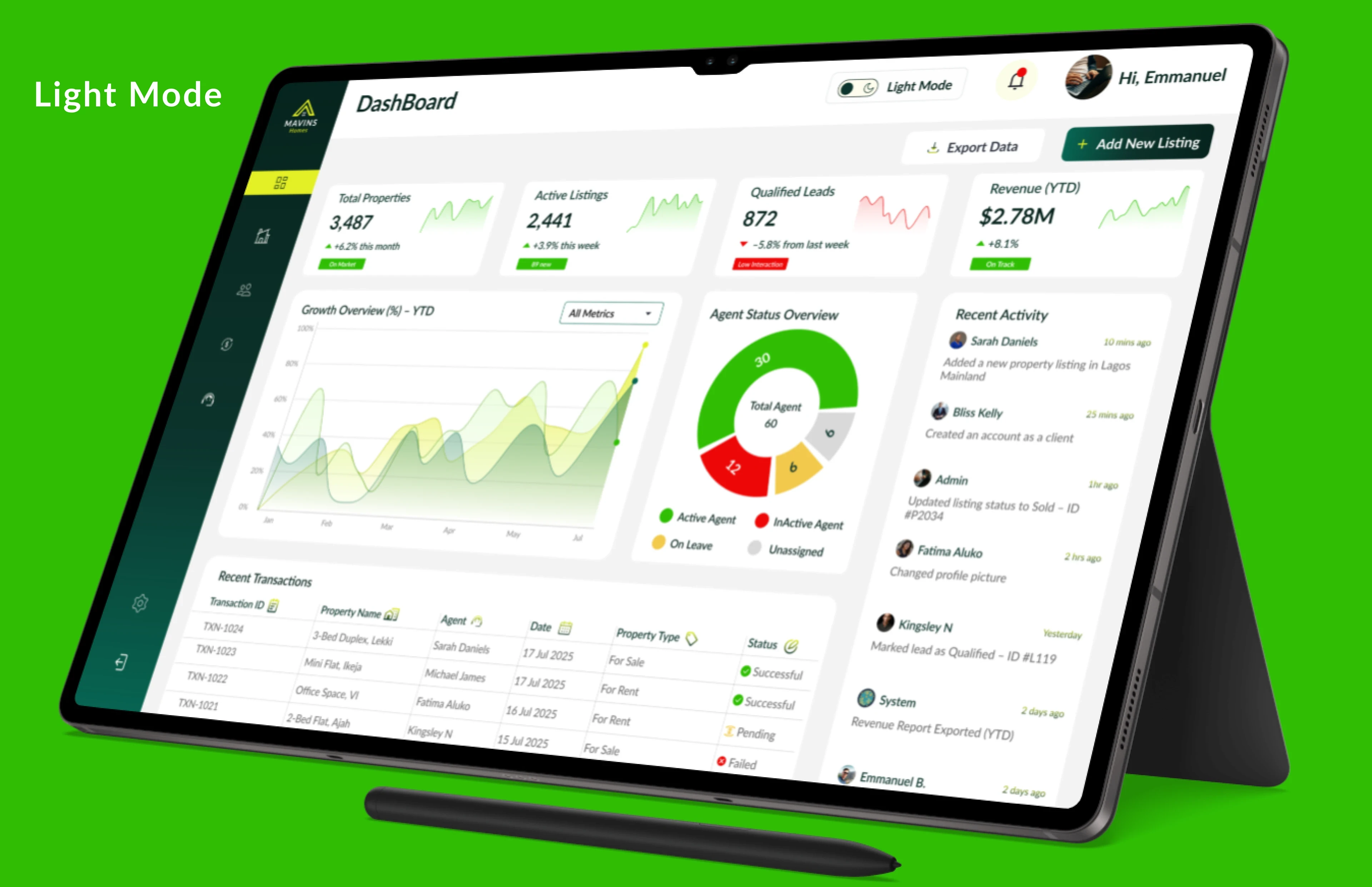 This is a modern real estate dashboard designed to help agents, property managers, and investors manage listings, leads, and performance in one intuitive space.