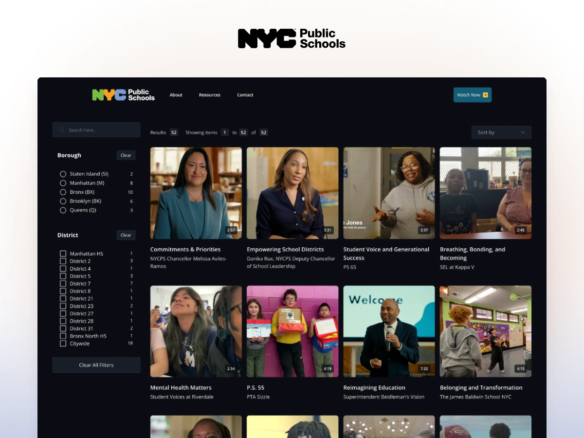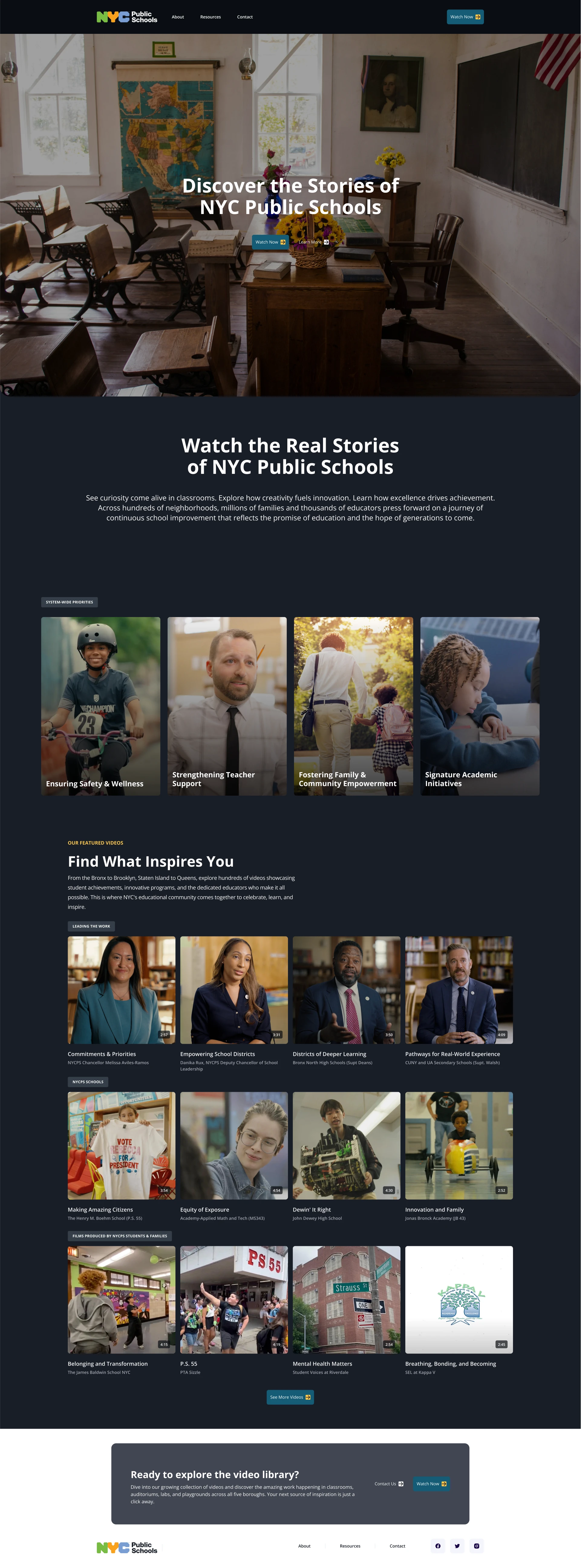 NYCPS wanted a website that showcased the vast amount of video content that they have had produced over the years that highlights the success stories of the schools, students, and families within the school system. Their administrative staff handled the content strategy, while I worked on the overall design strategy and Webflow development.