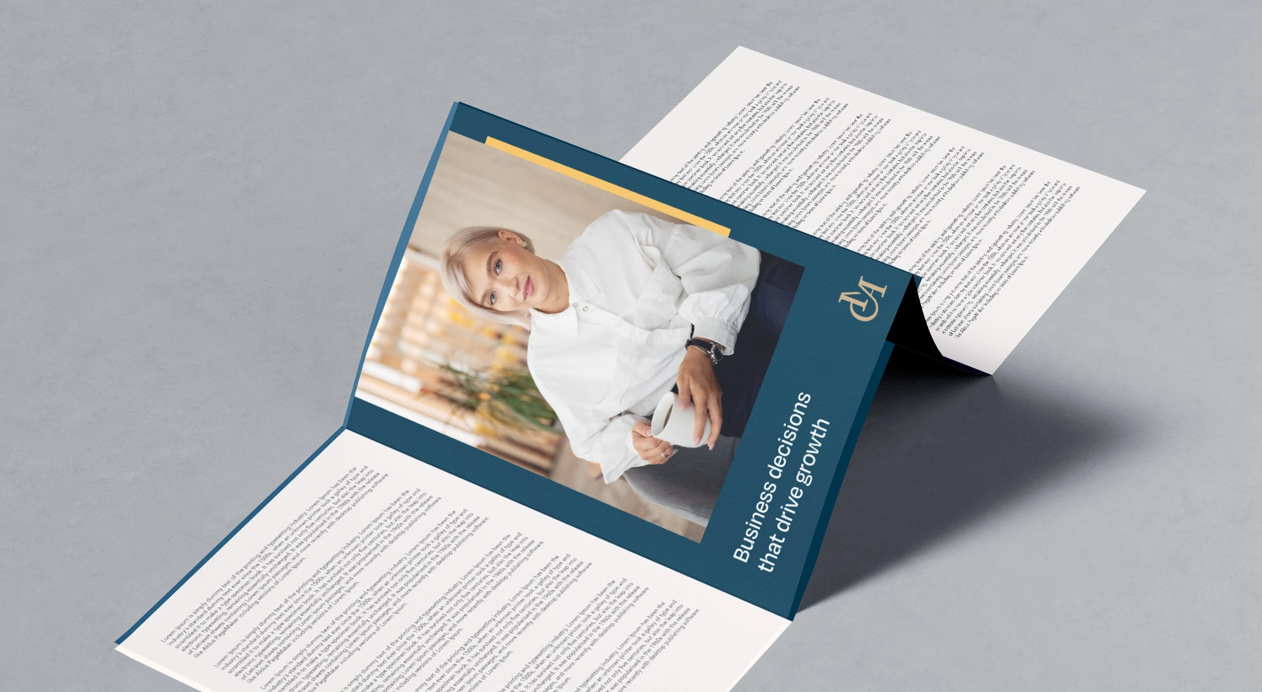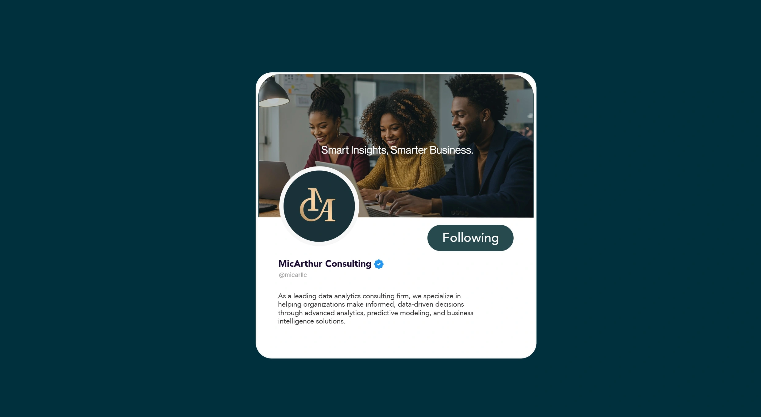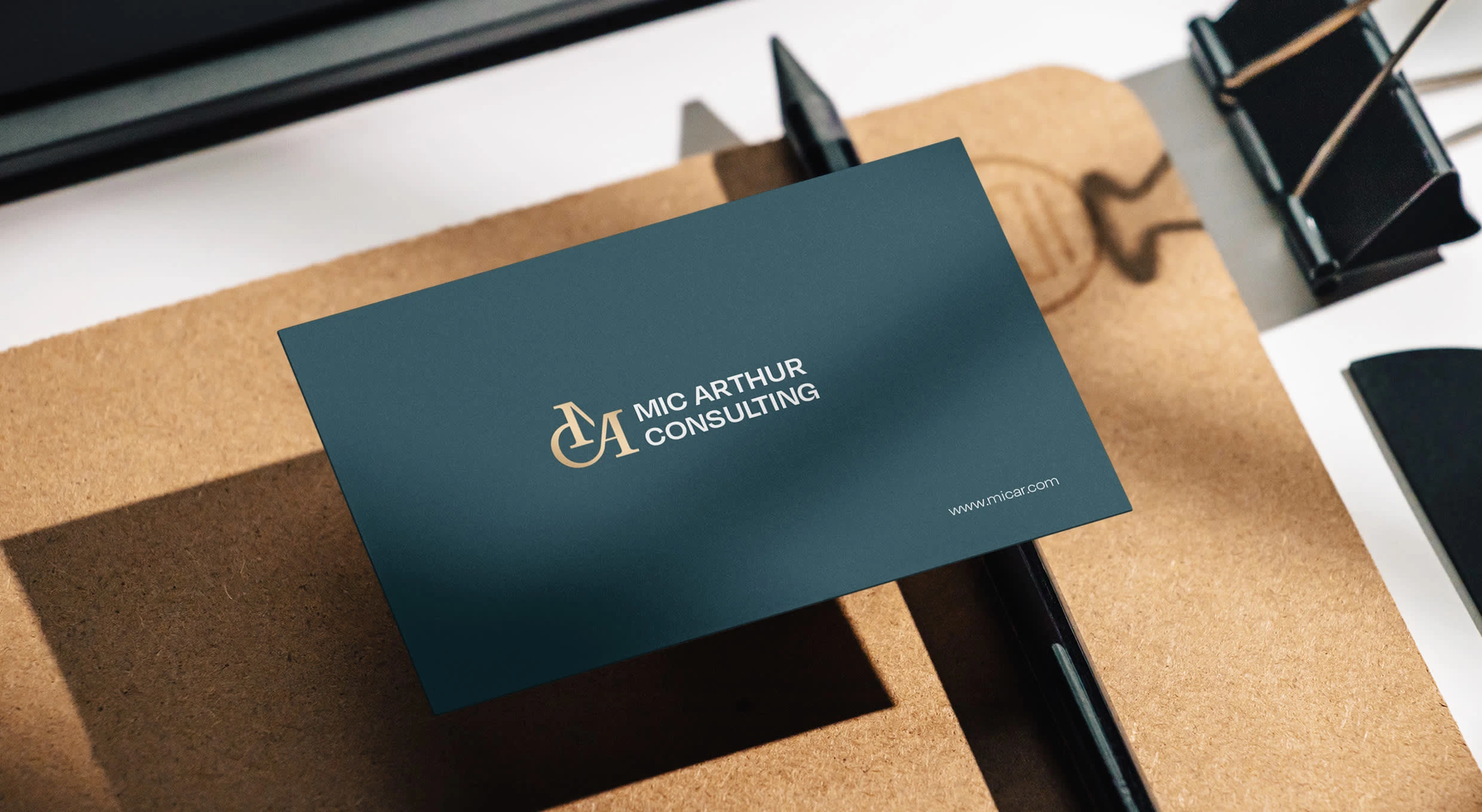 Mic Arthur Consulting needed to differentiate itself from typical data firms. We designed a sleek, timeless monogram logo paired with deep navy and champagne gold, creating a look that feels both professional and premium.