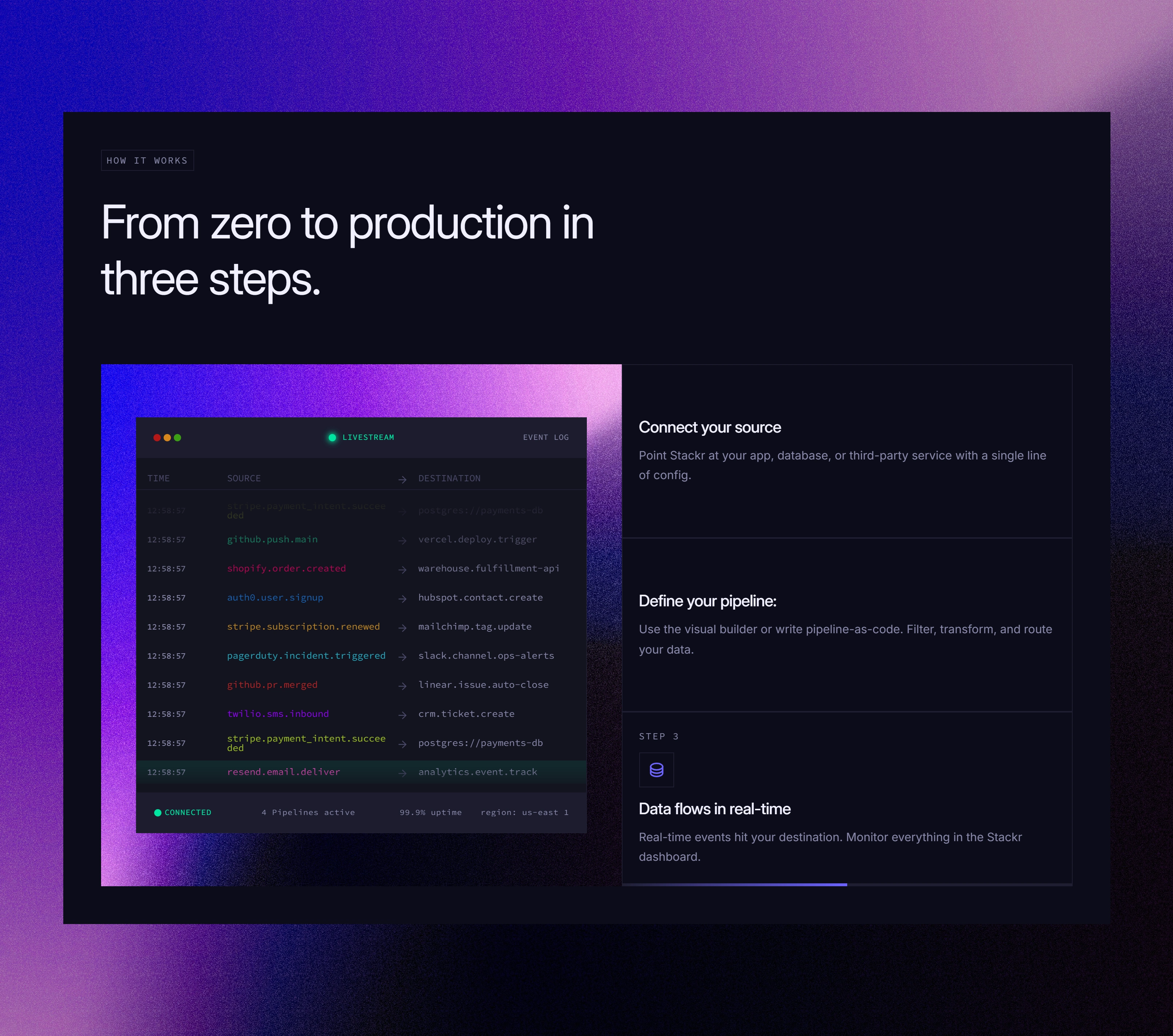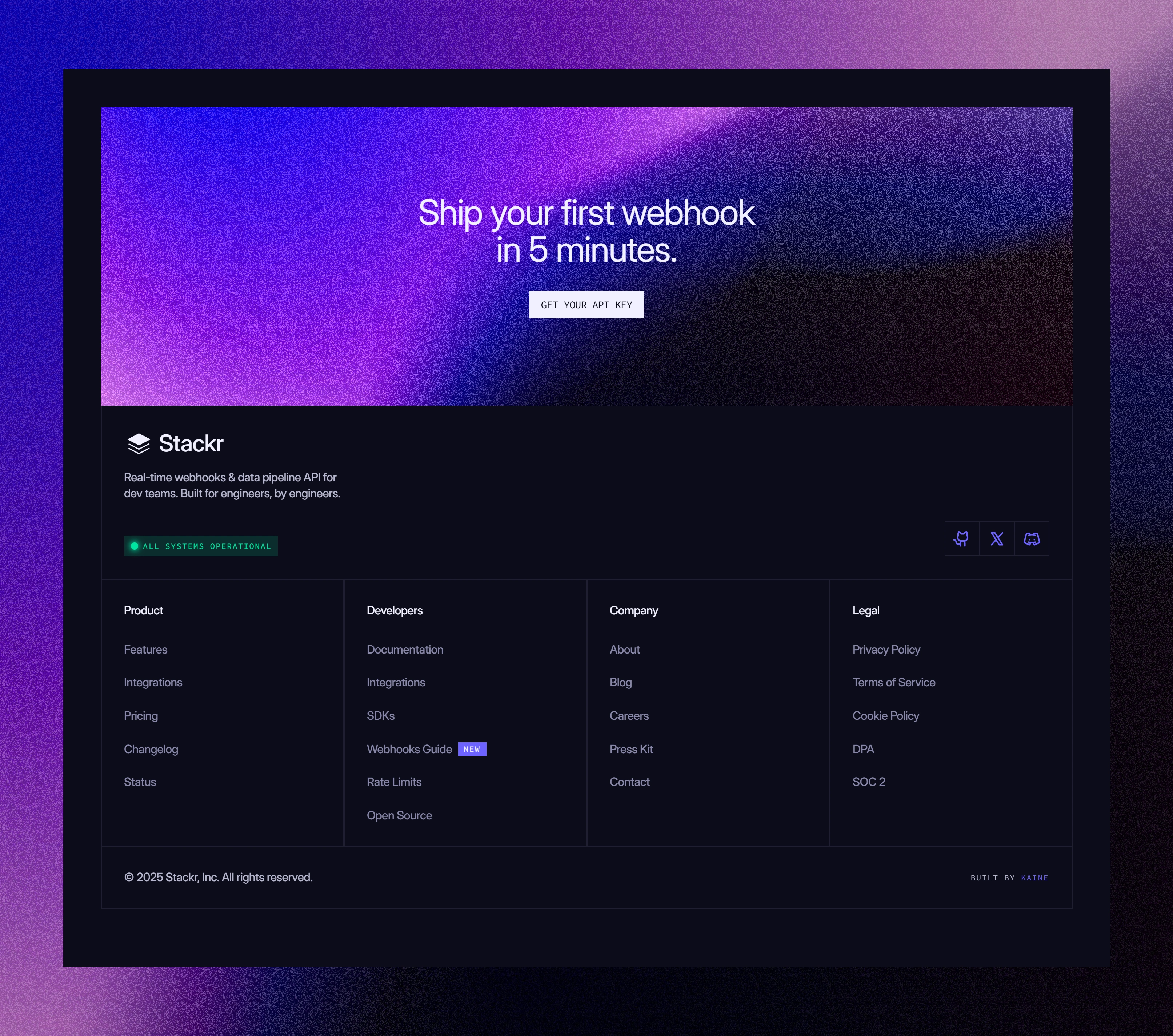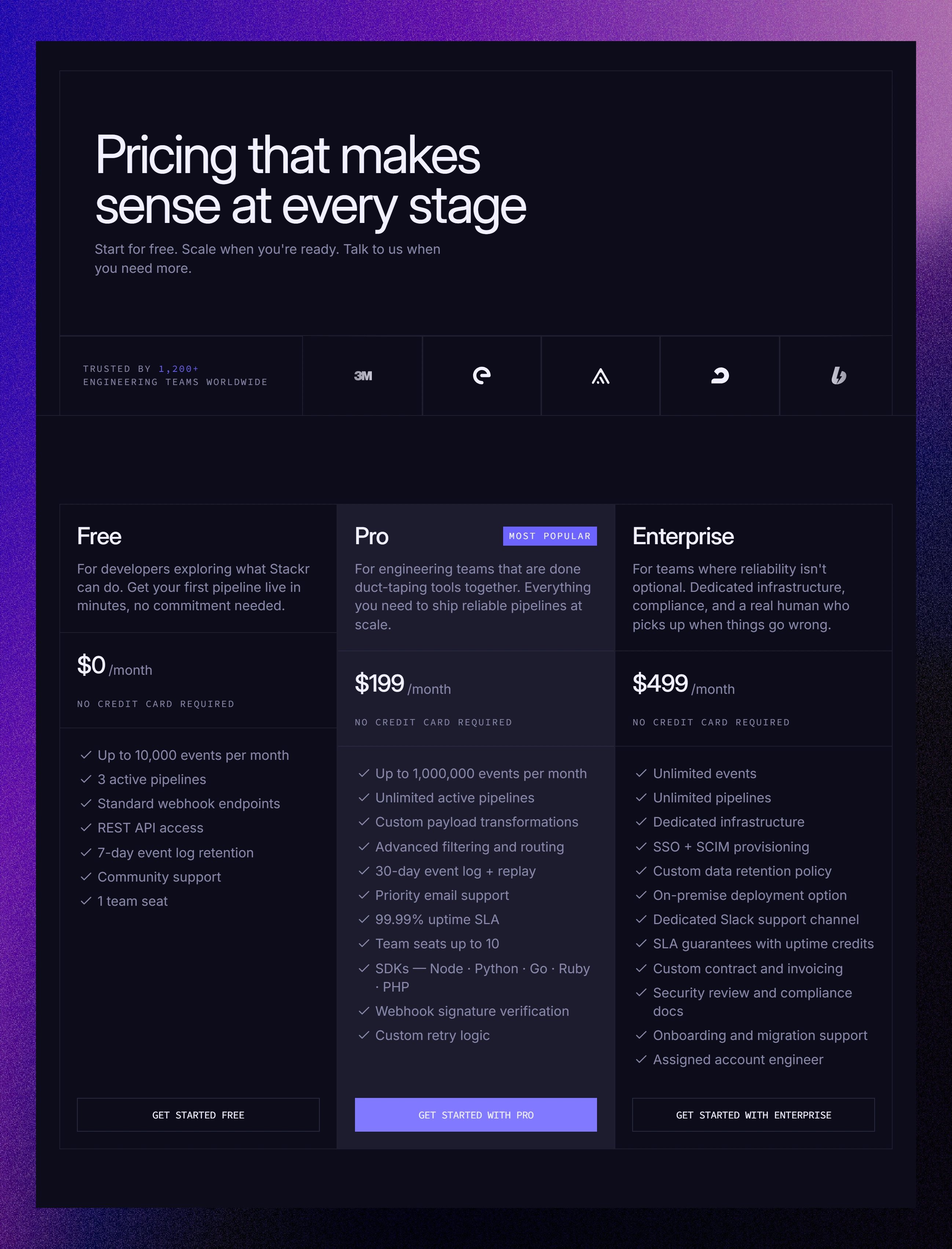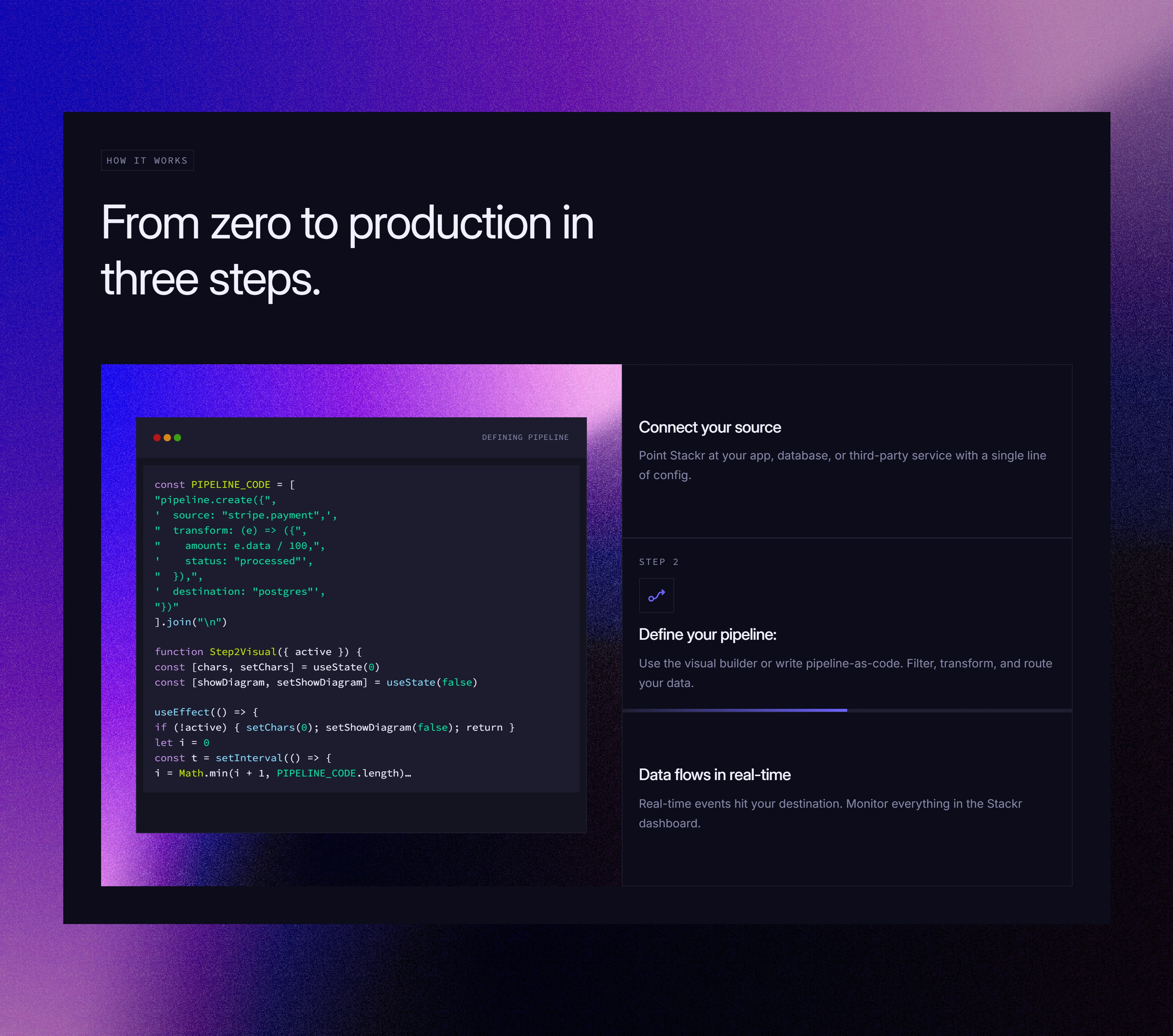 Sharp Edge Design System: Zero border radius throughout the entire site. Every button, card, badge, input, and code block is sharp-edged. This was a deliberate decision; it reinforces the technical, precise aesthetic and differentiates Stackr from the sea of soft, rounded SaaS sites.
