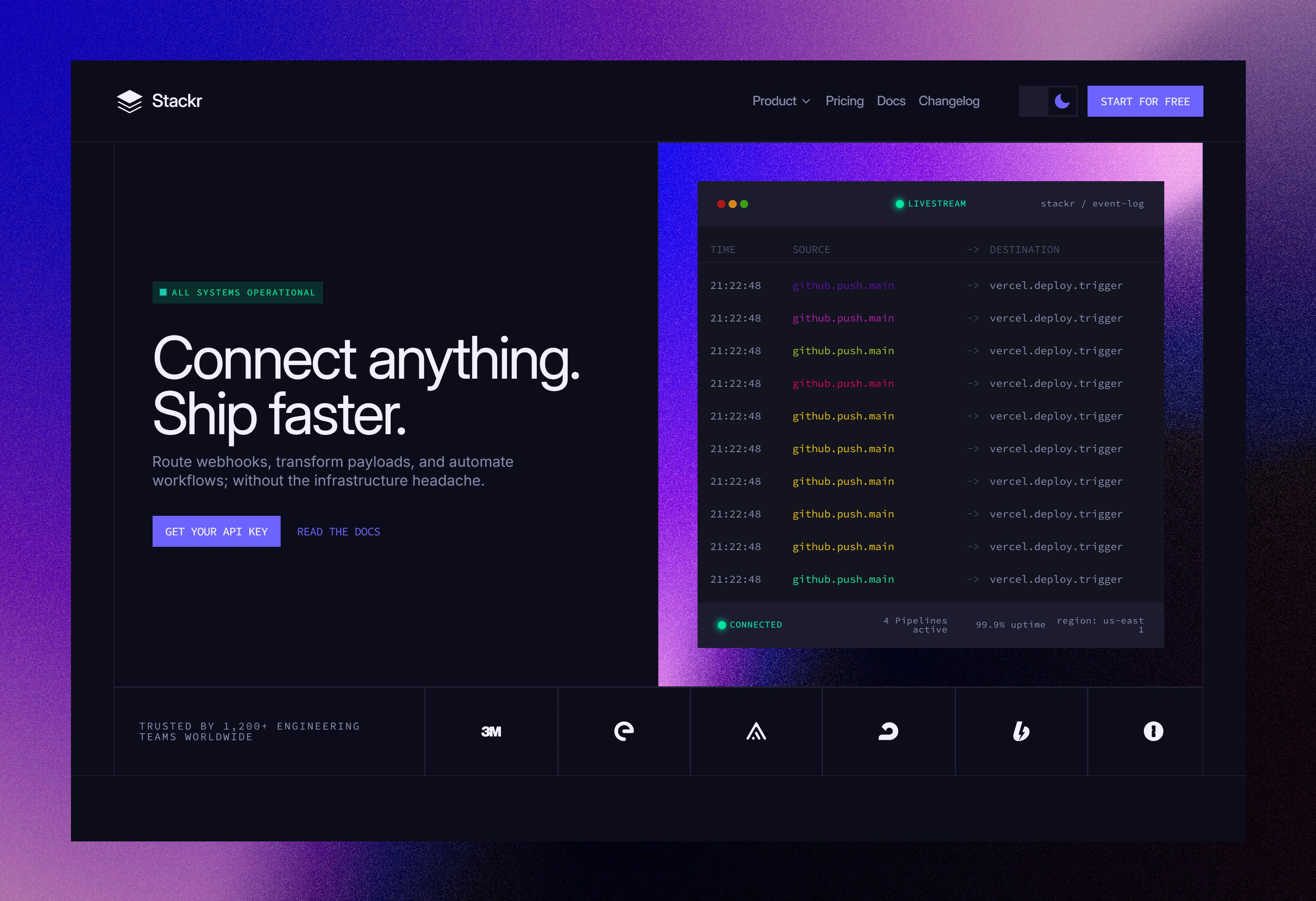 Stackr is a concept spec project, a marketing site for a fictional real-time webhooks and data pipeline API built in Framer. The goal was to design a site that speaks directly to a developer audience: technically credible, visually confident, and fast to navigate. The project demonstrates Framer animation, dark-mode UI, and developer-first design patterns.