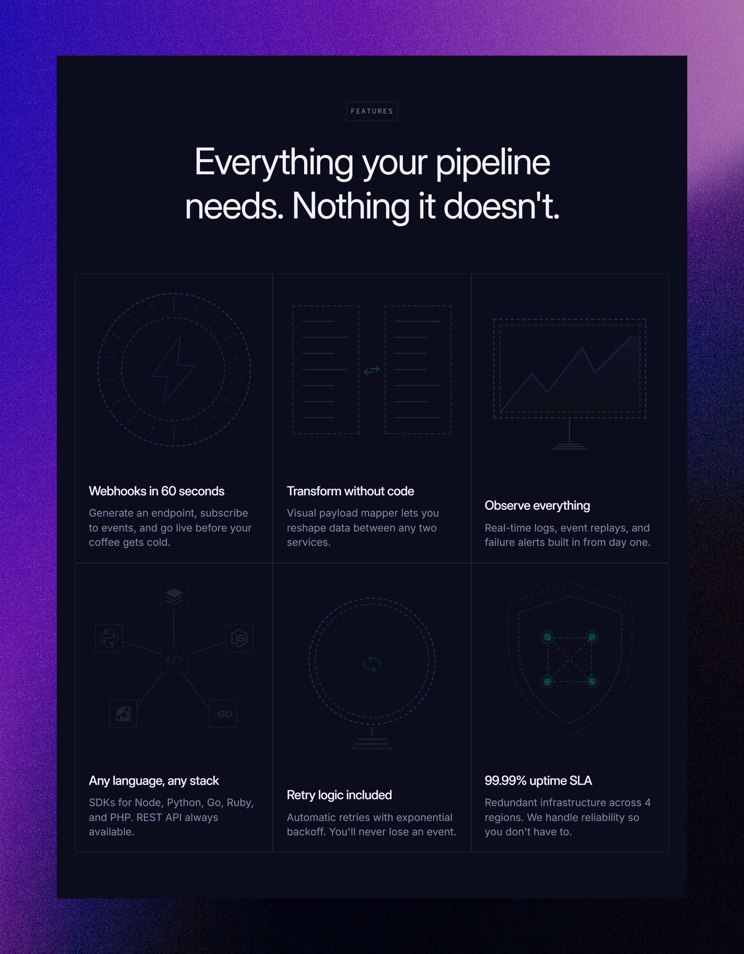 A fully designed marketing site for a fictional real-time webhooks and data pipeline API platform targeting backend engineers and DevOps teams built in Framer