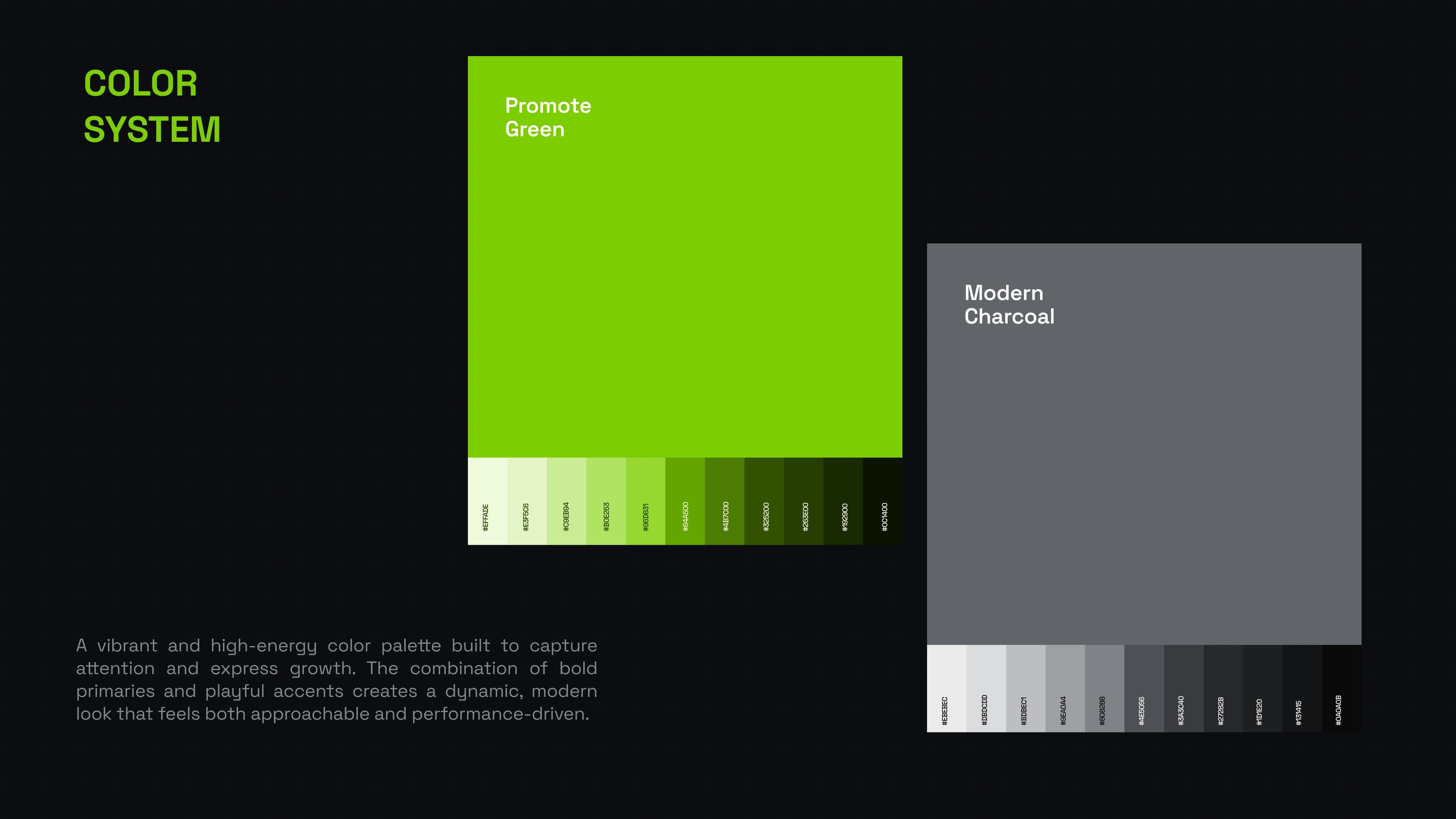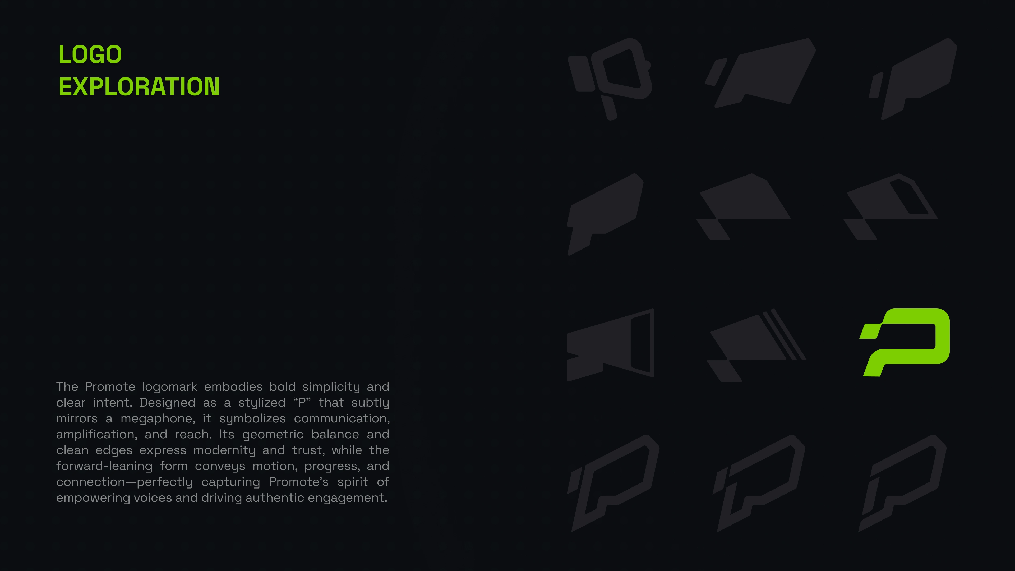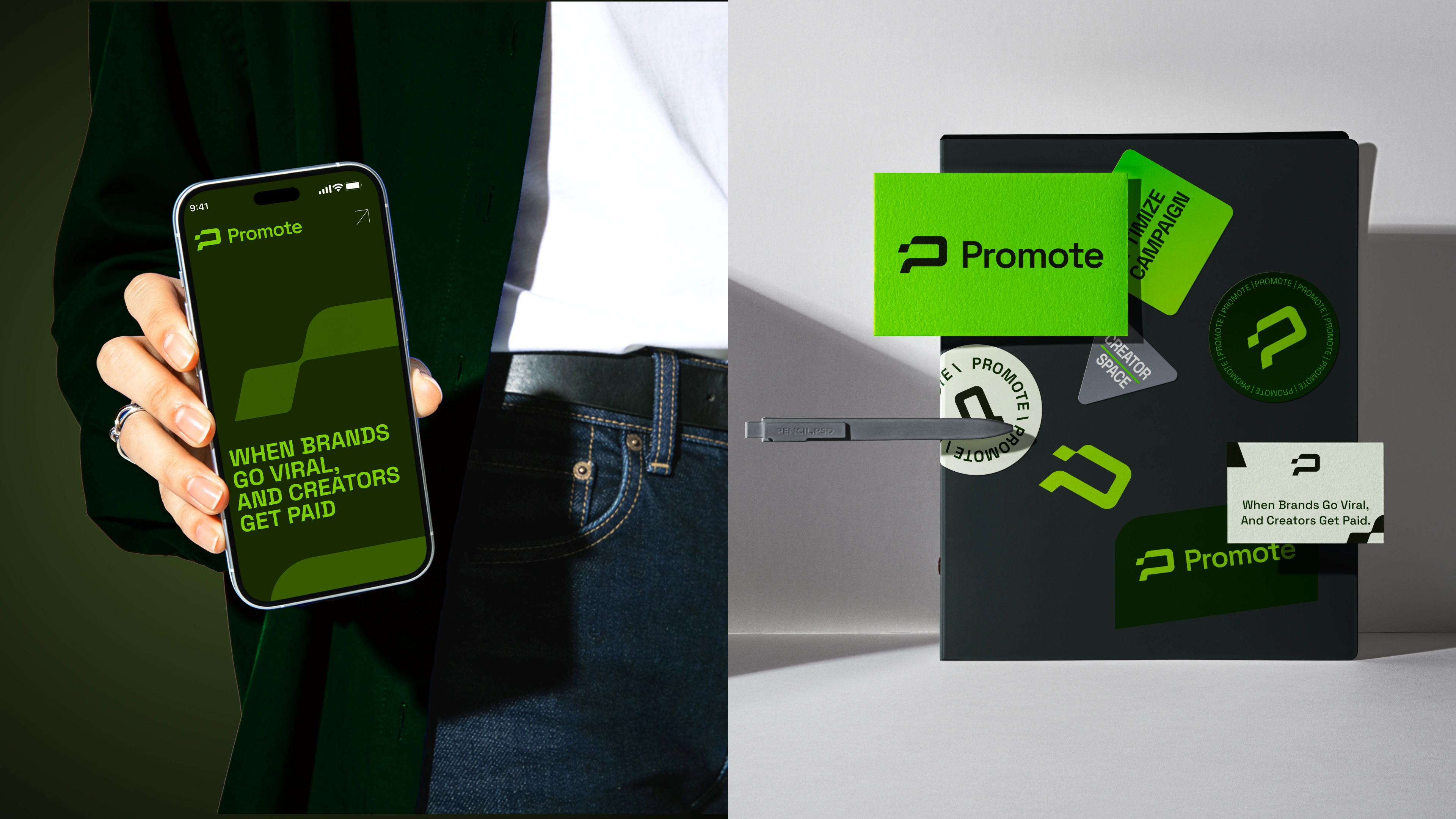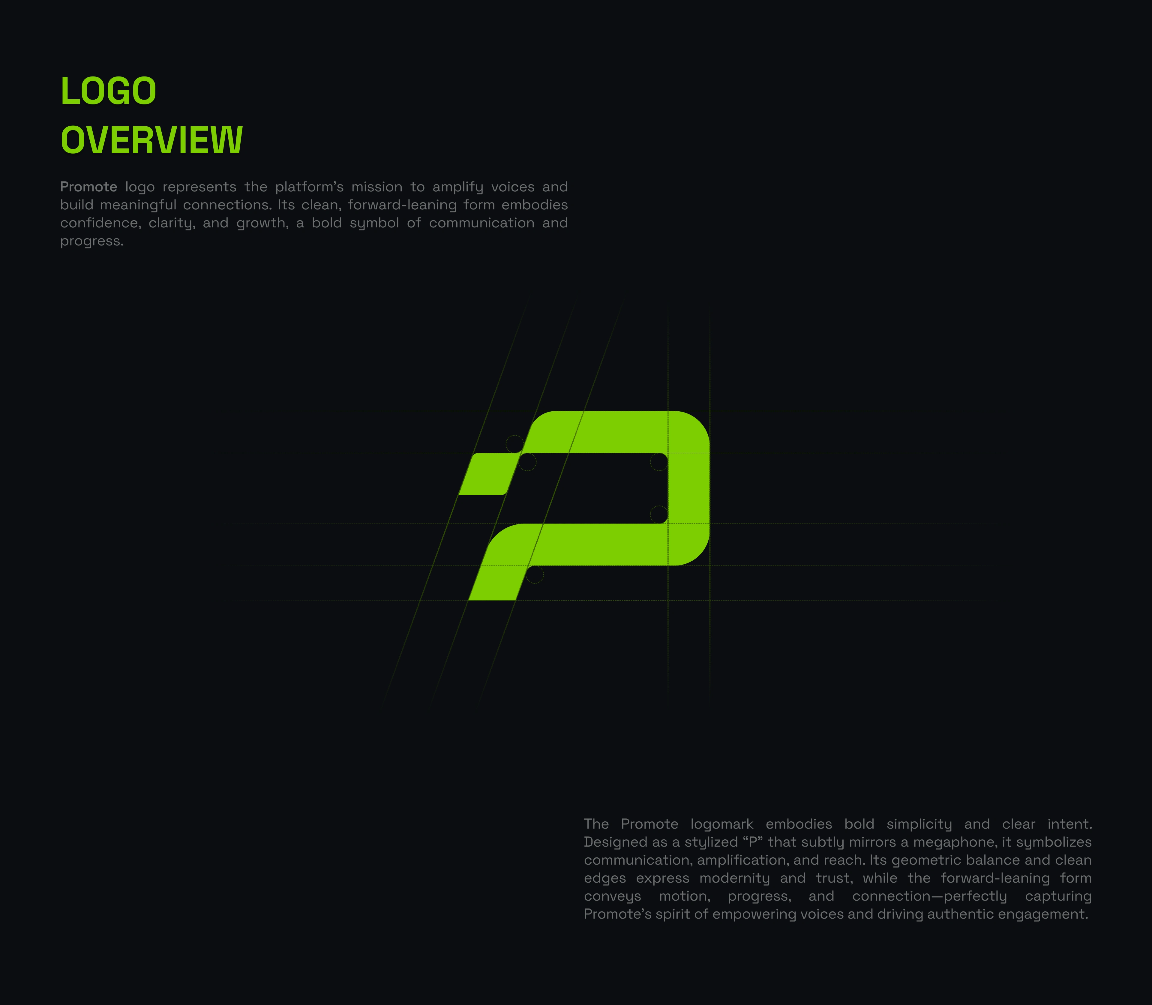 promote.fun in a crowded market. From there, we developed a signature neon green accent palette paired with a dark, minimalist foundation — a deliberate choice to evoke energy and focus rather than sterile professionalism. Space Grotesk was selected as the brand typeface for its geometric clarity and versatility across both display and UI contexts. We built out a full visual system including color rules, typography scales, iconography style, and brand application guidelines to ensure consistency across every touchpoint.