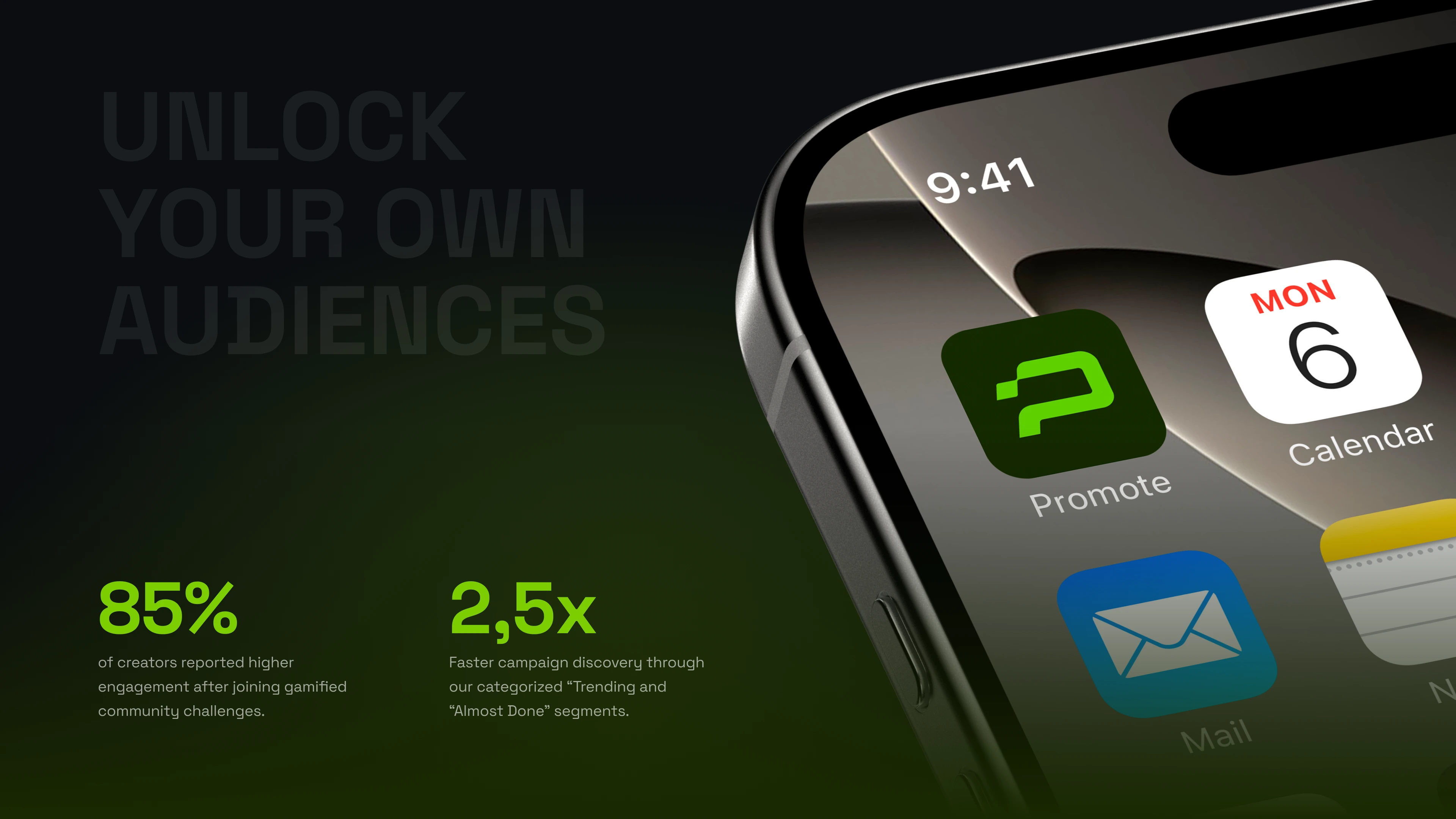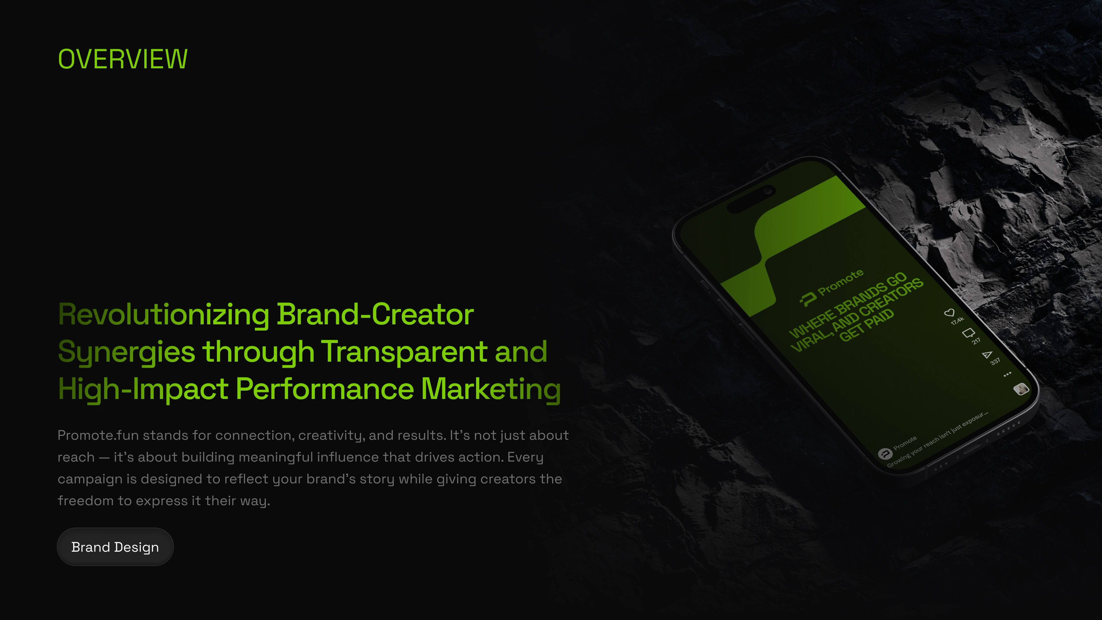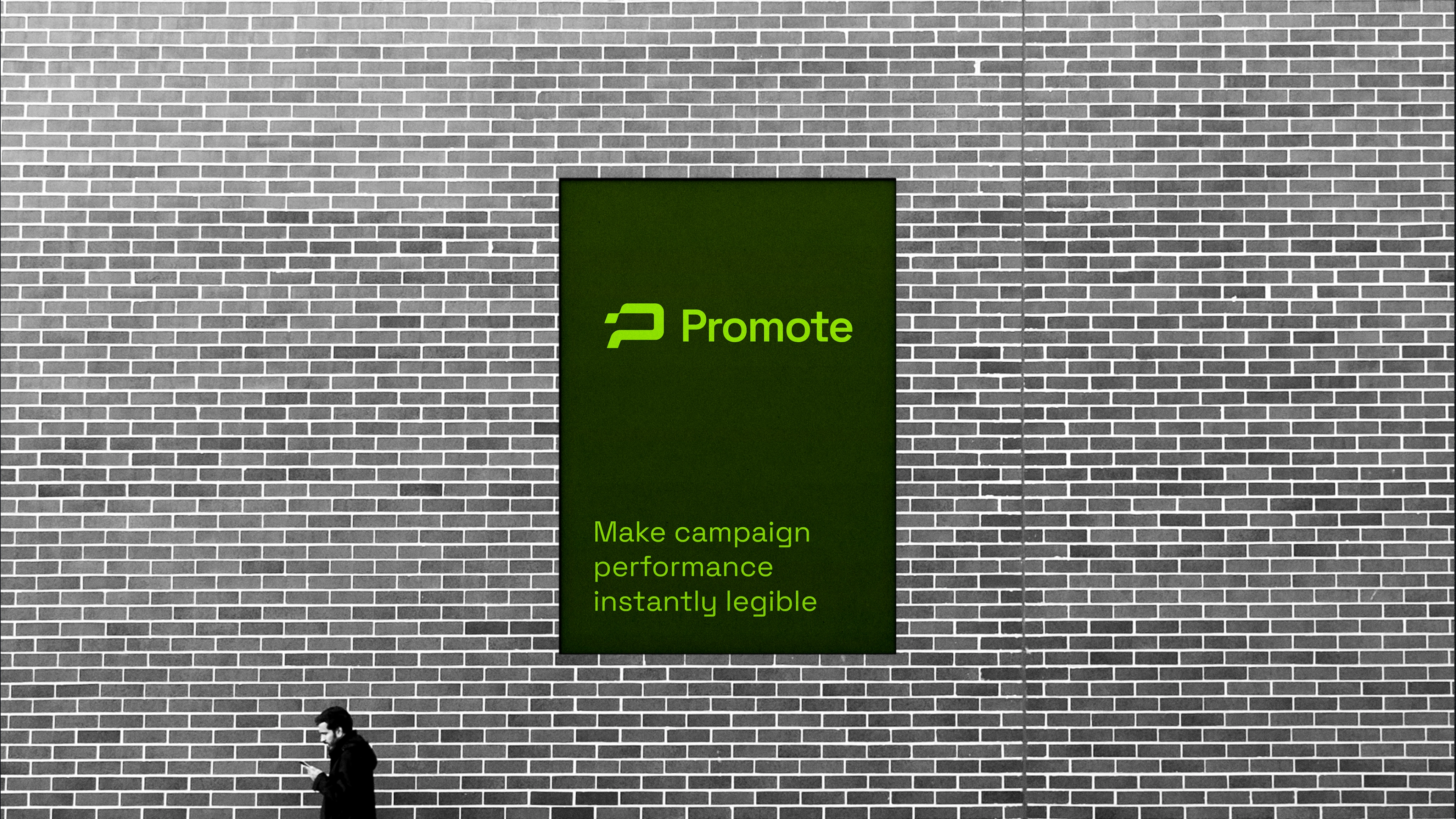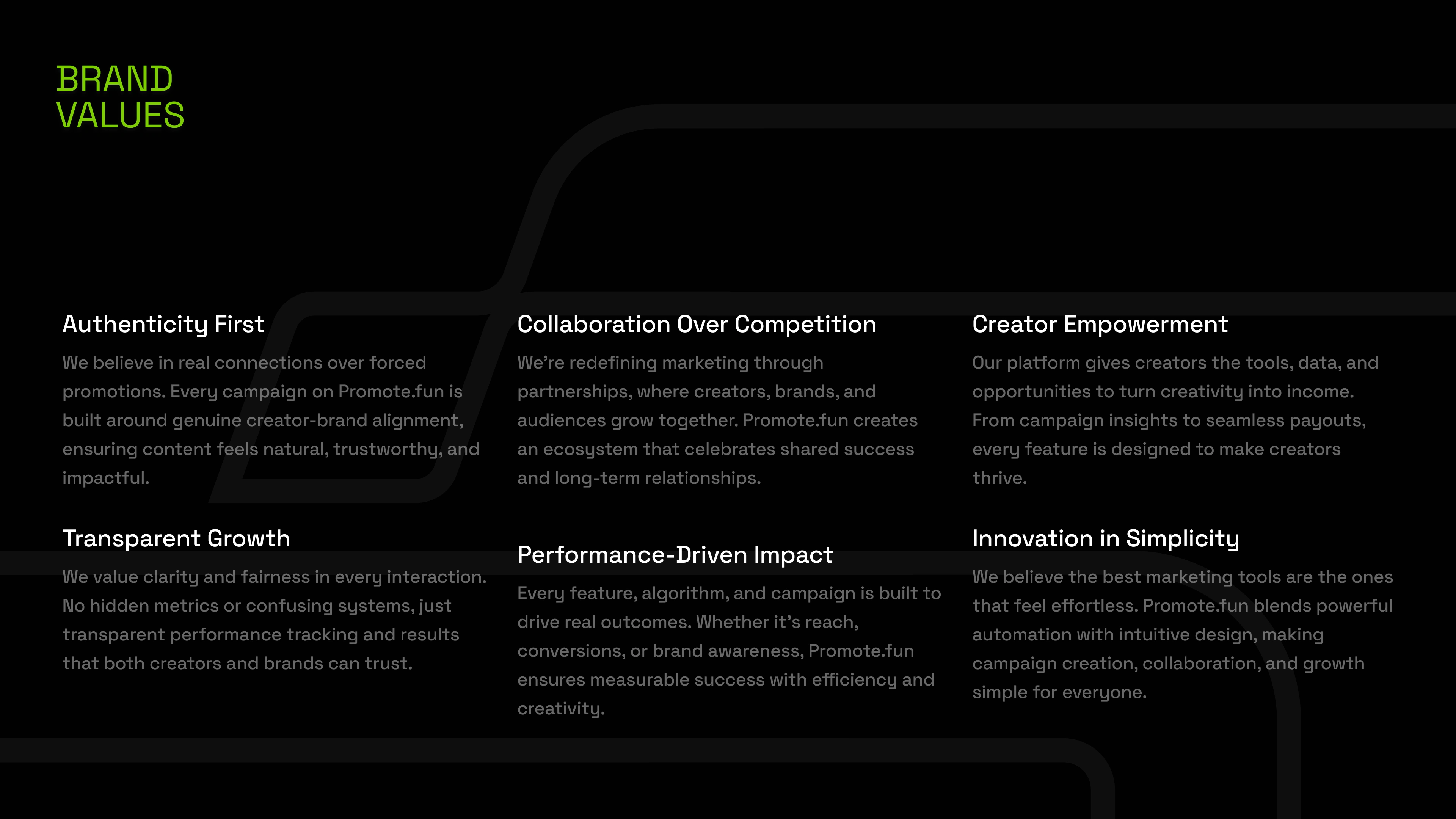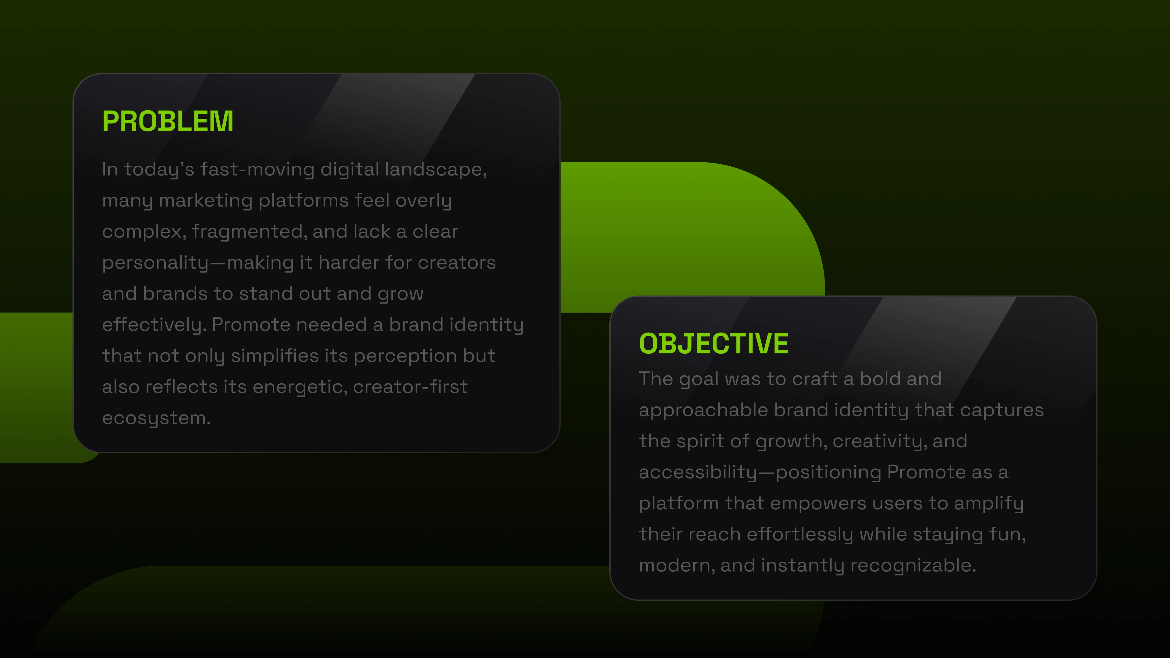 promote.fun in a crowded market. From there, we developed a signature neon green accent palette paired with a dark, minimalist foundation — a deliberate choice to evoke energy and focus rather than sterile professionalism. Space Grotesk was selected as the brand typeface for its geometric clarity and versatility across both display and UI contexts. We built out a full visual system including color rules, typography scales, iconography style, and brand application guidelines to ensure consistency across every touchpoint.