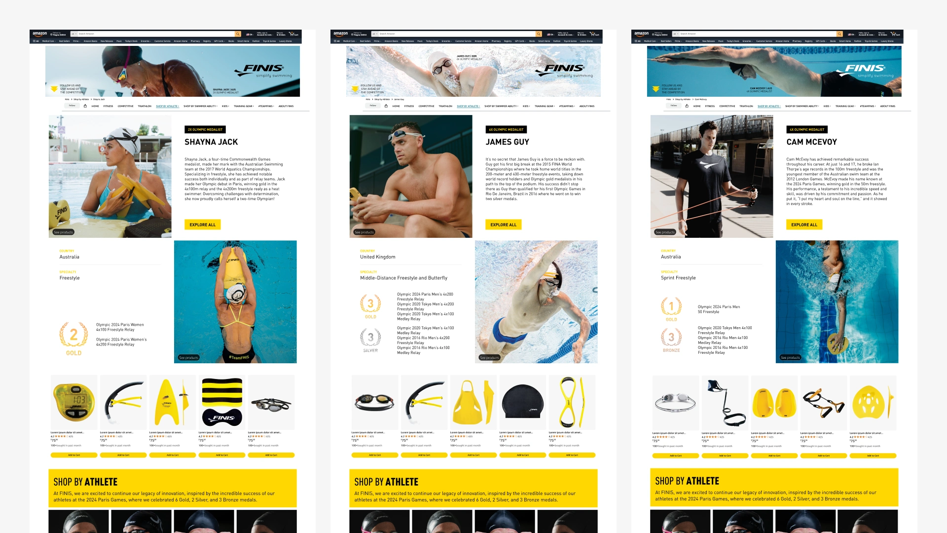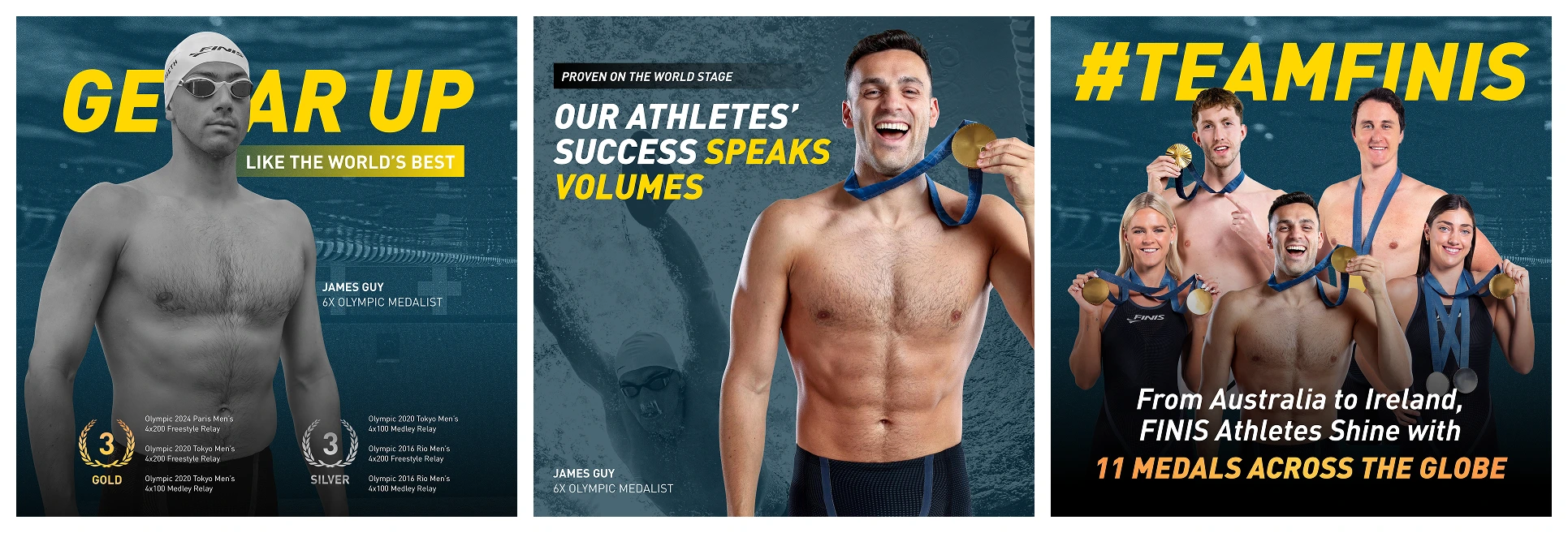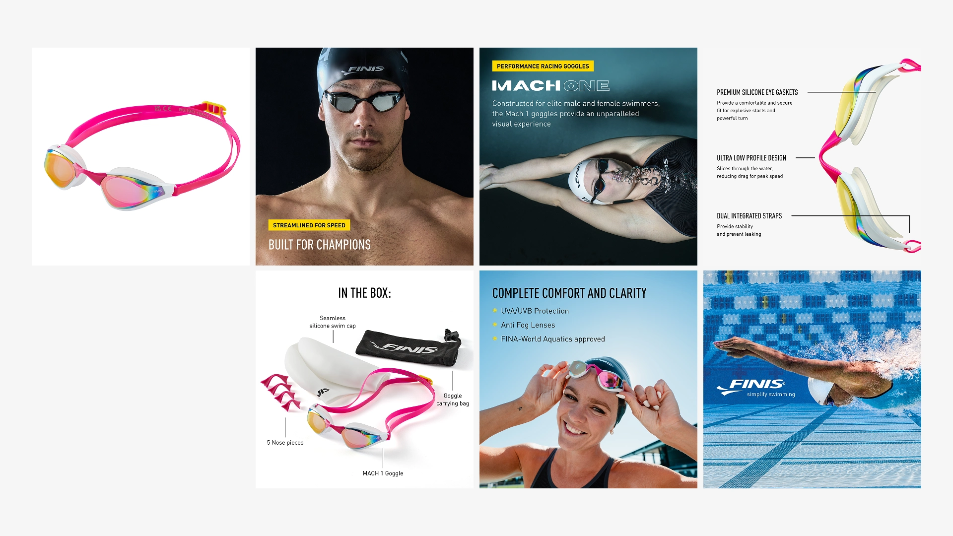 FINIS wanted to update some of their Amazon creatives, inspired by the incredible success of their athletes at the 2024 Paris Games, where they celebrated 6 Gold, 2 Silver, and 3 Bronze medals. Alongside this, is the launch of their new products—Mach One Racing Goggles and Floatie Friends.